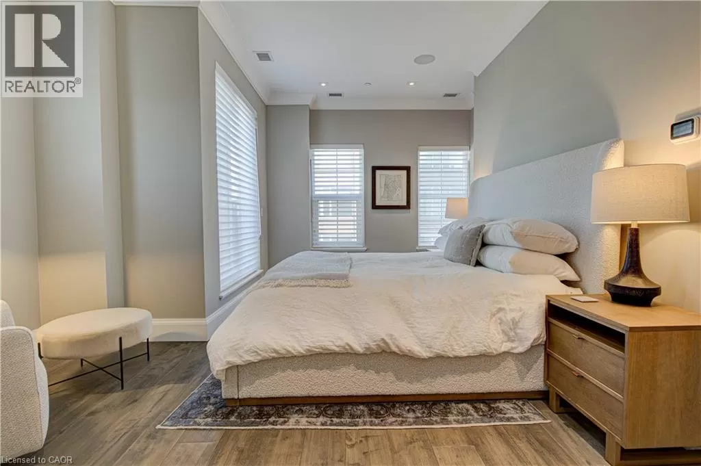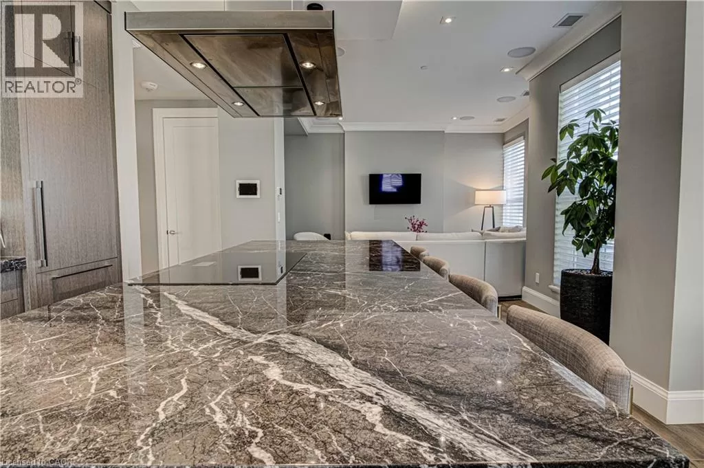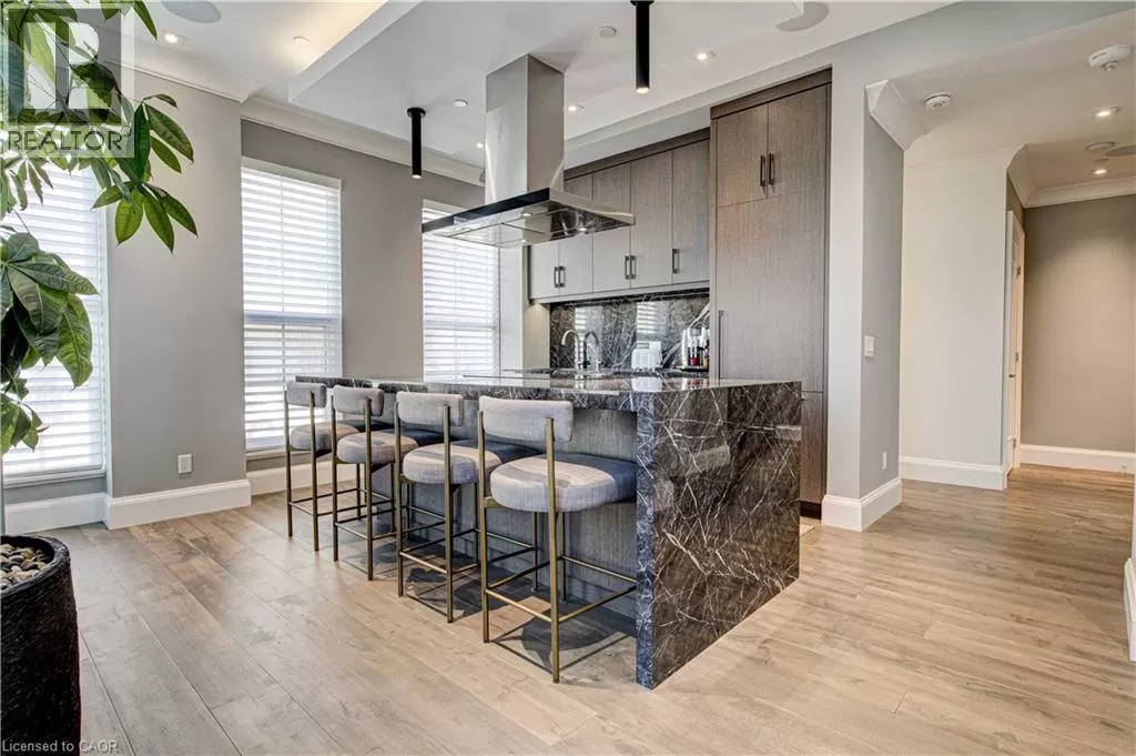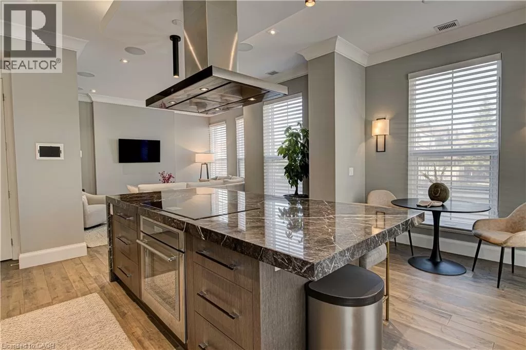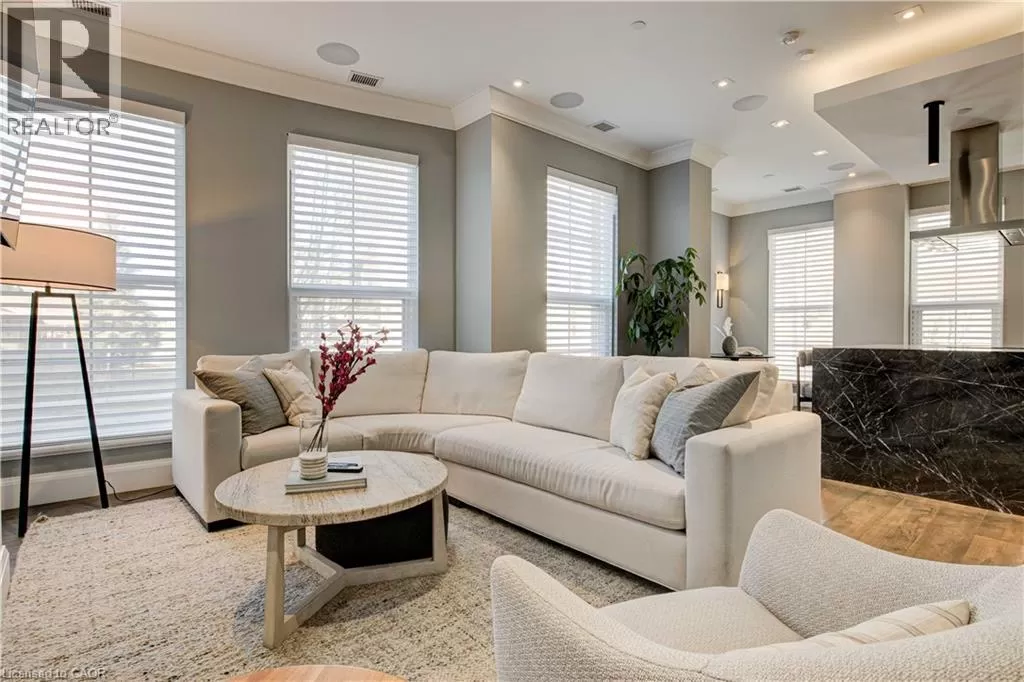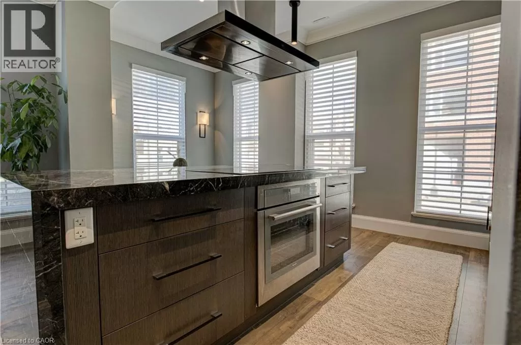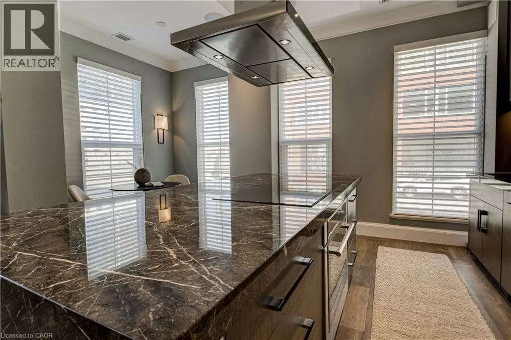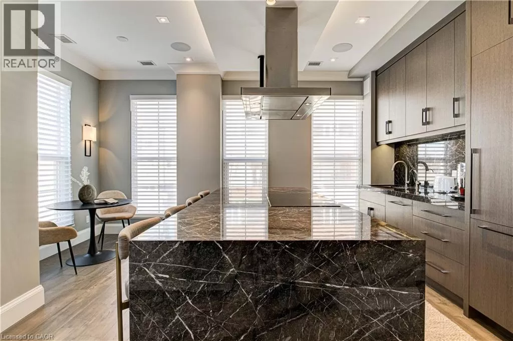 Corner of Allen St W and Caroline St S. In the heart of Uptown Waterloo, this 3-bedroom, 4.5 bathroom executive townhome at 155 Caroline Street offers an exceptional blend of contemporary design and timeless sophistication. Thoughtfully enhanced with over $300,000 in bespoke upgrades, this residence is defined by its attention to detail, expansive room sizes and quality finishes. Wide-plank hardwood floors, soaring ceilings, and oversized windows with custom window coverings create a sense of airy elegance throughout. The open-concept kitchen is both striking and functional, complete with professional-grade stainless steel appliances, European-inspired cabinetry, exotic marble countertops, and a statement waterfall island. The adjoining dining area is perfectly suited for morning coffee and cozy evening dinners. Occupying the entire third floor, the expansive primary suite offers an indulgent retreat with a reading area, pass-through dressing area with custom built-ins, dual 3-piece ensuitesâone with a deep soaking tub and custom shower and the other with dual sinks and toilet space providing separation for morning preparations. Two additional bedrooms, each with their own spa-like ensuites and generous closet space, provide comfort and privacy for guests or family. The finished lower level is designed with practicality in mind, featuring a mudroom, laundry area, powder room, direct garage access, an elevator, and ample storage. Additional features include secure 3-car underground parking, a private, in suite elevator servicing all levels, 2 lockers, and thoughtfully integrated storage throughout. All this, steps from the city's best dining, shopping, and cultural destinations, with effortless access to major routes and everyday conveniences. An exceptional residence where sophisticated urban living meets elevated comfort. (id:27476)