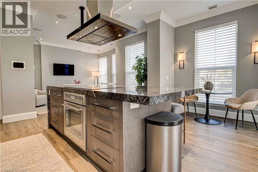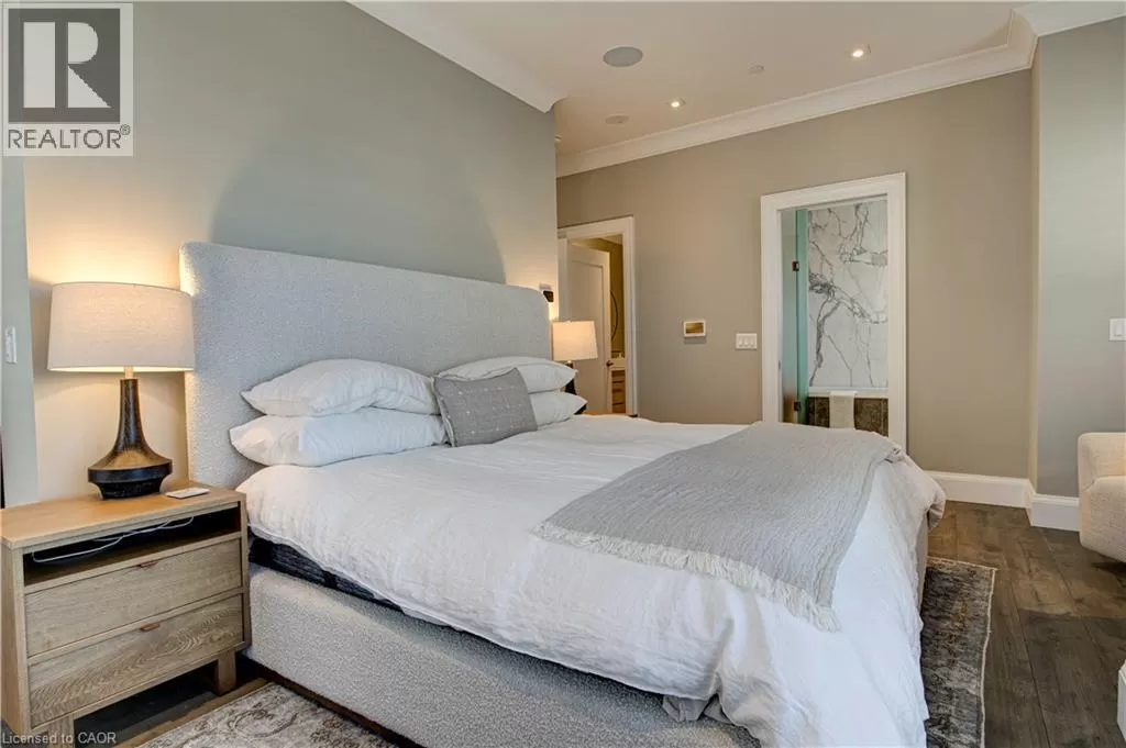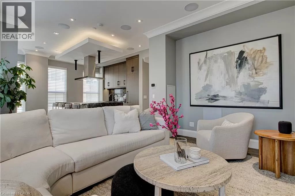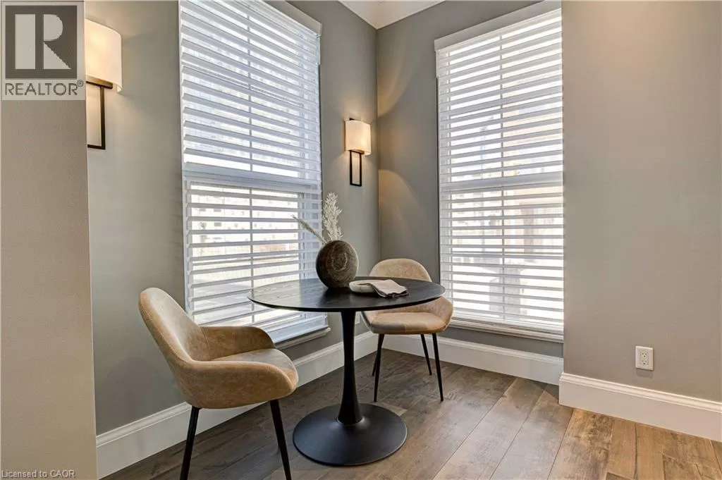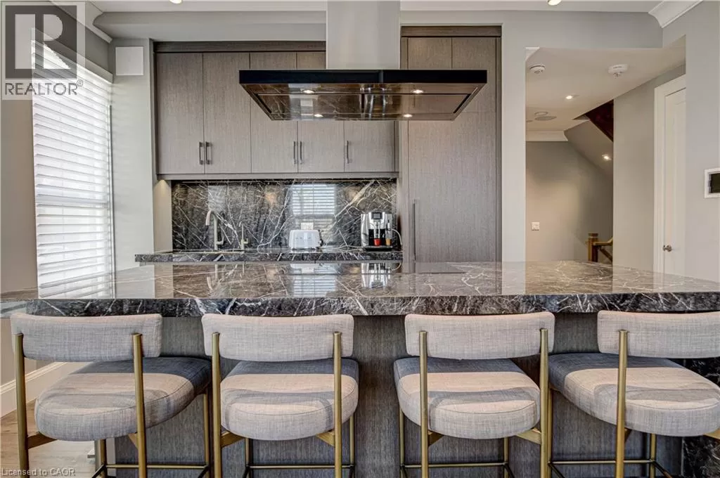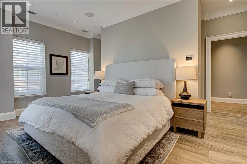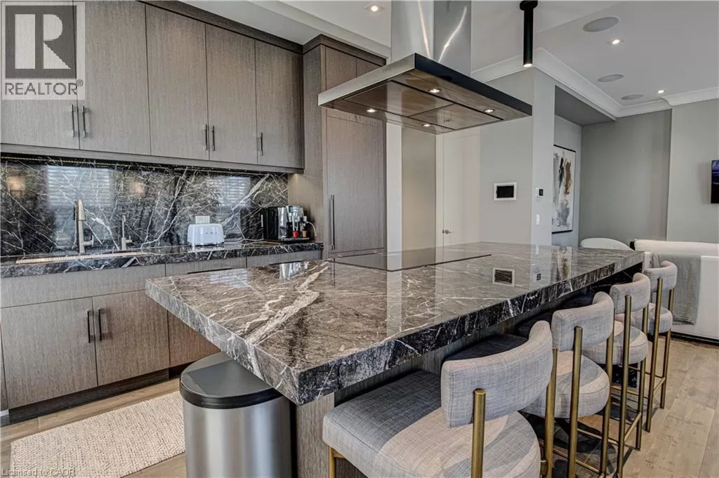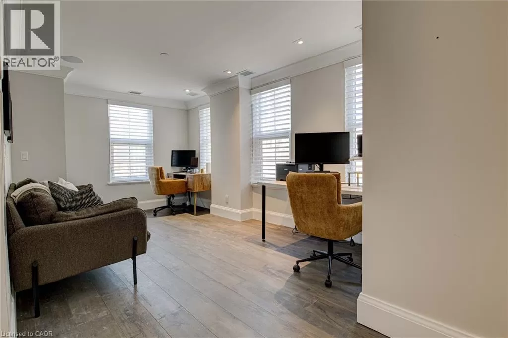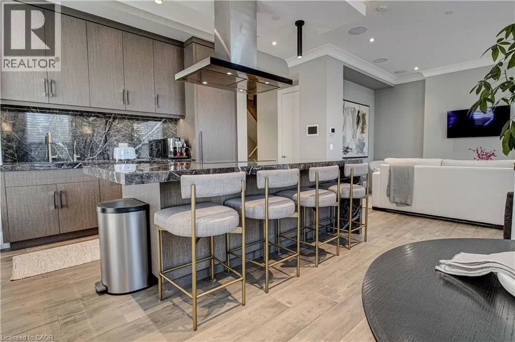 Corner of Allen St W and Caroline St S. In the heart of Uptown Waterloo, this 3-bedroom, 4.5 bathroom executive townhome at 155 Caroline Street offers an exceptional blend of contemporary design and timeless sophistication. Thoughtfully enhanced with over $300,000 in bespoke upgrades, this residence is defined by its attention to detail, expansive room sizes and quality finishes. Wide-plank hardwood floors, soaring ceilings, and oversized windows with custom window coverings create a sense of airy elegance throughout. The open-concept kitchen is both striking and functional, complete with professional-grade stainless steel appliances, European-inspired cabinetry, exotic marble countertops, and a statement waterfall island. The adjoining dining area is perfectly suited for morning coffee and cozy evening dinners. Occupying the entire third floor, the expansive primary suite offers an indulgent retreat with a reading area, pass-through dressing area with custom built-ins, dual 3-piece ensuitesâone with a deep soaking tub and custom shower and the other with dual sinks and toilet space providing separation for morning preparations. Two additional bedrooms, each with their own spa-like ensuites and generous closet space, provide comfort and privacy for guests or family. The finished lower level is designed with practicality in mind, featuring a mudroom, laundry area, powder room, direct garage access, an elevator, and ample storage. Additional features include secure 3-car underground parking, a private, in suite elevator servicing all levels, 2 lockers, and thoughtfully integrated storage throughout. All this, steps from the city's best dining, shopping, and cultural destinations, with effortless access to major routes and everyday conveniences. An exceptional residence where sophisticated urban living meets elevated comfort. (id:27476)