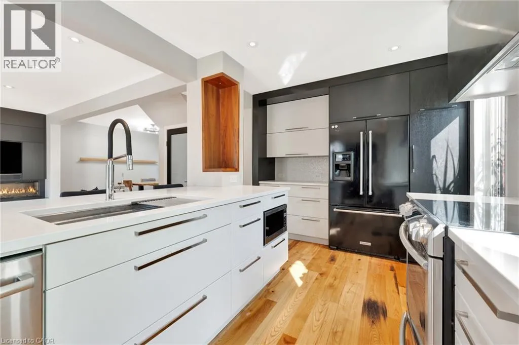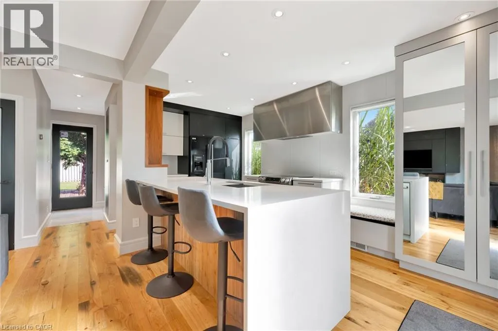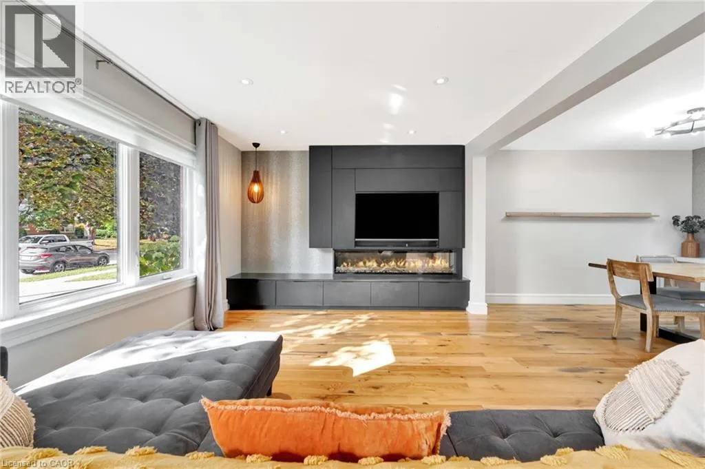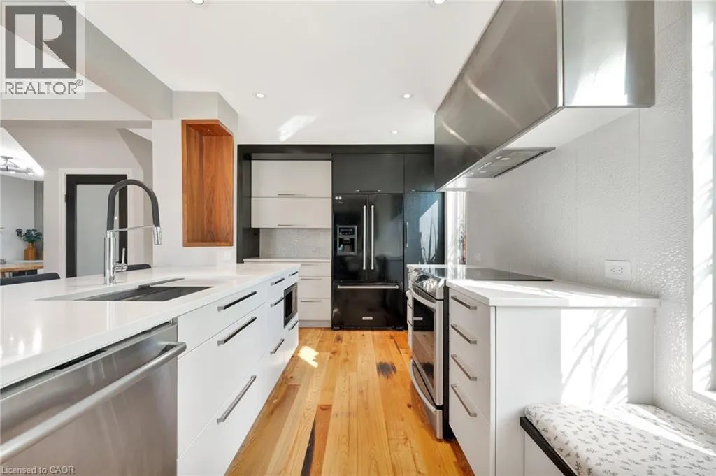 Margaret Ave S to Pinewood Pl Welcome to 254 Pinewood Place, Waterloo - A Fully Renovated Brick Beauty in a Prime Location Near Breithaupt Park! Tucked away on a quiet street in one of Waterlooâs most desirable neighbourhoods, this stylish 2- bedroom, 2-bathroom home is just a short walk to Breithaupt Park, scenic trails, shopping, schools, and minutes from Uptown Waterloo and Highway 7. The location offers the perfect blend of walkability and convenience, all within a peaceful, family-friendly setting. Inside, youâll be impressed by the bright, open-concept main floor featuring hardwood flooring (2017), pot lights, and a striking 74 linear electric fireplace. The custom kitchen, fully renovated in 2017, includes a large island with waterfall edge, galley sink, modern cabinetry, upgraded quartz countertops, a built-in fridge and stove, and a statement range hood all designed with both functionality and style in mind. Upstairs offers two updated bedrooms with windows replaced in 2017 and extra storage. The finished basement provides even more living space with a spacious rec room and updated three-piece bathroom. Additional upgrades include a new roof and eaves on the home (2018), new roof and siding on the detached garage (2018/2017), garage doors (2016), updated bathrooms (2016/17), a new air conditioner (2017), owned water heater (2017), water softener (2016), new insulation in the walls and rim joist (2017), and heated floors at the rear entry. Washer and dryer were also replaced in 2017. Step outside to a large deck perfect for entertaining, a fully fenced backyard ideal for kids or pets, and a detached garage offering great storage or hobby space. This is a truly move-in-ready home with every detail thoughtfully updated. Donât miss your opportunity to own this exceptional property in a prime Waterloo location! (id:27476)