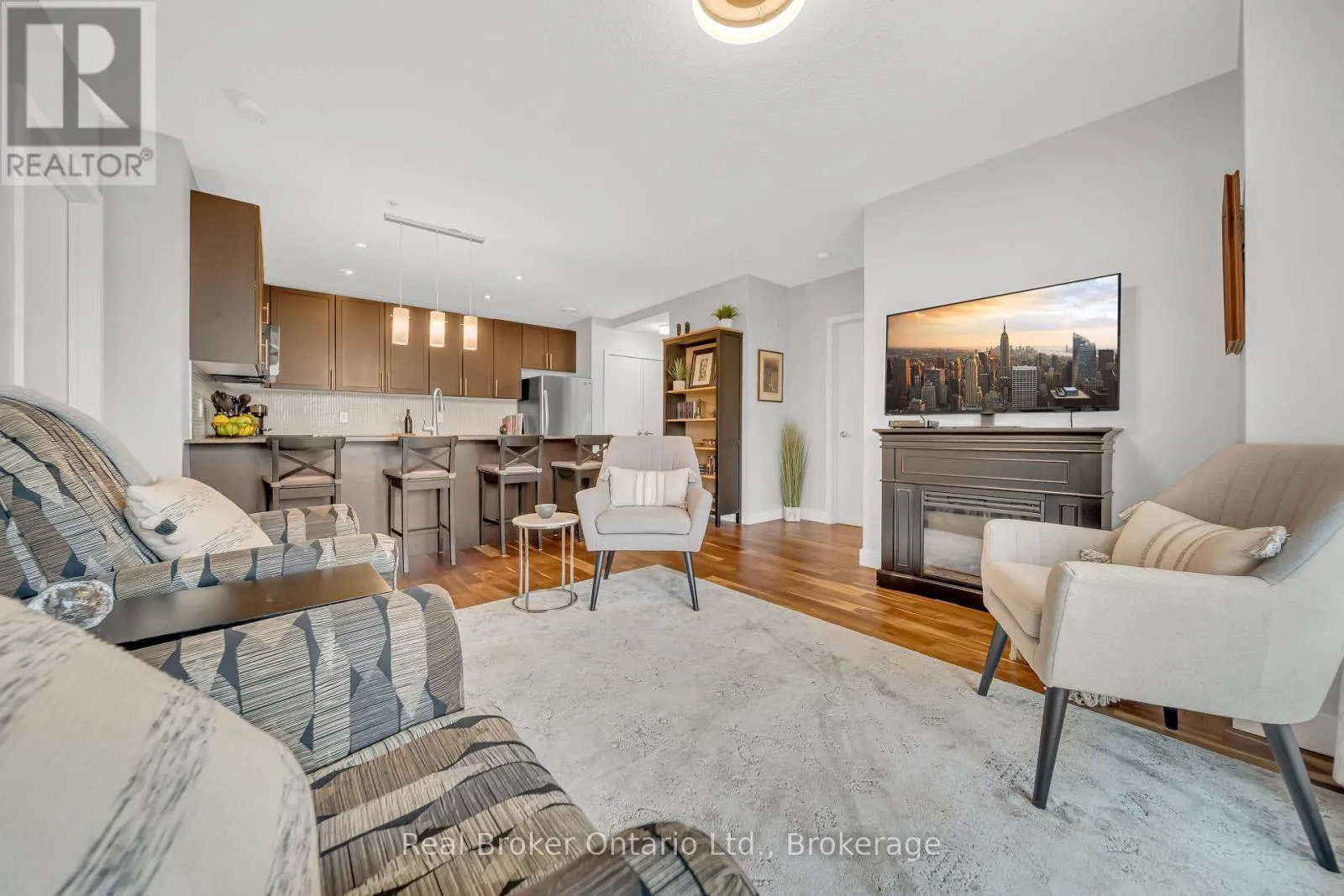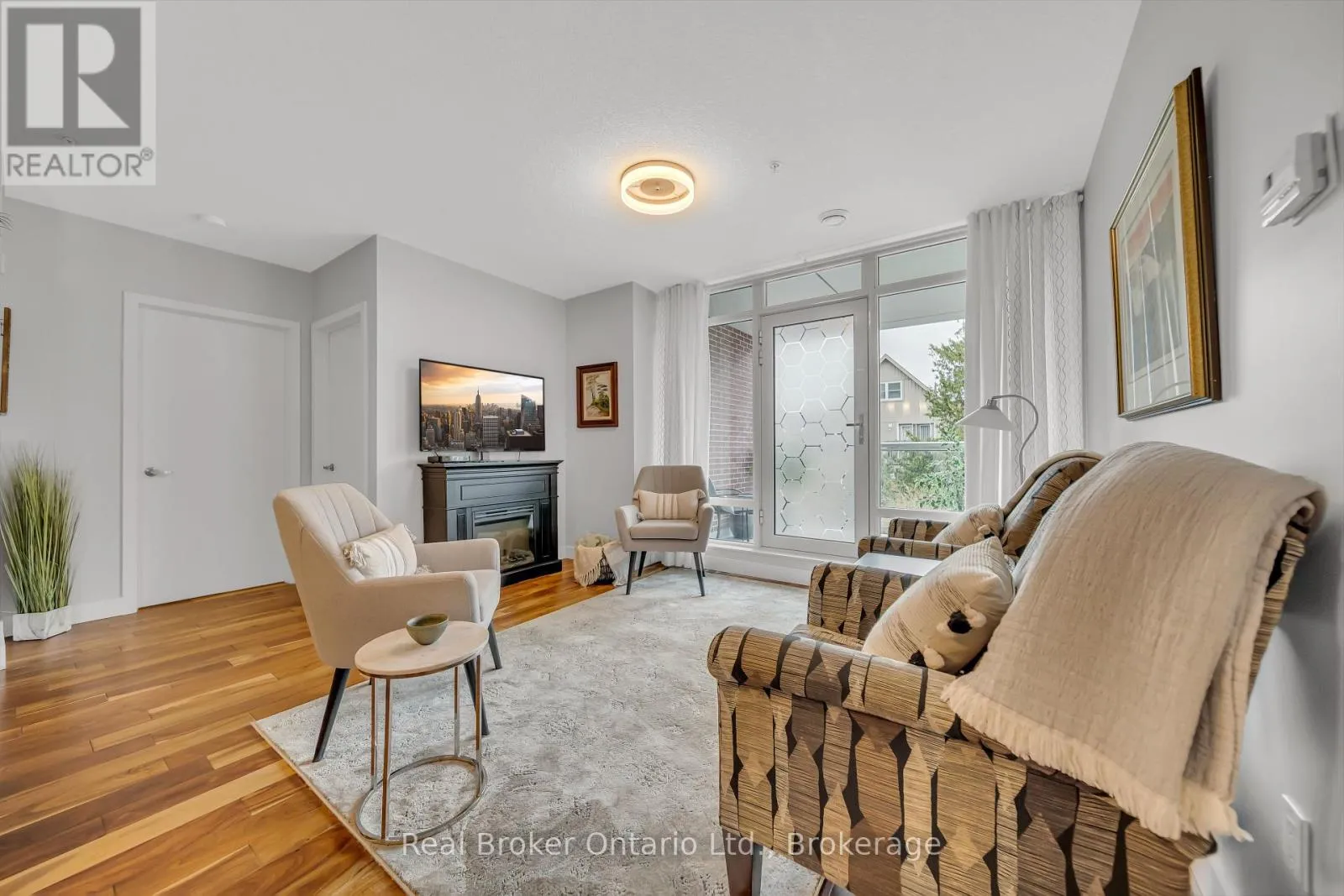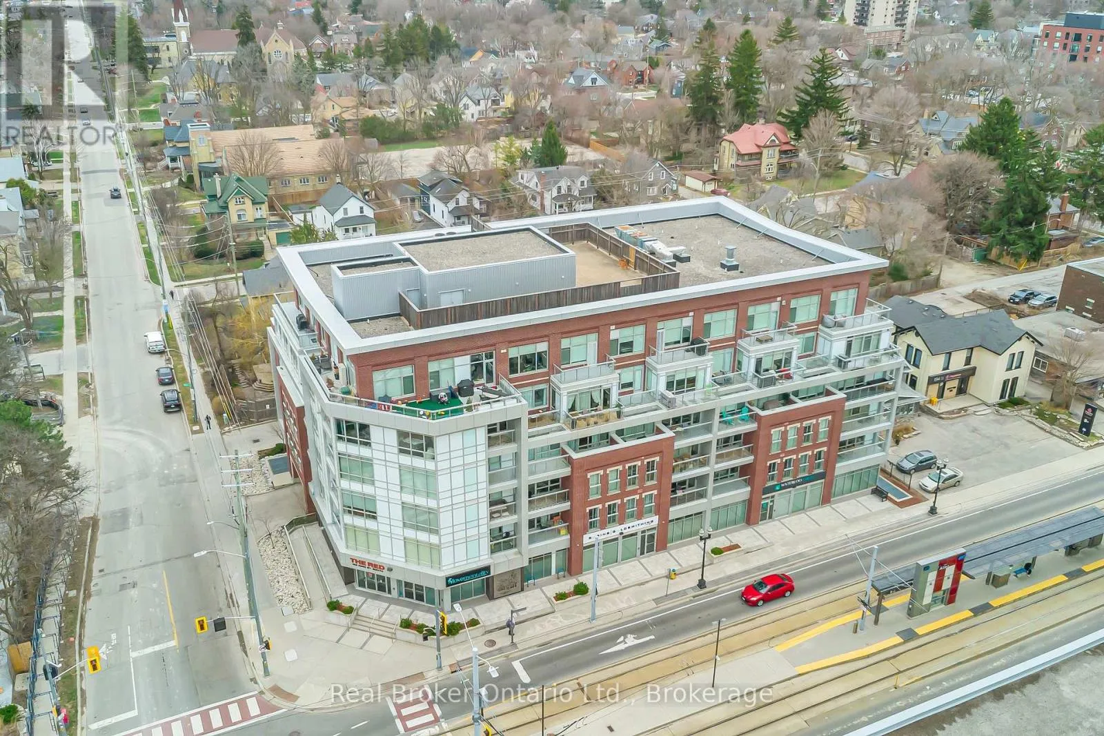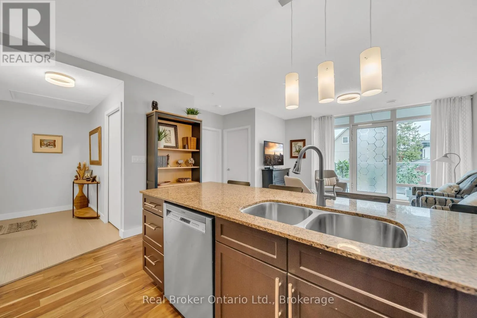 King St S & Allen St E Welcome to 214-188 King Street S, a stylish and meticulously updated 2-bedroom, 2-bathroom corner unit in the heart of Uptown Waterloo. Boasting a bright, open-concept layout, this stunning condo offers over 1,000 sq ft of modern living space with premium upgrades throughout. The expansive kitchen is a chef's dream, featuring tall 4-shelf cabinetry, granite countertops, a generous peninsula with pendant lighting, and high-end stainless steel appliances - including a Bosch dishwasher and Samsung stove and microwave. Large windows flood the living space with natural light and lead to a spacious private balcony with a charming brick end wall - perfect for planters and outdoor décor. Enjoy BBQs and outdoor entertaining right from your unit. The primary suite includes a walk-in closet and a beautifully upgraded ensuite, while the second bedroom and full bath provide ideal flexibility for guests or a home office. Additional upgrades include fresh paint, modern light fixtures, new faucets, curved shower rods, updated bathroom fans, and custom window coverings. Enjoy the convenience of a heated ground-level parking garage with one owned space and access to three EV charging stations. The storage locker, amenity room, and fitness centre are all located on the same floor for ultimate convenience. Set in a quiet, professionally managed building with a welcoming community atmosphere - featuring monthly socials and a mix of professionals and retirees. Located directly on the ION light rail line and just steps from Vincenzo's, The Bauer Kitchen, the Spurline Trail, and Iron Horse Trail - this is Uptown Waterloo living at its finest. (id:27476)