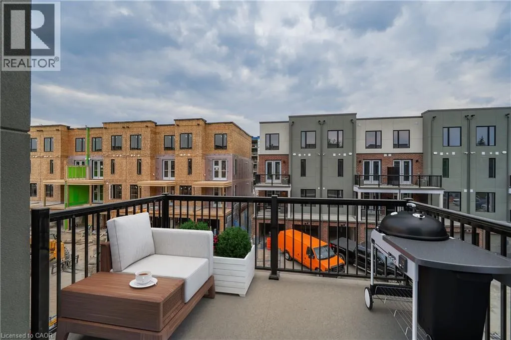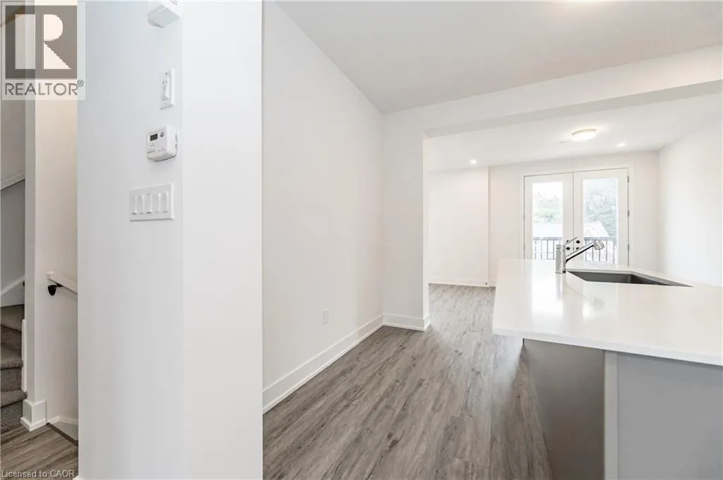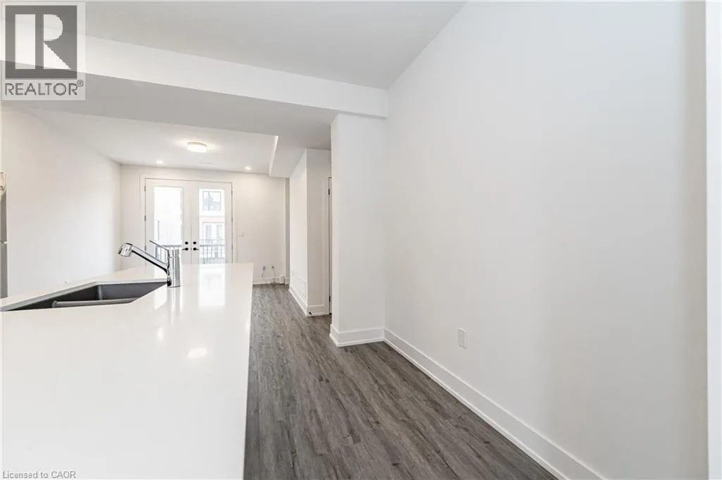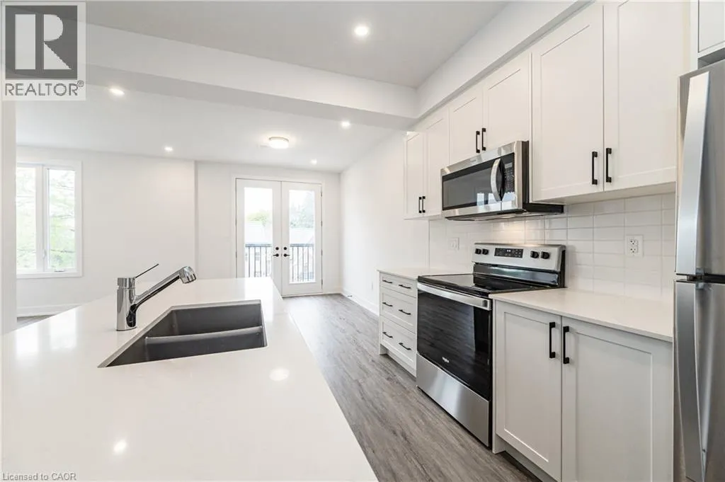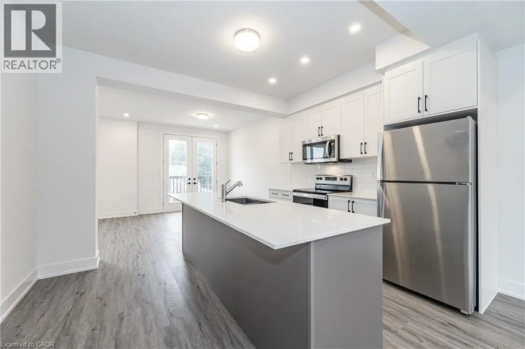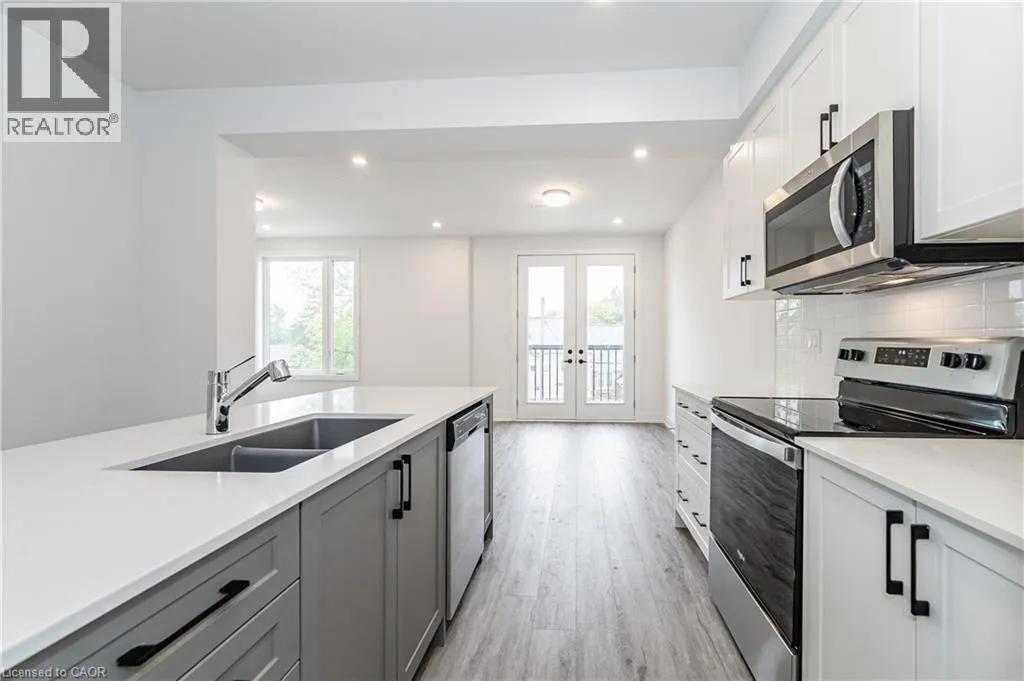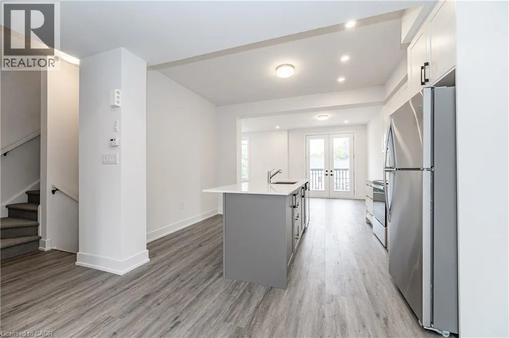 Between Moore Ave S and Lucan Avenue Your very own Urban Oasis living at Spur Line Common Condos. This 3 bedroom Executive modern townhome with garage is located in Midtown KW steps away from the Spur Line Trail, ION light rail and transit bus stops. Conveniently located in the heart of Waterloo allowing residents easy access to plenty of lifestyle amenities-walking distance to shopping, restaurants and many entertainment options. Over 1800 sq ft of bright, spacious living with over $22k in builder upgrades-cabinetry, flooring & lighting. The main floor features a large living area, dining room with sliders to private terrace, a chef inspired kitchen all with 9'ceilings. The white kitchen has quartz counters, S/S appliances and is a great space to entertain with a large island & breakfast bar! Plenty of room for a work from home office space. Main floor laundry with stackable washer/dryer and a 2 pc bathroom. The upper floor has 3 generously sized bedrooms. The primary bedroom is complete with a walk in closet, ensuite bathroom and a second private terrace. Parking for 2 vehicles- including the private garage with garage door opener and direct access. (id:27476)