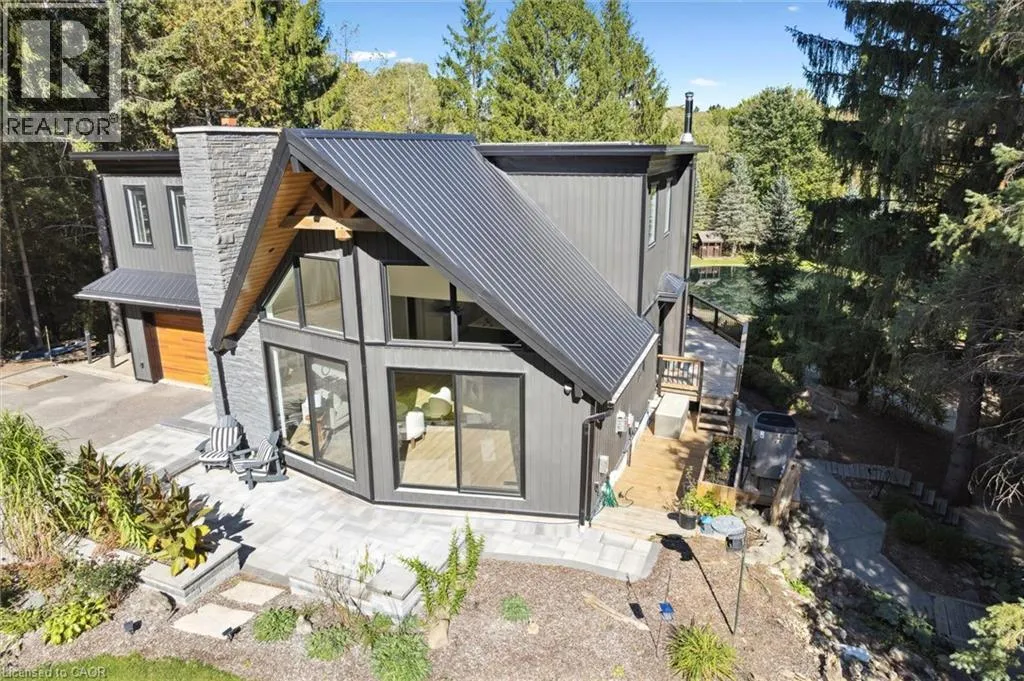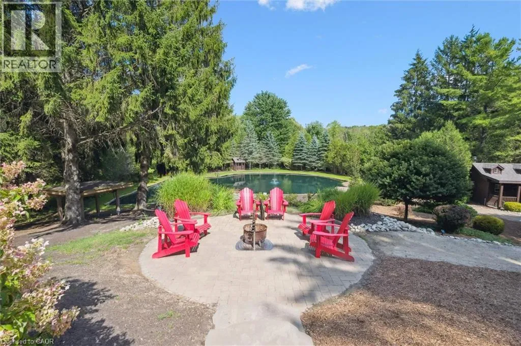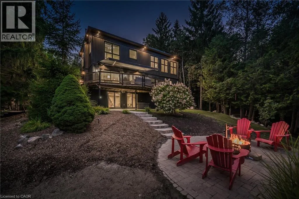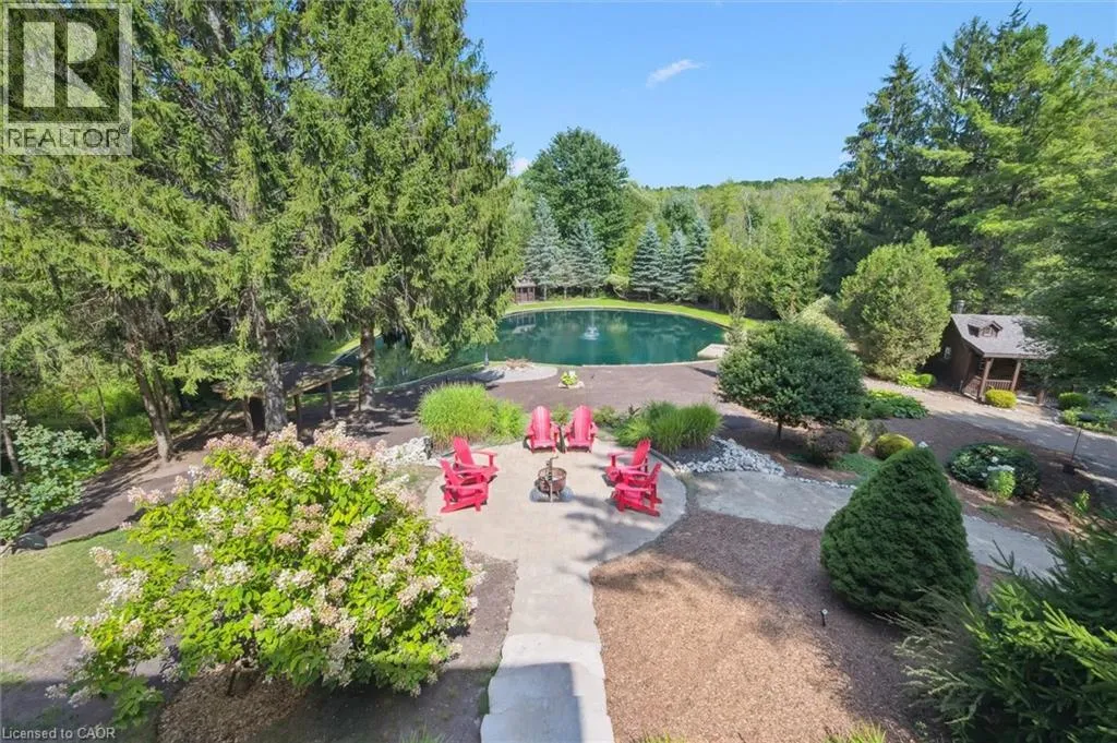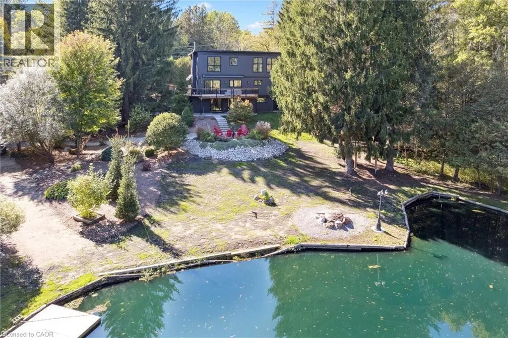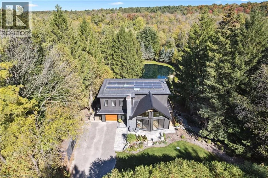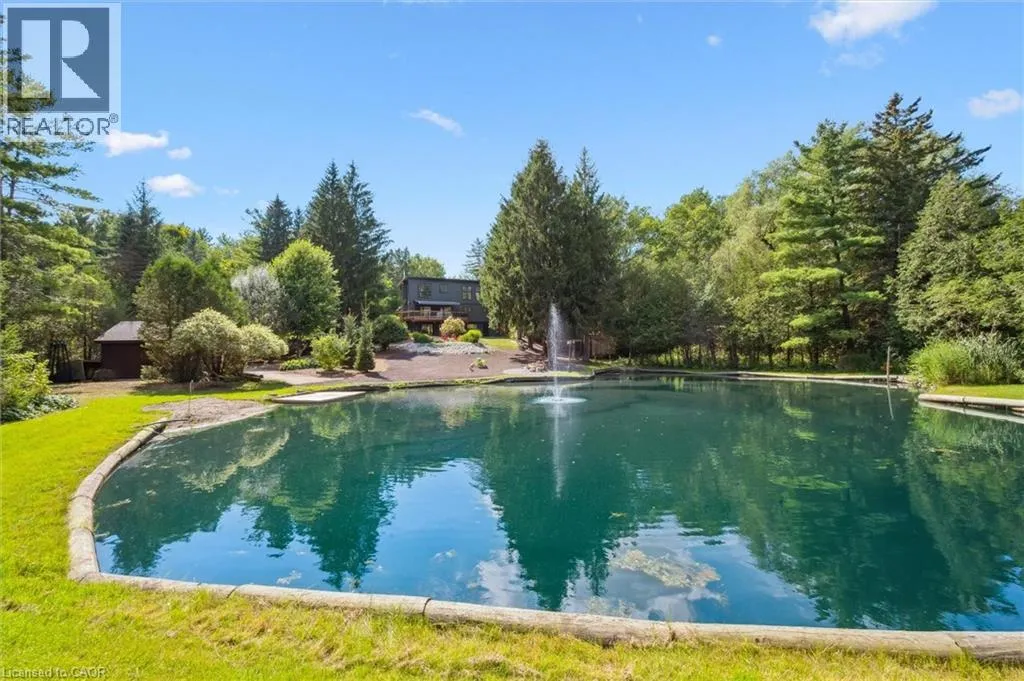 Wideman Rd to Wilmot Line or Erb St. W/ Erb's Rd to Wilmot Line. Private Oasis in Waterloo. This one-of-a-kind, fully renovated home offers a cottage-like retreat just minutes from city amenities. Set on 3.7 acres surrounded by trees, a pond, and nature, it combines luxury finishes with smart home technology to create a truly signature property. Inside, the open-concept living room features soaring vaulted ceilings, a propane fireplace, and expansive windows that flood the space with natural light. The chefâs kitchen boasts quartz counters, a spacious island, high-end appliances, pot filler, custom backsplash, and an adjoining pantry with built-in microwave, additional oven, fridge, wine rack, and storage. Perfect for entertaining, the main floor also includes a stylish dining area, built-in bar, walkout to a deck with power awning, and a 4-pc bath. Upstairs, the primary suite is a private sanctuary with breathtaking views, a large walk-in closet, and a spa-like 5-pc ensuite featuring a soaker tub, glass shower, and double sinks. Two additional bedrooms, a 3-pc bath, and convenient upper-level laundry complete this floor. The finished lower level includes heated tile floors, a rec room with cozy wood fireplace and walkout, rough-in for a wet bar, an additional bedroom, office with separate entrance, and a 3-pc bath.The mechanical features include updated electrical & plumbing, Lennox heat pump with backup propane furnace, R/O system and new carbon filter for drilled well, new septic system, solar panels on flat roof generate electricity. Smart home features throughout. Outside, enjoy a private front yard, secondary driveway which allows extra parking, a large patio overlooking the pond with sandy beach and floating dock, plus two charming bunkiesâone with a wood stove. All of this within minutes to shopping, schools, markets, and trails. A+++ (id:27476)