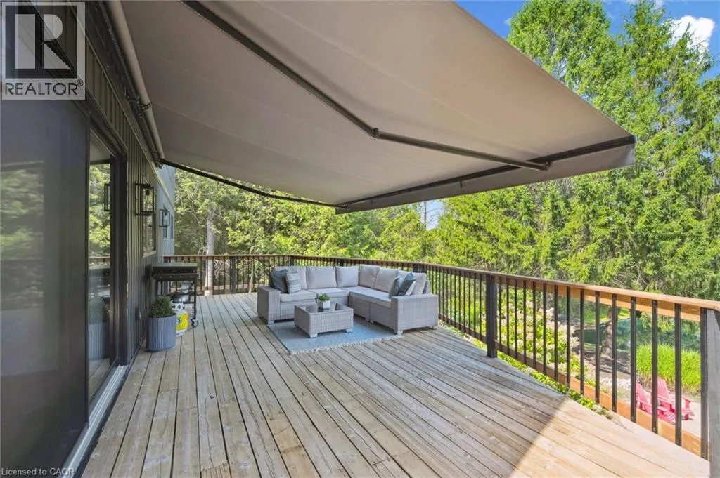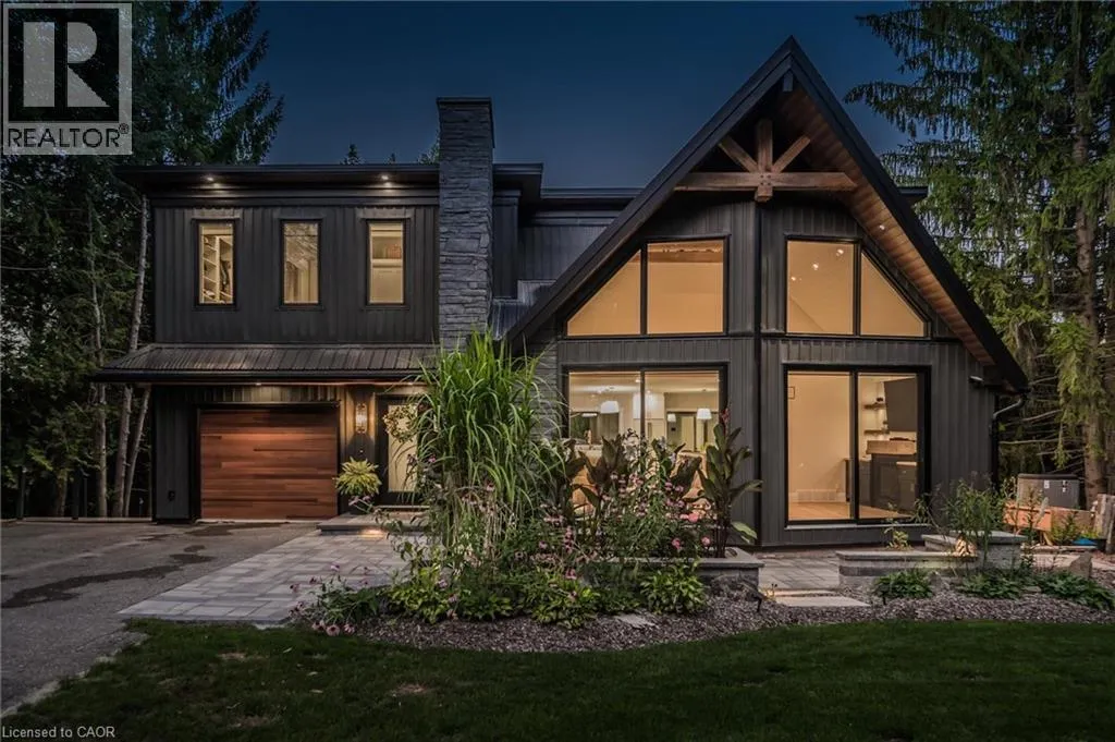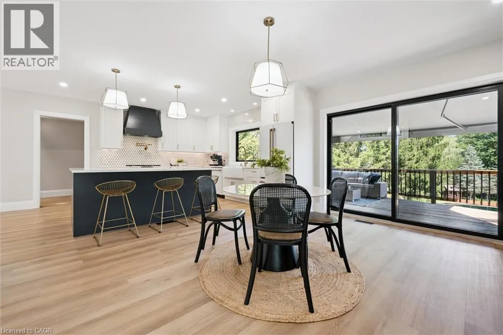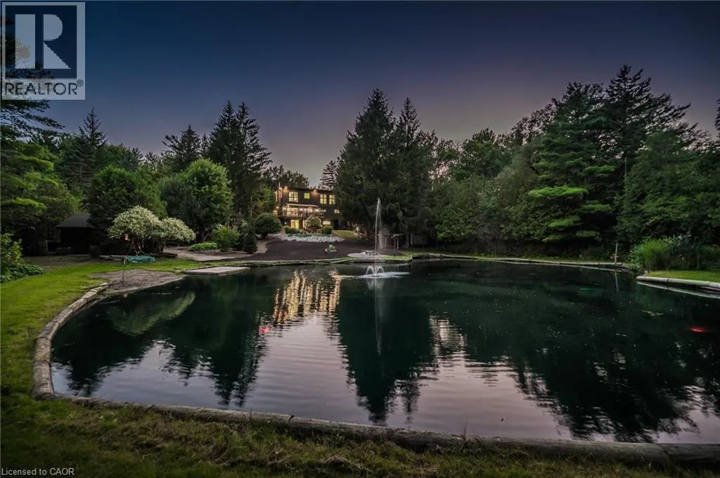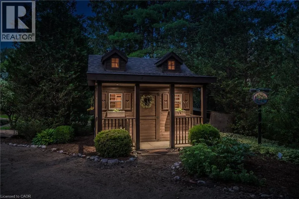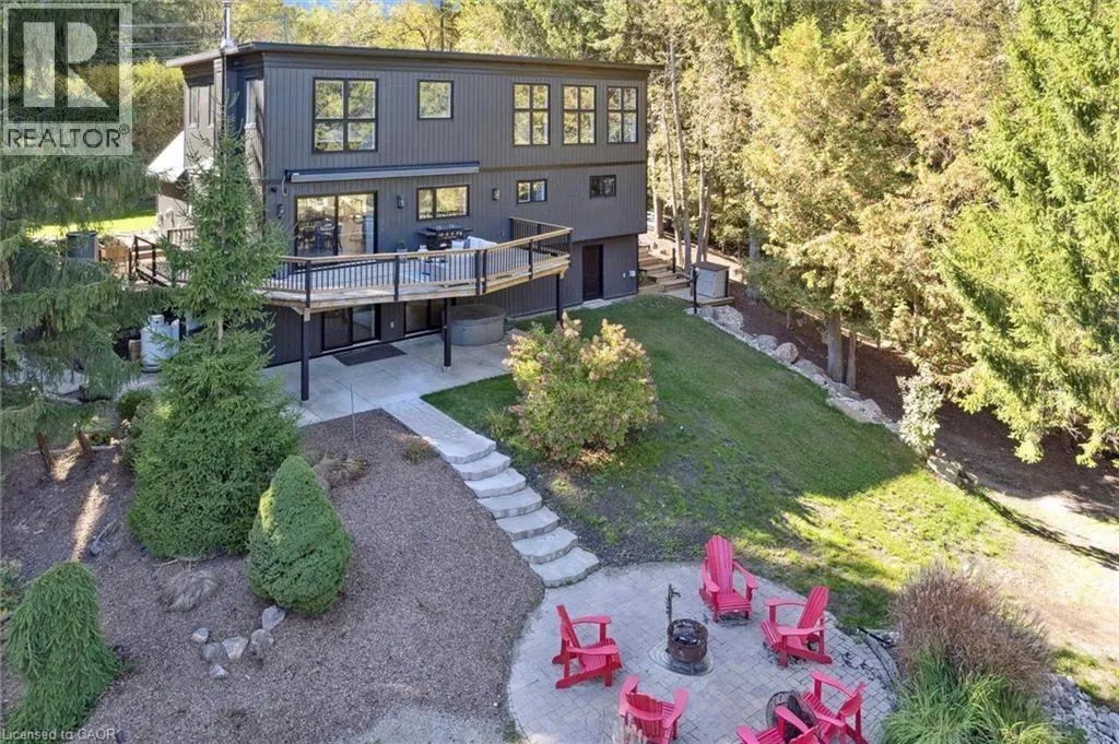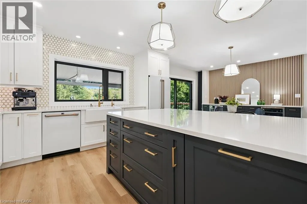 Wideman Rd to Wilmot Line or Erb St. W/ Erb's Rd to Wilmot Line. Private Oasis in Waterloo. This one-of-a-kind, fully renovated home offers a cottage-like retreat just minutes from city amenities. Set on 3.7 acres surrounded by trees, a pond, and nature, it combines luxury finishes with smart home technology to create a truly signature property. Inside, the open-concept living room features soaring vaulted ceilings, a propane fireplace, and expansive windows that flood the space with natural light. The chefâs kitchen boasts quartz counters, a spacious island, high-end appliances, pot filler, custom backsplash, and an adjoining pantry with built-in microwave, additional oven, fridge, wine rack, and storage. Perfect for entertaining, the main floor also includes a stylish dining area, built-in bar, walkout to a deck with power awning, and a 4-pc bath. Upstairs, the primary suite is a private sanctuary with breathtaking views, a large walk-in closet, and a spa-like 5-pc ensuite featuring a soaker tub, glass shower, and double sinks. Two additional bedrooms, a 3-pc bath, and convenient upper-level laundry complete this floor. The finished lower level includes heated tile floors, a rec room with cozy wood fireplace and walkout, rough-in for a wet bar, an additional bedroom, office with separate entrance, and a 3-pc bath.The mechanical features include updated electrical & plumbing, Lennox heat pump with backup propane furnace, R/O system and new carbon filter for drilled well, new septic system, solar panels on flat roof generate electricity. Smart home features throughout. Outside, enjoy a private front yard, secondary driveway which allows extra parking, a large patio overlooking the pond with sandy beach and floating dock, plus two charming bunkiesâone with a wood stove. All of this within minutes to shopping, schools, markets, and trails. A+++ (id:27476)