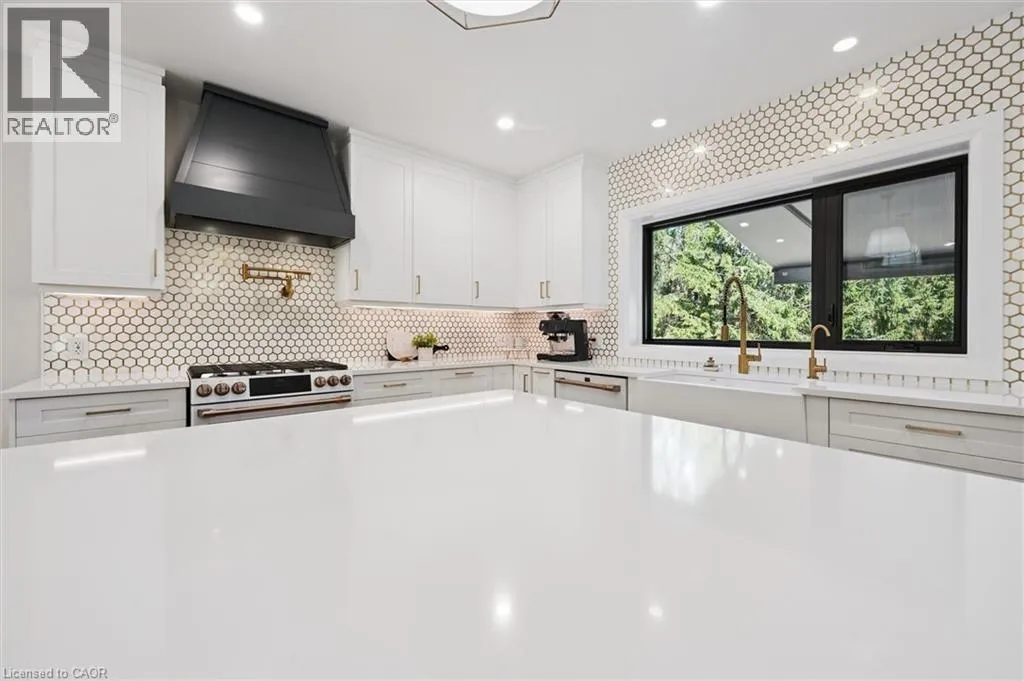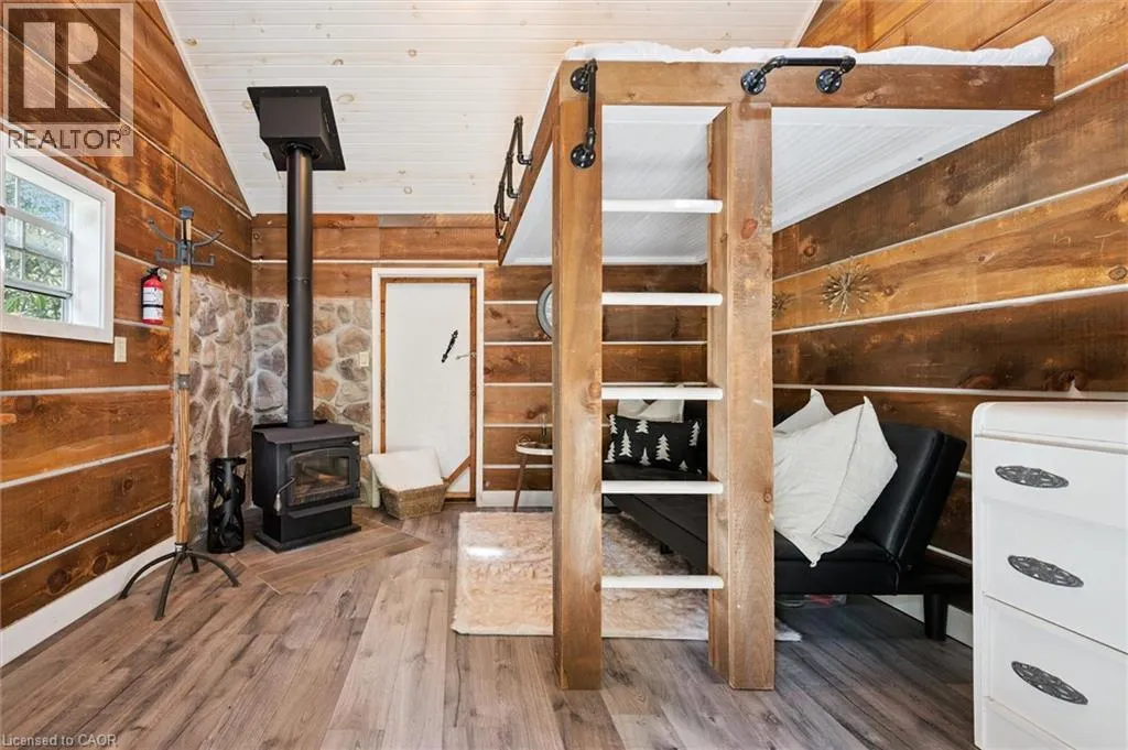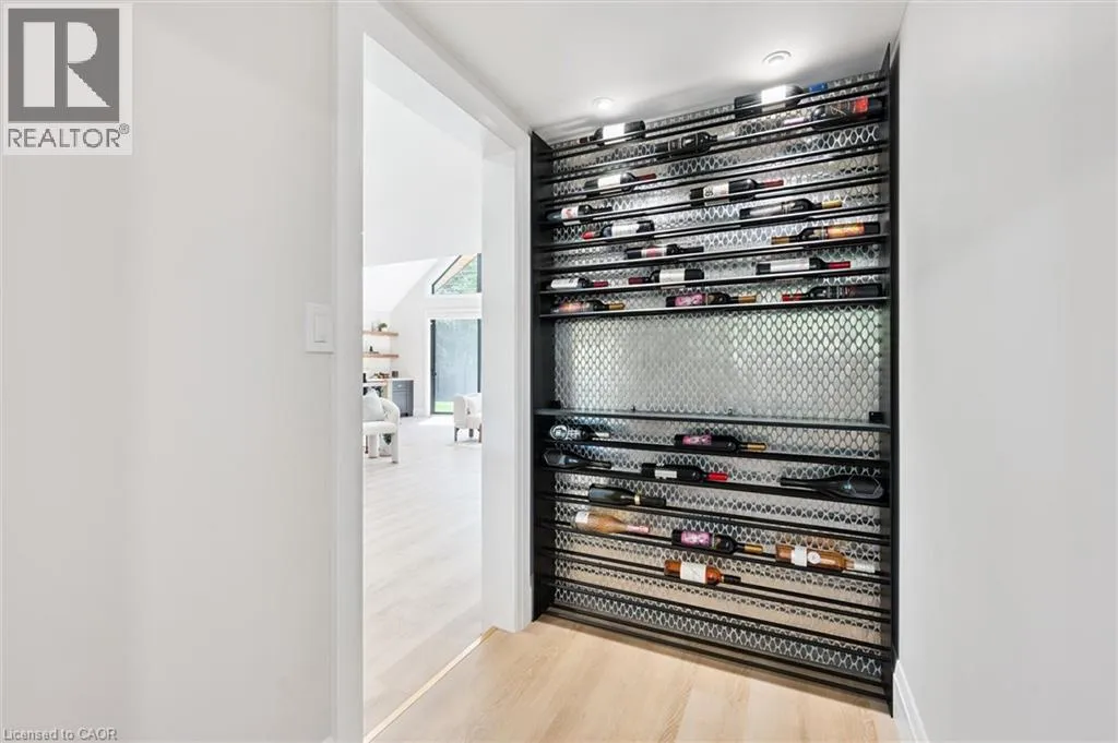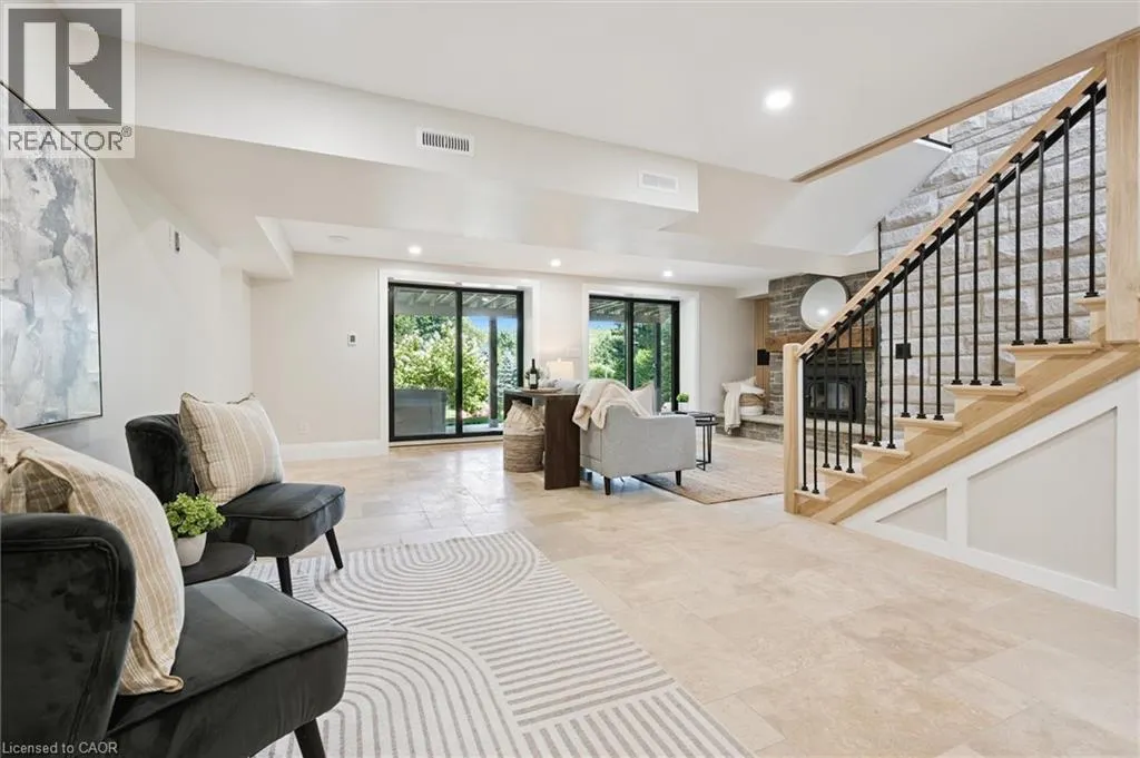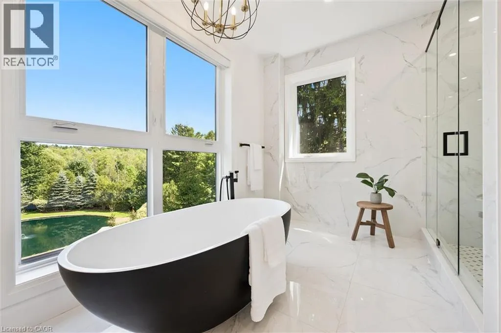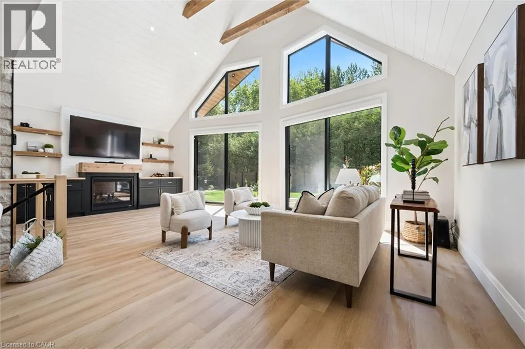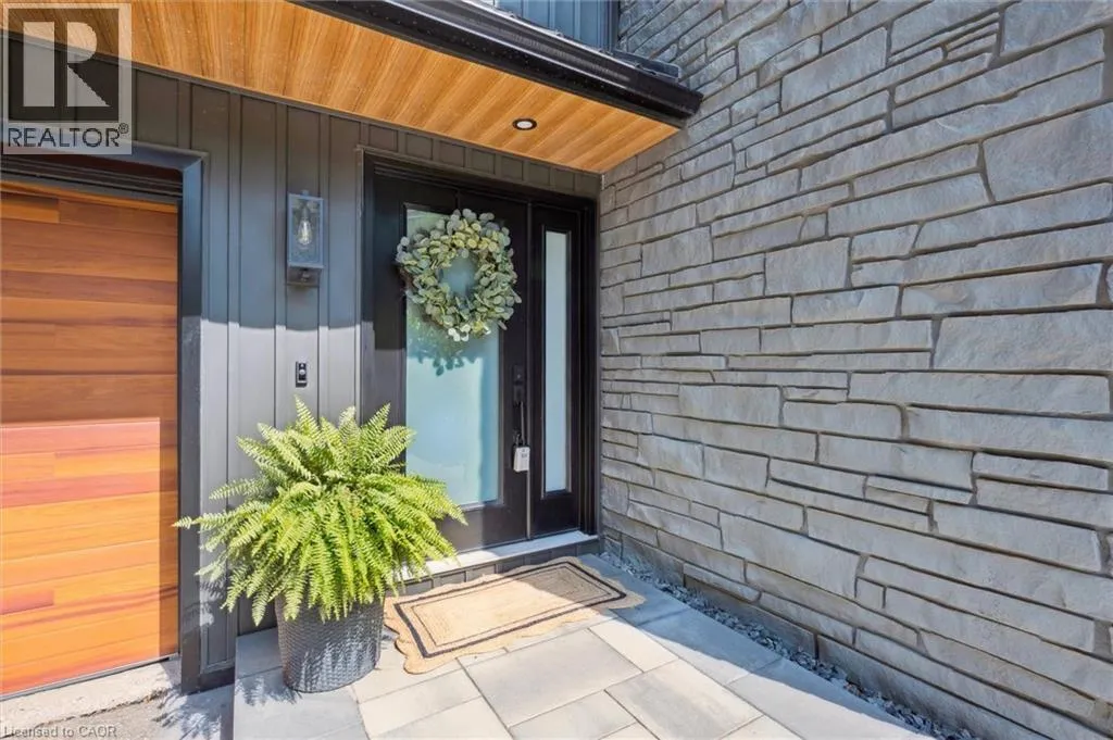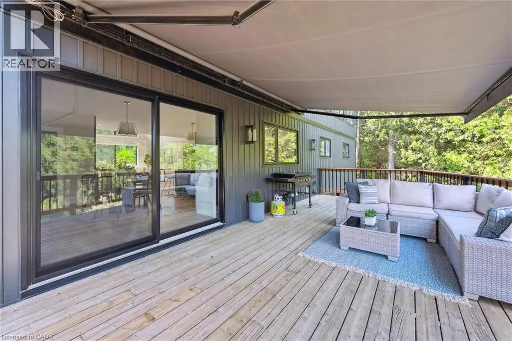 Wideman Rd to Wilmot Line or Erb St. W/ Erb's Rd to Wilmot Line. Private Oasis in Waterloo. This one-of-a-kind, fully renovated home offers a cottage-like retreat just minutes from city amenities. Set on 3.7 acres surrounded by trees, a pond, and nature, it combines luxury finishes with smart home technology to create a truly signature property. Inside, the open-concept living room features soaring vaulted ceilings, a propane fireplace, and expansive windows that flood the space with natural light. The chefâs kitchen boasts quartz counters, a spacious island, high-end appliances, pot filler, custom backsplash, and an adjoining pantry with built-in microwave, additional oven, fridge, wine rack, and storage. Perfect for entertaining, the main floor also includes a stylish dining area, built-in bar, walkout to a deck with power awning, and a 4-pc bath. Upstairs, the primary suite is a private sanctuary with breathtaking views, a large walk-in closet, and a spa-like 5-pc ensuite featuring a soaker tub, glass shower, and double sinks. Two additional bedrooms, a 3-pc bath, and convenient upper-level laundry complete this floor. The finished lower level includes heated tile floors, a rec room with cozy wood fireplace and walkout, rough-in for a wet bar, an additional bedroom, office with separate entrance, and a 3-pc bath.The mechanical features include updated electrical & plumbing, Lennox heat pump with backup propane furnace, R/O system and new carbon filter for drilled well, new septic system, solar panels on flat roof generate electricity. Smart home features throughout. Outside, enjoy a private front yard, secondary driveway which allows extra parking, a large patio overlooking the pond with sandy beach and floating dock, plus two charming bunkiesâone with a wood stove. All of this within minutes to shopping, schools, markets, and trails. A+++ (id:27476)