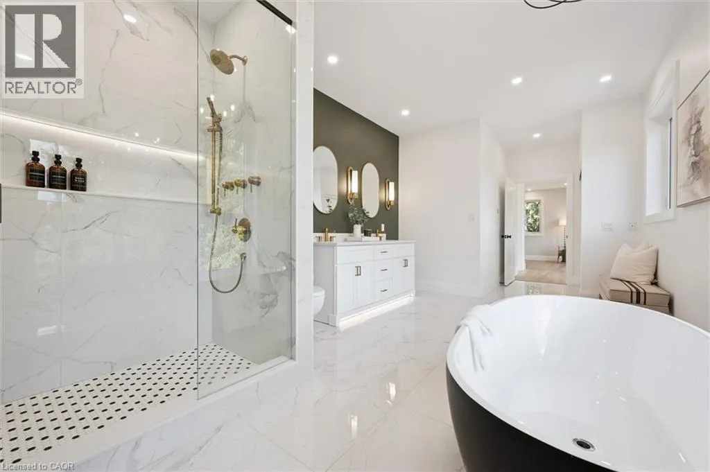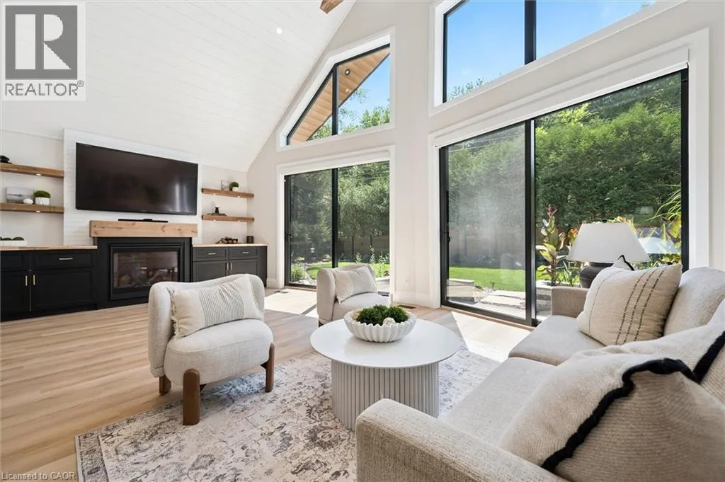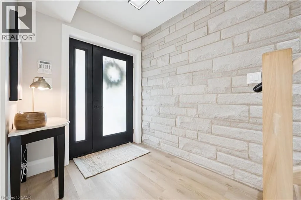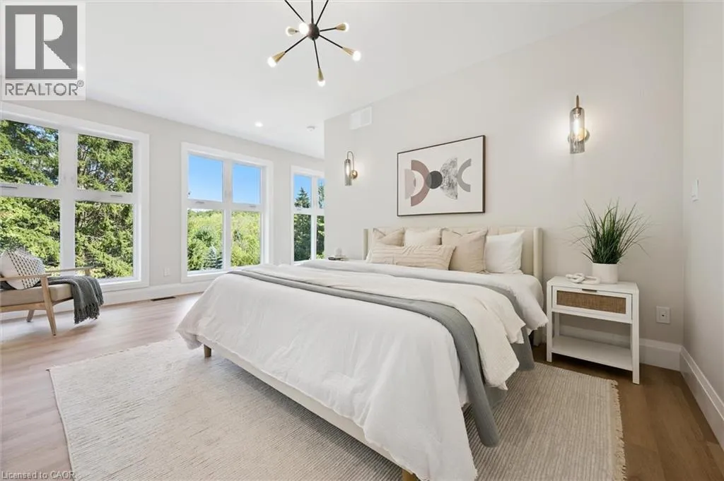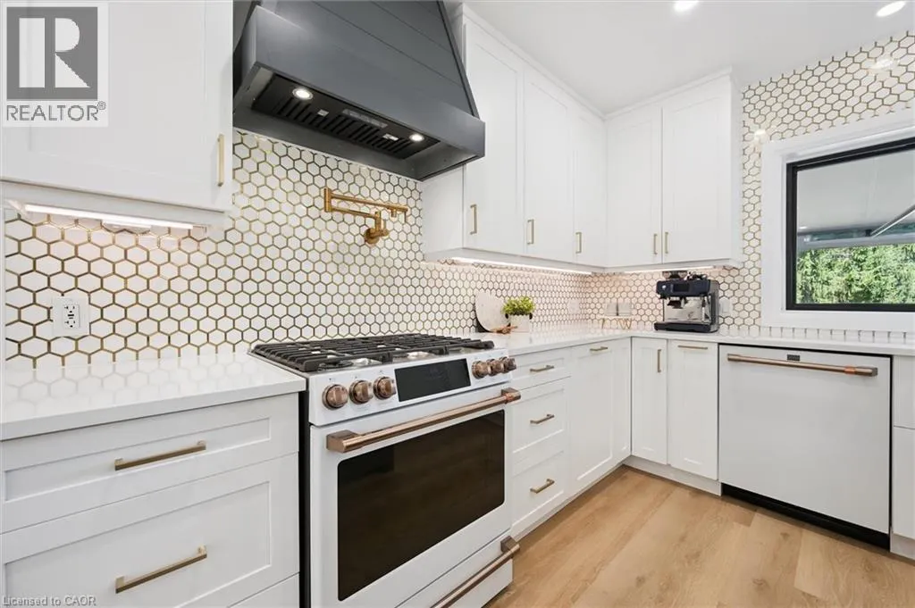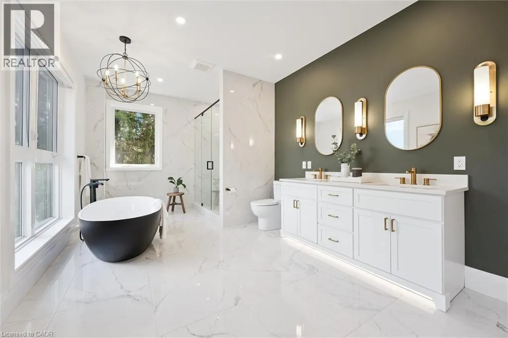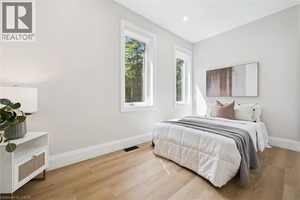 Wideman Rd to Wilmot Line or Erb St. W/ Erb's Rd to Wilmot Line. Private Oasis in Waterloo. This one-of-a-kind, fully renovated home offers a cottage-like retreat just minutes from city amenities. Set on 3.7 acres surrounded by trees, a pond, and nature, it combines luxury finishes with smart home technology to create a truly signature property. Inside, the open-concept living room features soaring vaulted ceilings, a propane fireplace, and expansive windows that flood the space with natural light. The chefâs kitchen boasts quartz counters, a spacious island, high-end appliances, pot filler, custom backsplash, and an adjoining pantry with built-in microwave, additional oven, fridge, wine rack, and storage. Perfect for entertaining, the main floor also includes a stylish dining area, built-in bar, walkout to a deck with power awning, and a 4-pc bath. Upstairs, the primary suite is a private sanctuary with breathtaking views, a large walk-in closet, and a spa-like 5-pc ensuite featuring a soaker tub, glass shower, and double sinks. Two additional bedrooms, a 3-pc bath, and convenient upper-level laundry complete this floor. The finished lower level includes heated tile floors, a rec room with cozy wood fireplace and walkout, rough-in for a wet bar, an additional bedroom, office with separate entrance, and a 3-pc bath.The mechanical features include updated electrical & plumbing, Lennox heat pump with backup propane furnace, R/O system and new carbon filter for drilled well, new septic system, solar panels on flat roof generate electricity. Smart home features throughout. Outside, enjoy a private front yard, secondary driveway which allows extra parking, a large patio overlooking the pond with sandy beach and floating dock, plus two charming bunkiesâone with a wood stove. All of this within minutes to shopping, schools, markets, and trails. A+++ (id:27476)