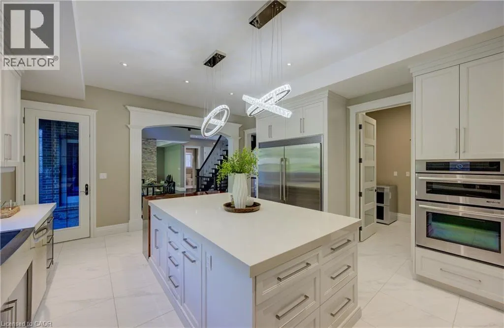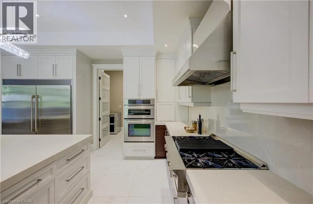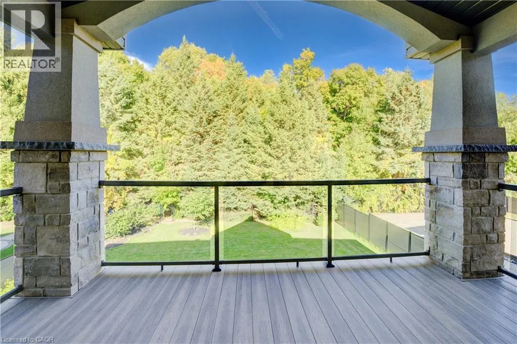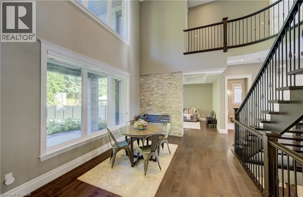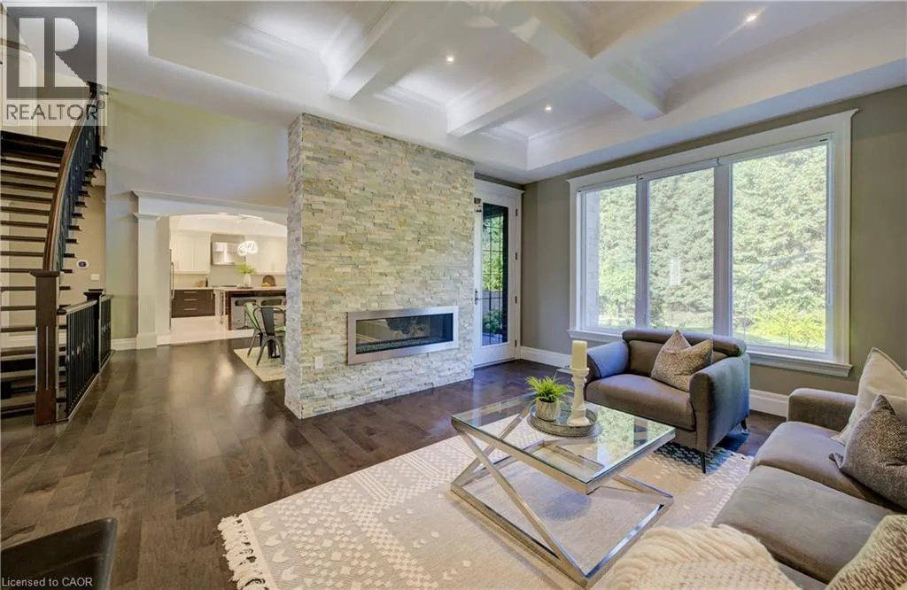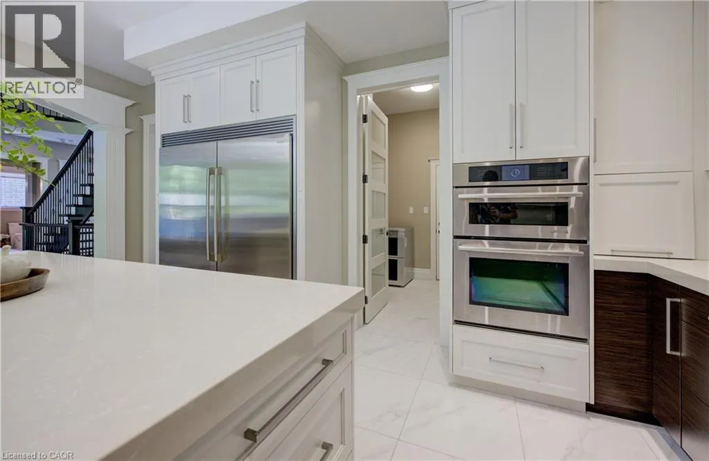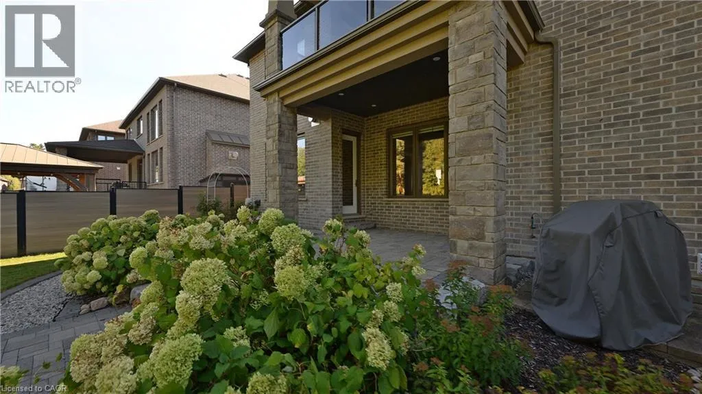 White Cedar Ave Built by Valleyrauss with meticulous craftsmanship and all-brick construction, this 4+ bedroom Laurelwood residence offers over 4,000 sq. ft. of refined living designed for the modern family. A grand cherry staircase makes a striking first impression, while soaring 11-foot ceilings and coffered details in the living and dining rooms establish an atmosphere of elegance. The main floor is both functional and spectacular, anchored by a floor-to-ceiling stone gas fireplace and filled with natural light. The chefâs kitchen is a showpiece, boasting a large side-by-side fridge, double wall oven, extended cabinetry, heated floors, a generous island with beverage fridge, and premium appliancesâperfect for both family dinners and large gatherings. Upstairs, 10-foot ceilings enhance the spaciousness of four bedrooms, including a primary retreat with a coffered ceiling detail with ambient lighting, a spa-like ensuite with heated floors, freestanding tub, glass shower, and double vanity, plus access to a private covered balcony. The lower level continues the luxury with hydronic heated floors and versatile finished space for media, play, or fitness. Outdoors, the backyard is designed for family life and entertaining, featuring an interlock patio, a covered terrace, and natural gas hookups for effortless grilling. Surrounded by parks, trails, and top-rated schools, this home places you within minutes of Costco, The Boardwalkâs shops and restaurants, YMCA family programs, and the hiking paths of Laurel Creek Conservation Area. Every detailâfrom 9-foot solid doors to refined trims and lightingâhas been carefully chosen to blend comfort with sophistication. A rare opportunity to own a family estate where lifestyle, location, and luxury meet. (id:27476)
