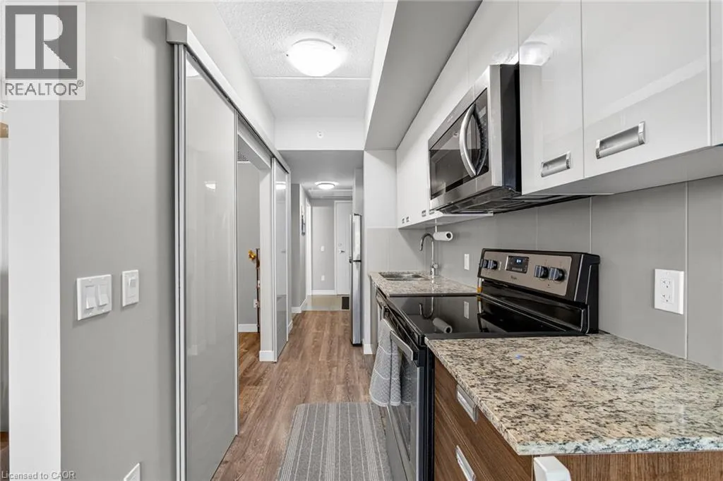 University Ave. W. Lester St. Turn-key investment or the perfect starter condo in the heart of Waterloo's University District! Unit 406 at 308 Lester offers a 1 bedroom, 1 bathroom, 465SF layout with a modern kitchen that has granite countertops and stainless steel appliances, in-suite laundry, laminate flooring throughout, and a private balcony. Consistently strong rental demand with walk-to-campus access (UW & WLU), steps to LRT, restaurants, and everyday amenities. Low-maintenance living in a professionally managed building perfect for hands-off ownership. Current rent: $2,000/month. Maintenance fees include high speed internet. (id:27476)
