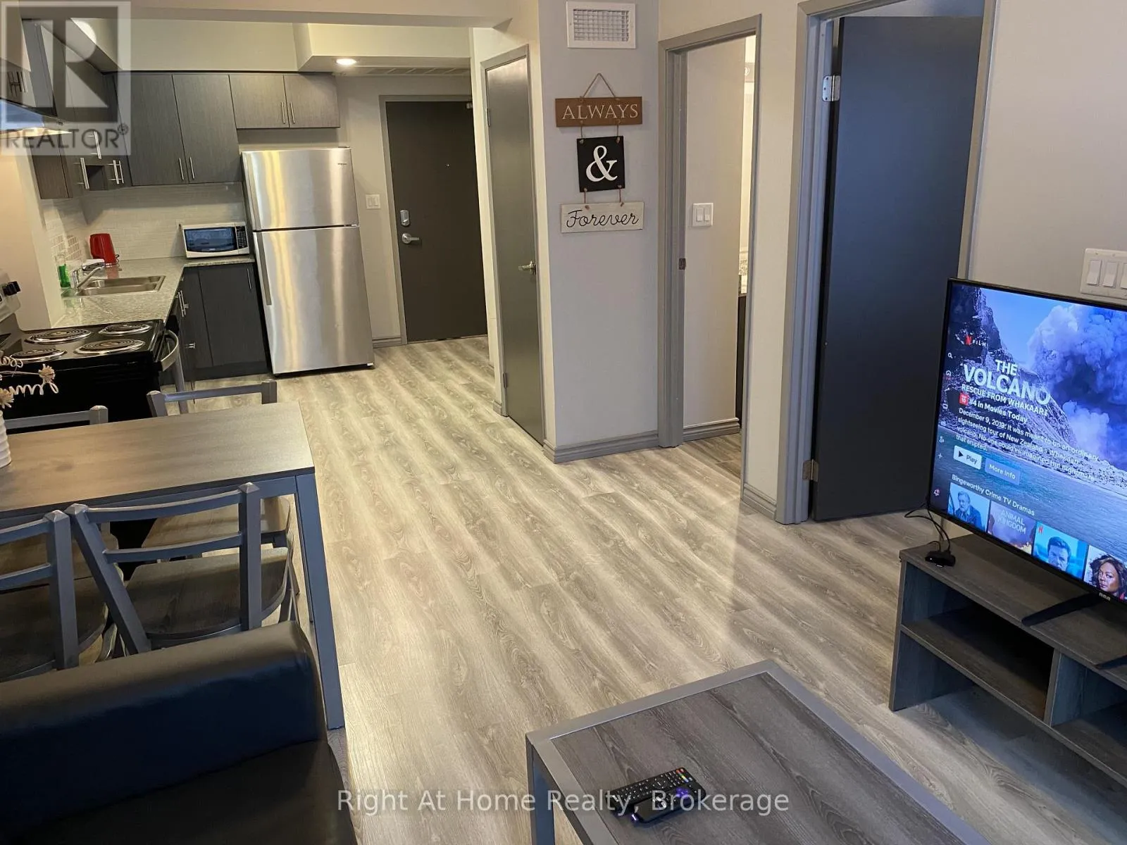 Hemlock St/Hickory St Ideal for university parents and investors. Vacant possession available. Situated just minutes from Wilfrid Laurier University and the University of Waterloo, and close to ION/LRT transit and Highway 7/8, this property ensures convenient access to all essentials. This one-bedroom and one-full bathroom condo is fully furnished and features stainless steel kitchen appliances, carpet-free living spaces, a Juliette balcony and an open-concept living area as well as a private in-suite laundry. Additional valuable amenities include commercial softener and hot water tank in the building so no need to pay for any rental equipment that other buildings might charge unit owners. As well as Internet, water, and heat included in the condo fees only hydro is extra. (id:27476)
