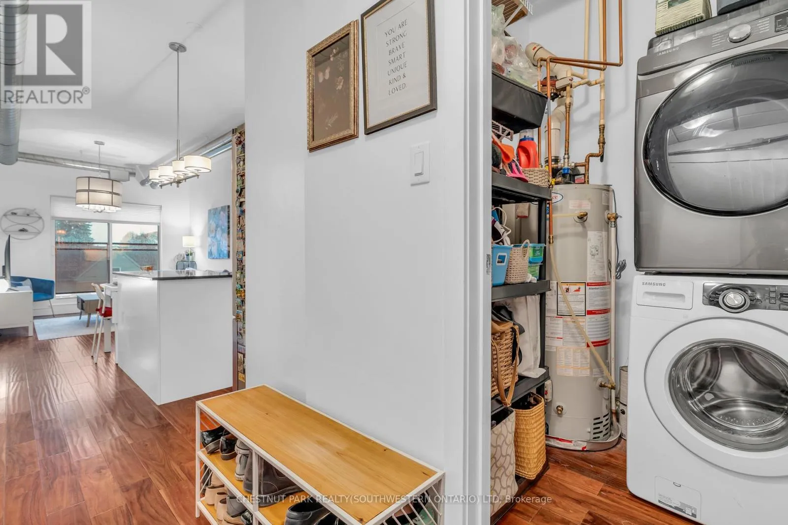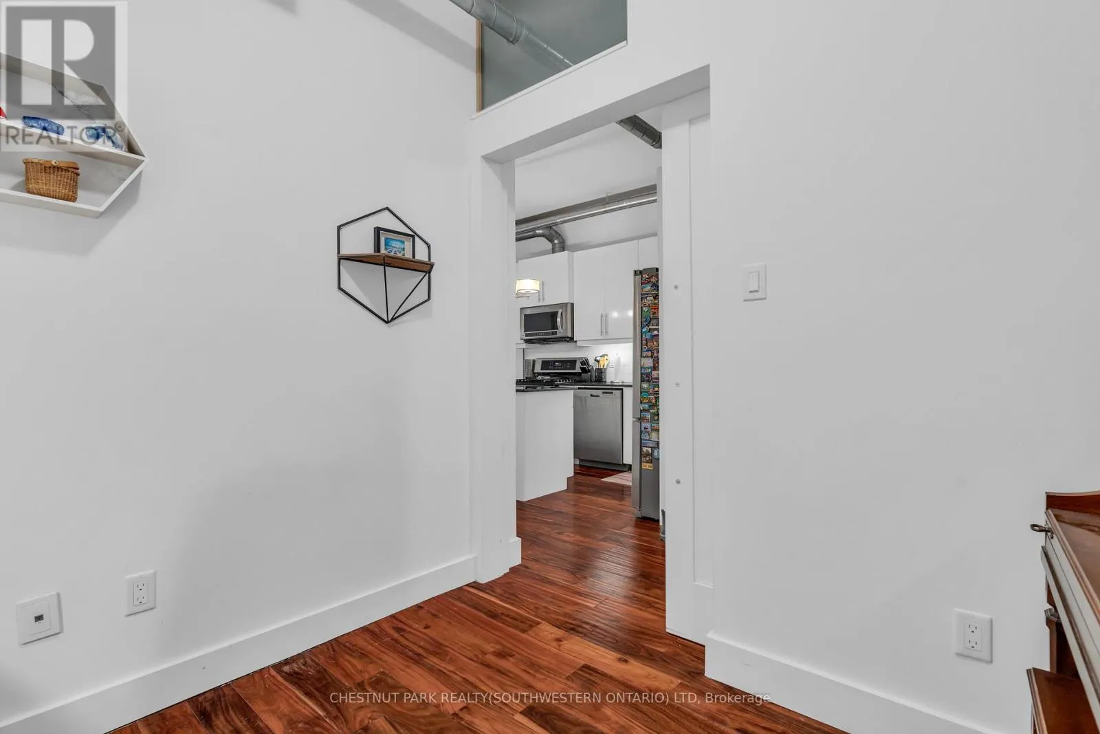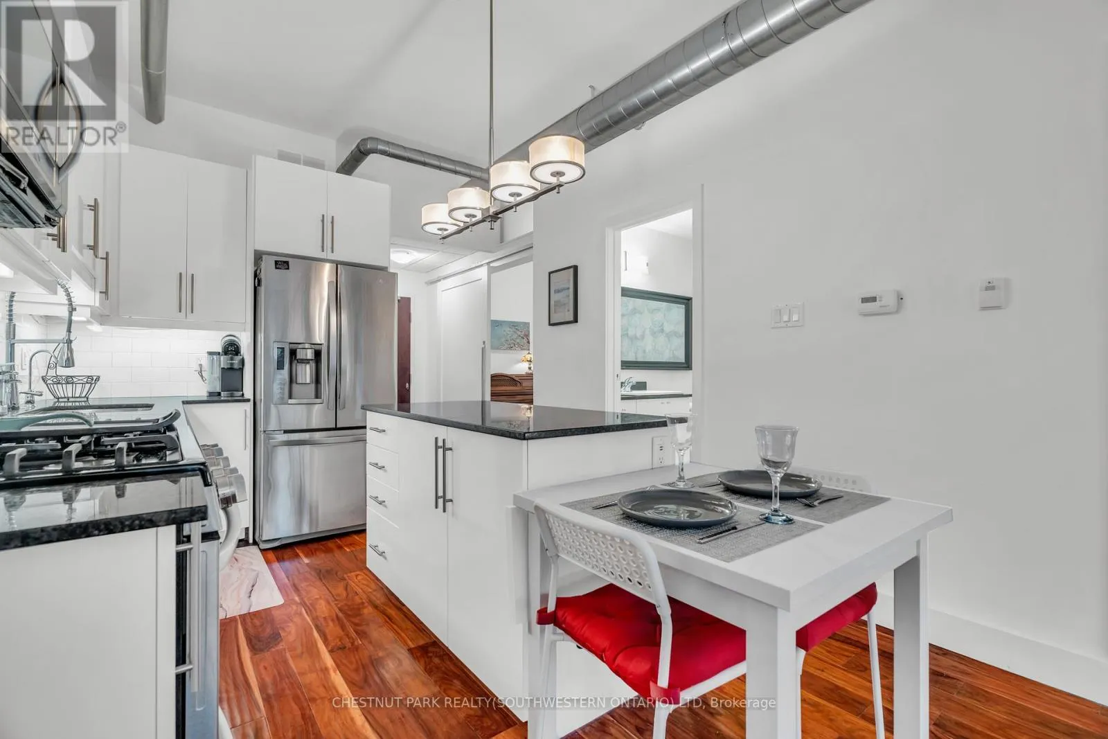 Cross Streets: Erb ST E and Moore St. ** Directions: Between Erb St E and Allen St E. Discover true urban sophistication in this rare 1 bedroom PLUS DEN at the coveted Silver Thread Lofts - a boutique building with only 15 residences. This exceptional suite showcases striking design details, including exposed ductwork, custom lighting, hand-scraped hardwood floors, granite countertops, and premium finishes throughout. The open-concept layout features a sleek kitchen with professional-grade appliances and a gas range, a spacious living area with a Juliette balcony, and a large bedroom with a walk in closet and cheater-ensuite access. Enjoy added convenience with in-suite laundry, window coverings, custom sliding doors, and the bonus of TWO PARKING SPACES! (one covered, one surface). Building amenities include a one-of-a-kind fitness studio with a rock-climbing wall, a meeting room, outdoor patio, and a stylish lobby. Unbeatable location - steps to Uptown Waterloo's best restaurants, shops, and nightlife, as well as the Spur Line Trail, Waterloo Park, and both universities. Easy access to the expressway and all essential amenities. An exclusive opportunity that truly won't last long! (id:27476)