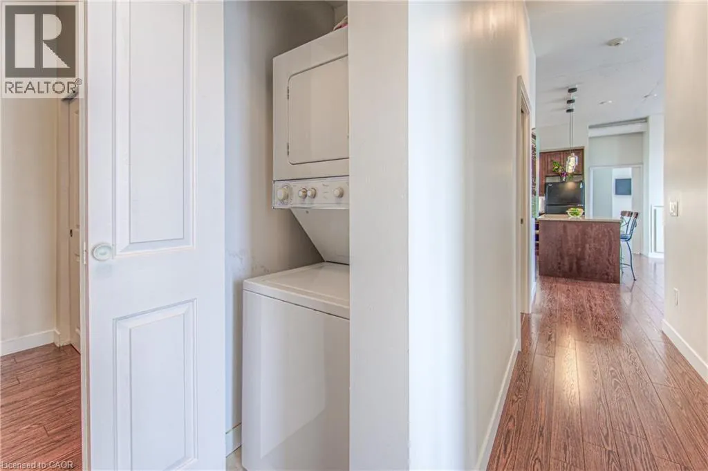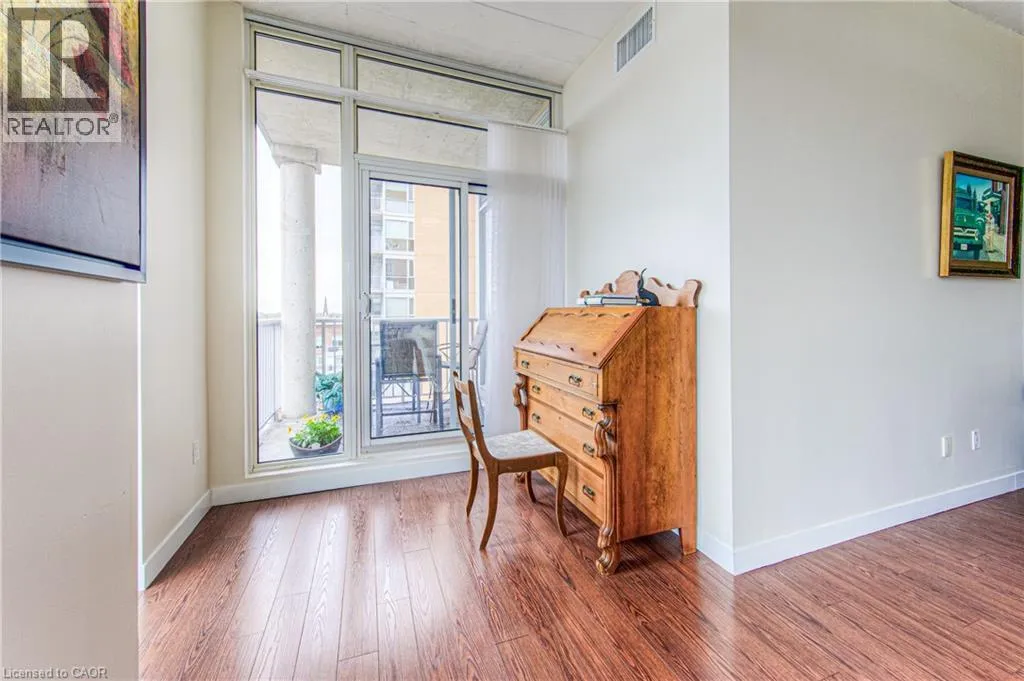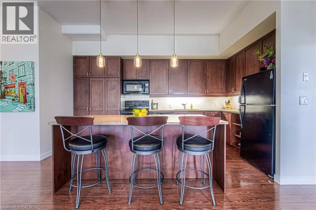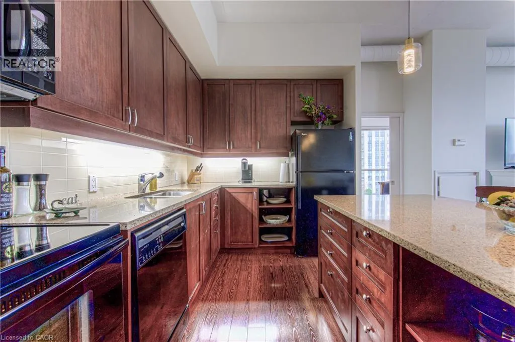 King St S -John St W 2 BEDROOM, 2 BATHROOM, 2 BALCONY CORNER UNIT! Enjoy Cityscape and Sunset views from every room and both balconies in this unit. Arguably the best floor plan in the building with a separate dining room, den and oversized living room, all with a backdrop of floor to ceiling windows. The kitchen offers an abundance of upgraded cabinets, granite countertops, undercounted lighting, and a large island with an overhang large enough for 4 stools. This unit is an entertainersâ dream. The bedrooms and bathrooms are at separate ends of the unit, perfect for a separate TV room or quiet office. Both bedrooms enjoy absolutely fabulous views of Uptown Waterloo and afar with huge corner windows. Freshly painted and updated lighting. The Bauer Lofts offer a party room leading to a huge roof top patio with bbq, & fitness room. The location cannot be beat with restaurants, coffee shop, gourmet grocery store, and other boutique shops, just steps from your front door. Walk to Uptown or jump on the LRT in front of the building. A historical building in a vibrant urban neighbourhood. Pet friendly, lots of visitor parking, and offers extra secure elevator access. (id:27476)