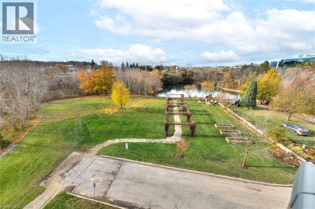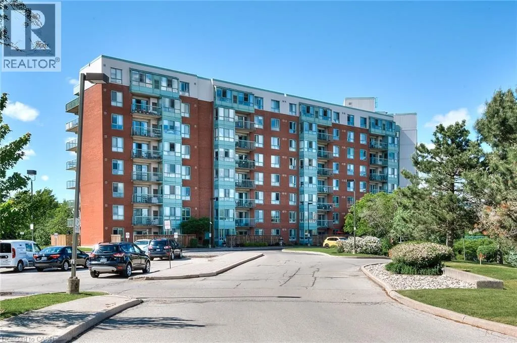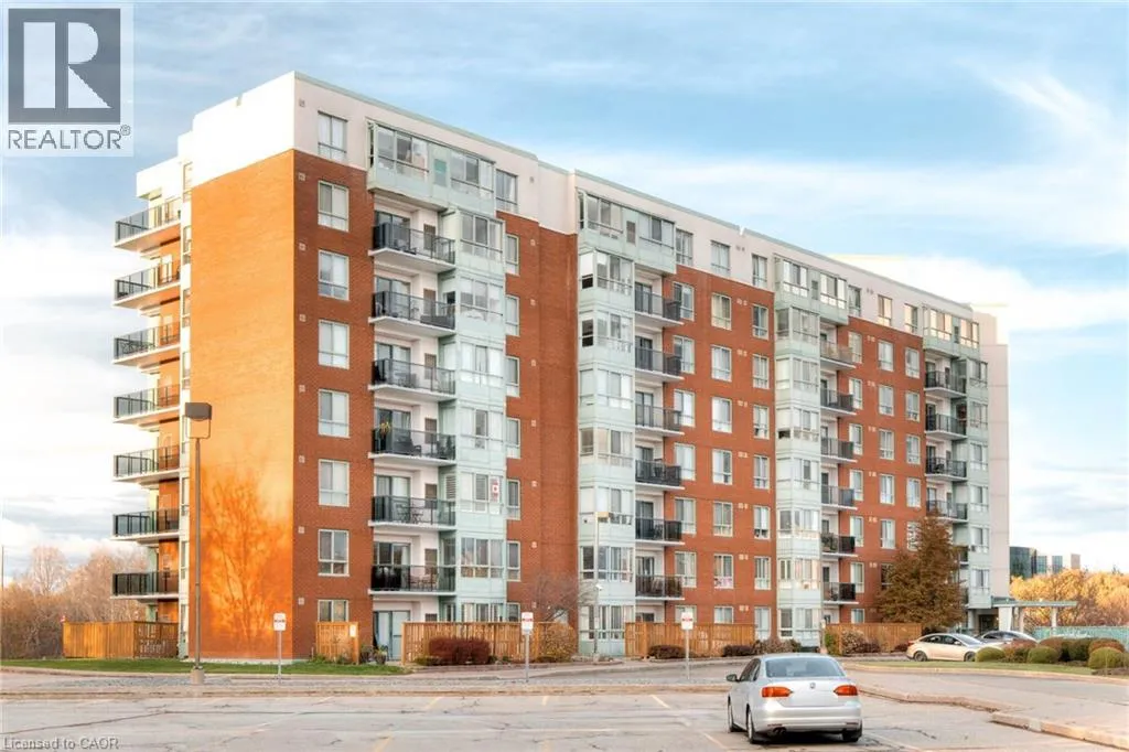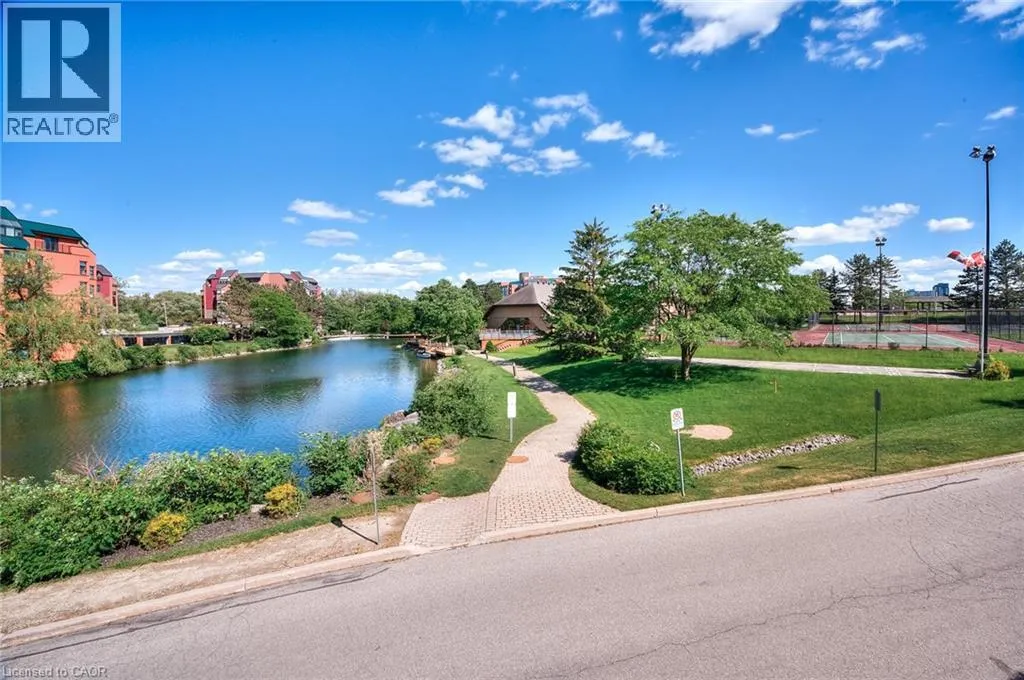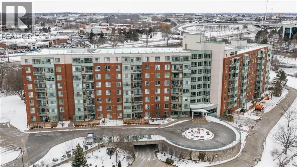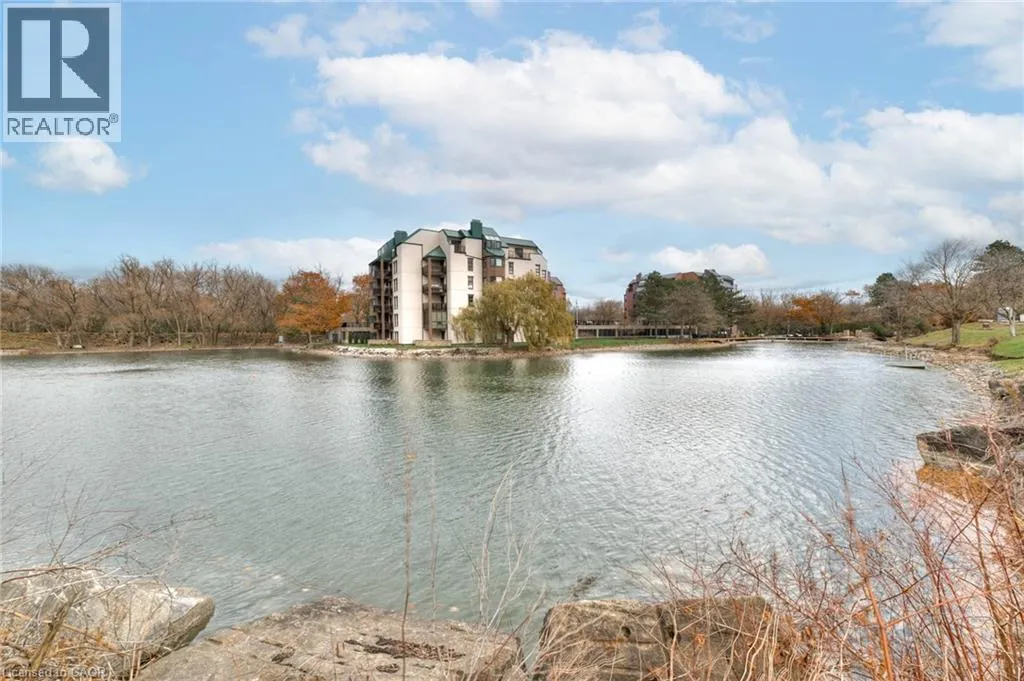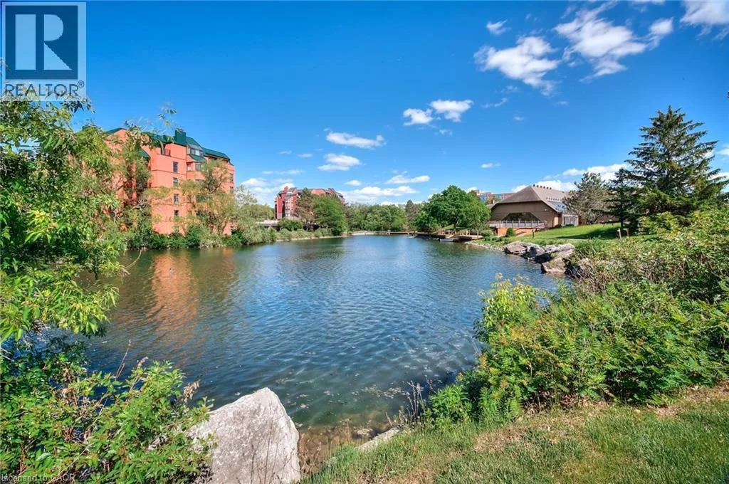 FROM CONESTOGA PARKWAY: Take a left off King St ramp, left on Blue Springs Drive This bright and inviting end unit condo features a desirable split-bedroom layout â with a bedroom and full bath on either side, offering comfort and privacy for family or guests. Meticulously painted with a warm neutral, upgraded with a durable wide plank flooring, tasteful lighting, and crown moldings. The bathrooms have a classic terracotta aesthetic with handy grab bars for stability. The kitchen is perfectly positioned to capture a spectacular view of the ponds, while the spacious living room and dining room opens onto a private balcony with a modern glass railing overlooking the serene setting with views of both ponds with cascading waterfalls highlighted by up lighting at dusk, a lovely place to watch for the birds and enjoy the sunsets. The primary bedroom features his-and-hers closets and a full ensuite bath, creating a peaceful retreat. The in-suite laundry is tucked neatly away in its own room. Enjoy carefree condo living with two parking spaces â one underground and one surface â plus a storage locker for added convenience. The building is known for its excellent management and warm community atmosphere, offering secure entry, an on-site superintendent, a cozy library, a party room, rooftop and ground-level BBQ areas, and a guest suite for visitors. Located in north Waterloo, youâll love the easy access to bus routes, the LRT, the expressway, and Conestoga Mall â plus walking and biking trails just outside your door. Comfort, convenience, and natural beauty await at Blue Springs. (id:27476)
