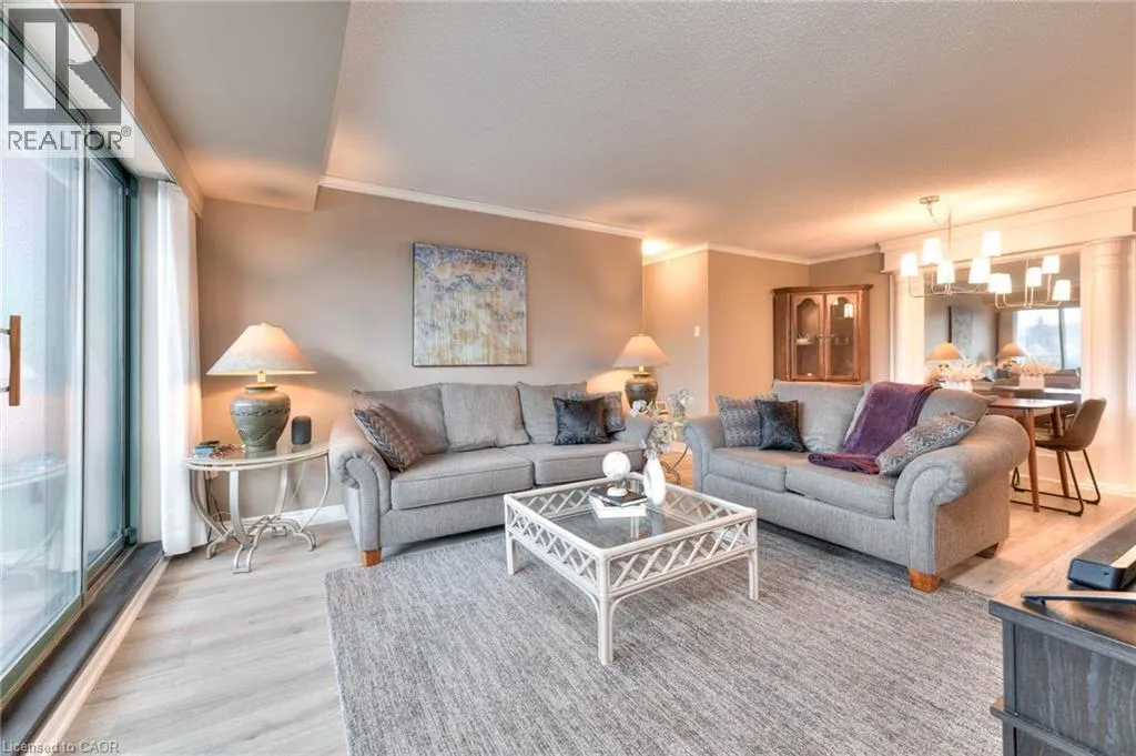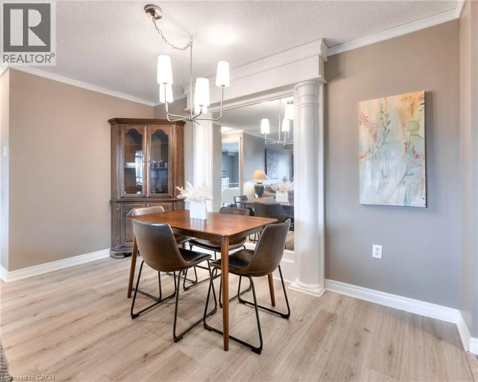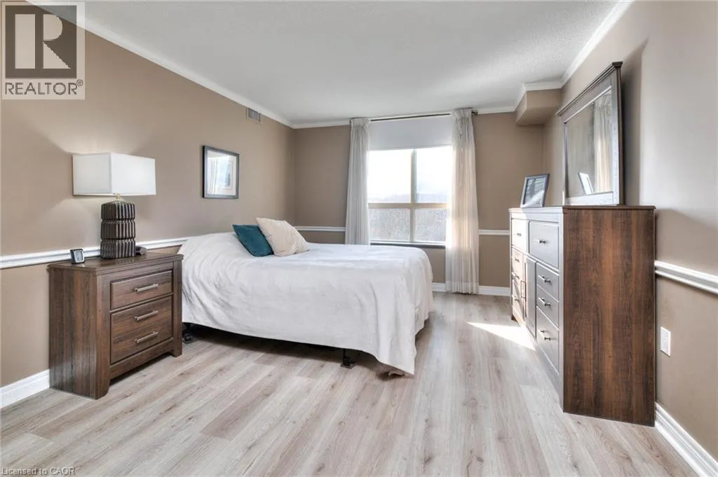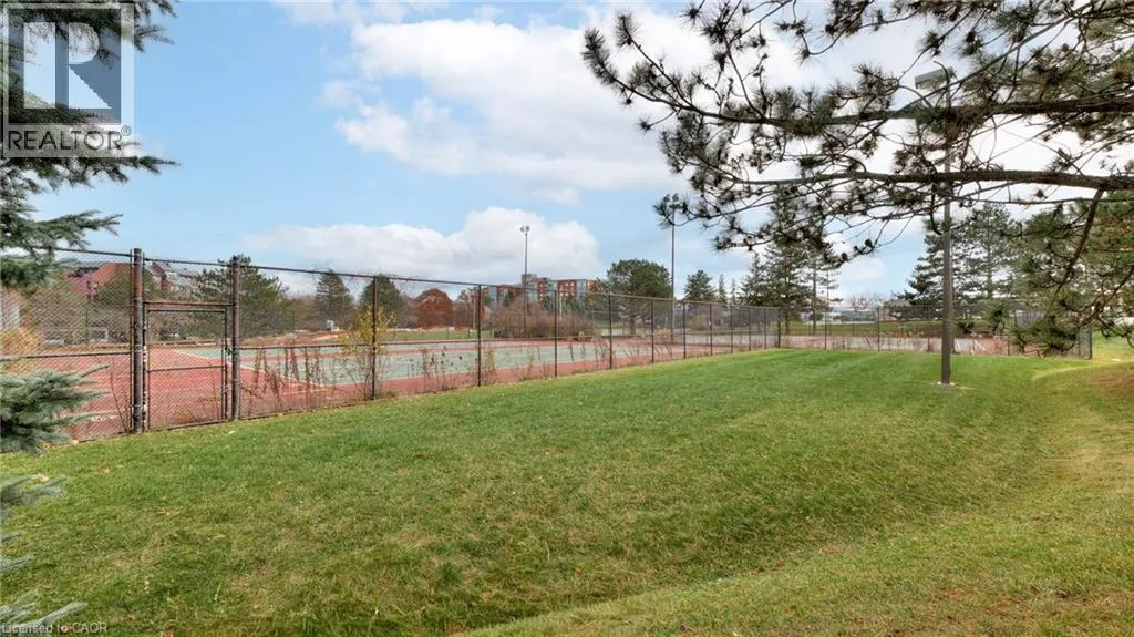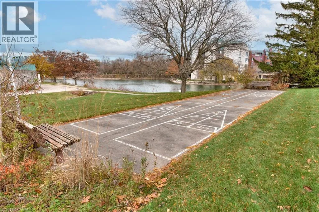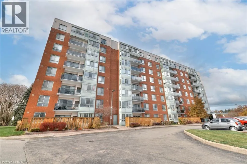 FROM CONESTOGA PARKWAY: Take a left off King St ramp, left on Blue Springs Drive This bright and inviting end unit condo features a desirable split-bedroom layout â with a bedroom and full bath on either side, offering comfort and privacy for family or guests. Meticulously painted with a warm neutral, upgraded with a durable wide plank flooring, tasteful lighting, and crown moldings. The bathrooms have a classic terracotta aesthetic with handy grab bars for stability. The kitchen is perfectly positioned to capture a spectacular view of the ponds, while the spacious living room and dining room opens onto a private balcony with a modern glass railing overlooking the serene setting with views of both ponds with cascading waterfalls highlighted by up lighting at dusk, a lovely place to watch for the birds and enjoy the sunsets. The primary bedroom features his-and-hers closets and a full ensuite bath, creating a peaceful retreat. The in-suite laundry is tucked neatly away in its own room. Enjoy carefree condo living with two parking spaces â one underground and one surface â plus a storage locker for added convenience. The building is known for its excellent management and warm community atmosphere, offering secure entry, an on-site superintendent, a cozy library, a party room, rooftop and ground-level BBQ areas, and a guest suite for visitors. Located in north Waterloo, youâll love the easy access to bus routes, the LRT, the expressway, and Conestoga Mall â plus walking and biking trails just outside your door. Comfort, convenience, and natural beauty await at Blue Springs. (id:27476)