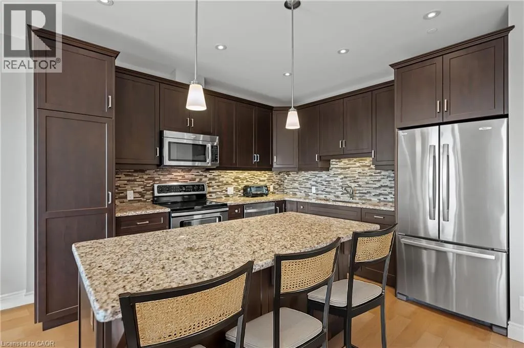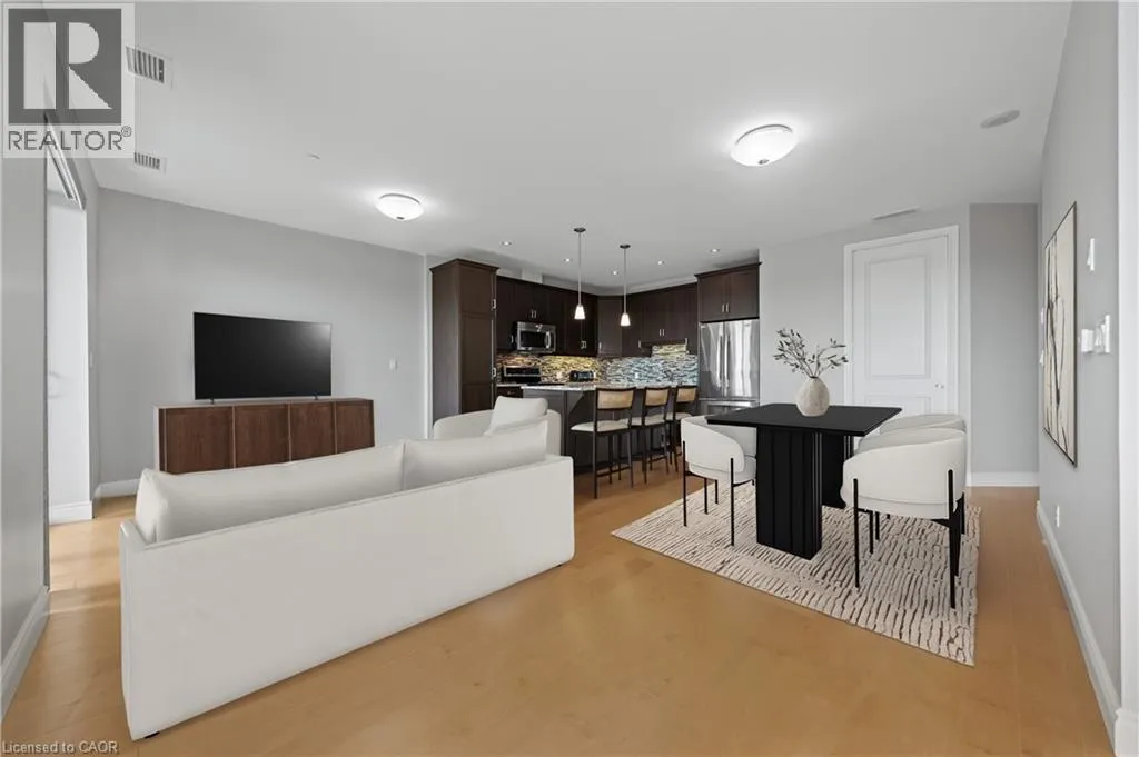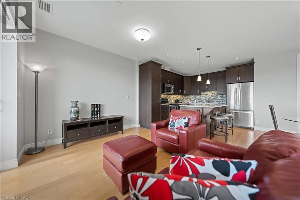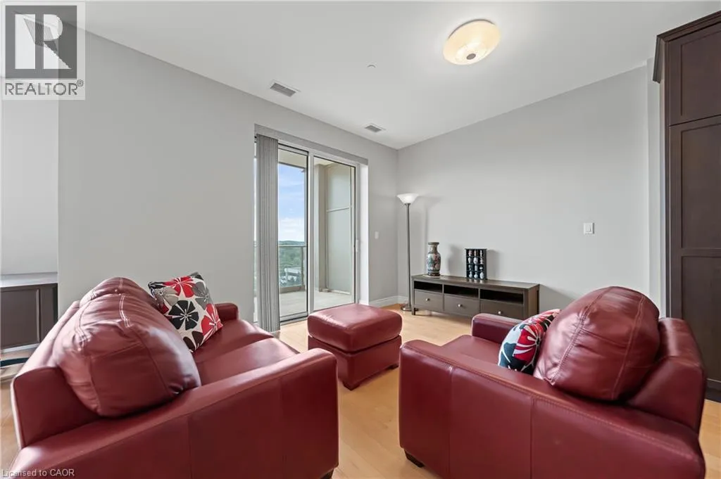 WESTMOUNT ROAD S TO ERB STREET W Experience upscale condo living at the Westmount Grand, one of Waterlooâs most prestigious addresses! This impressive west-facing 1-bedroom + den, 2-bathroom suite combines luxury, comfort, and convenience in the heart of Uptown Waterloo. Inside, youâll find 9â ceilings, a spacious open-concept kitchen with island, granite counters, stainless steel appliances, under-cabinet lighting, and a stylish backsplash. The expansive living and dining areas are framed by large windows, filling the space with natural light and showcasing panoramic city views. A bonus flex space offers the perfect spot for a home office. Hardwood flooring flows seamlessly throughout the main living area, adding warmth and elegance. The oversized primary bedroom is a true retreat, featuring a large window, dual closets, and a 5-piece spa-inspired ensuite. Additional highlights include a second full bathroom, in-suite laundry, and a storage room. Step out to the spacious covered balcony to take in spectacular sunsets! This unit also includes one underground parking space and one locker. Residents of Westmount Grand enjoy an array of first-class amenities: a rooftop terrace, library, fitness centre, sauna, entertainment room, and secure underground parking. Perfectly located, youâll be steps from Uptown Waterlooâs restaurants, shops, and parks, and just minutes from the University of Waterloo and Wilfrid Laurier University. Luxury, lifestyle, and locationâthis condo has it all! (id:27476)