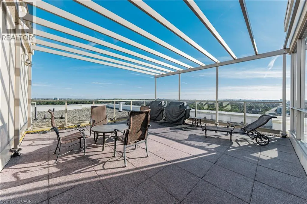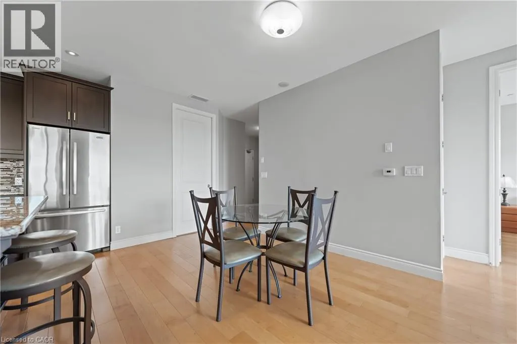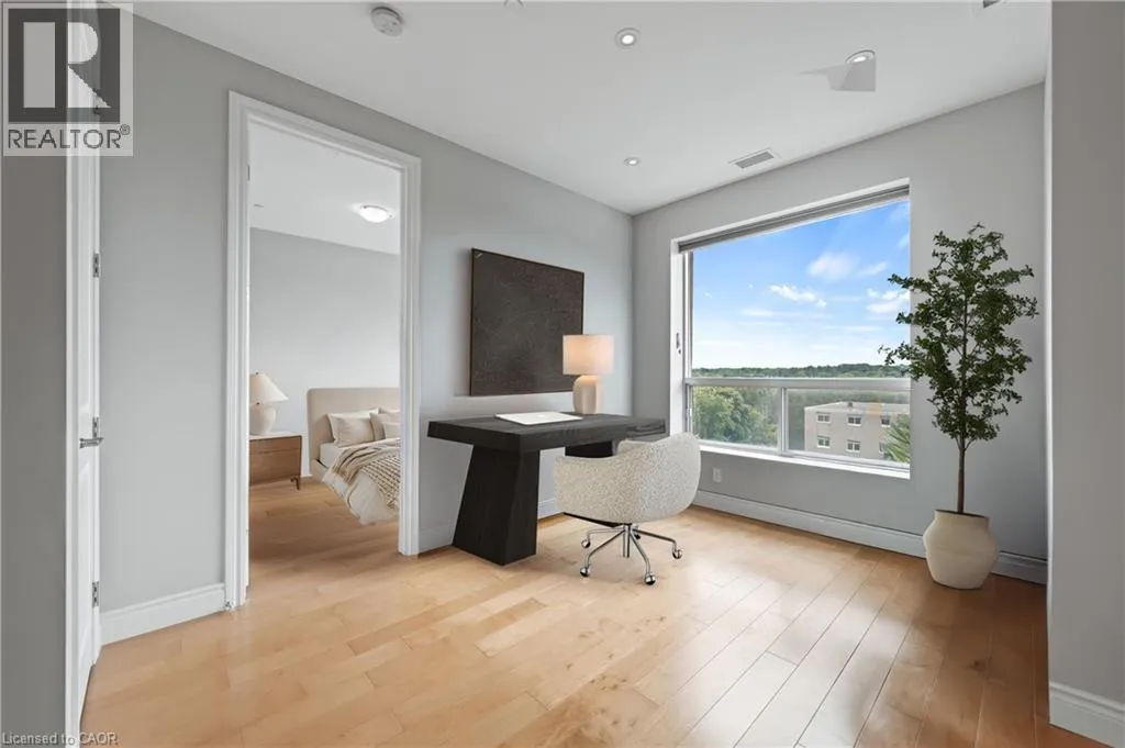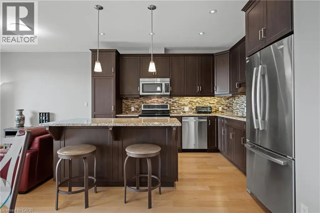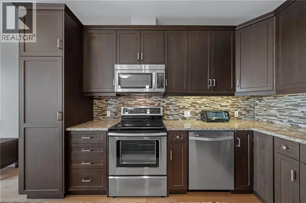 WESTMOUNT ROAD S TO ERB STREET W Experience upscale condo living at the Westmount Grand, one of Waterlooâs most prestigious addresses! This impressive west-facing 1-bedroom + den, 2-bathroom suite combines luxury, comfort, and convenience in the heart of Uptown Waterloo. Inside, youâll find 9â ceilings, a spacious open-concept kitchen with island, granite counters, stainless steel appliances, under-cabinet lighting, and a stylish backsplash. The expansive living and dining areas are framed by large windows, filling the space with natural light and showcasing panoramic city views. A bonus flex space offers the perfect spot for a home office. Hardwood flooring flows seamlessly throughout the main living area, adding warmth and elegance. The oversized primary bedroom is a true retreat, featuring a large window, dual closets, and a 5-piece spa-inspired ensuite. Additional highlights include a second full bathroom, in-suite laundry, and a storage room. Step out to the spacious covered balcony to take in spectacular sunsets! This unit also includes one underground parking space and one locker. Residents of Westmount Grand enjoy an array of first-class amenities: a rooftop terrace, library, fitness centre, sauna, entertainment room, and secure underground parking. Perfectly located, youâll be steps from Uptown Waterlooâs restaurants, shops, and parks, and just minutes from the University of Waterloo and Wilfrid Laurier University. Luxury, lifestyle, and locationâthis condo has it all! (id:27476)
