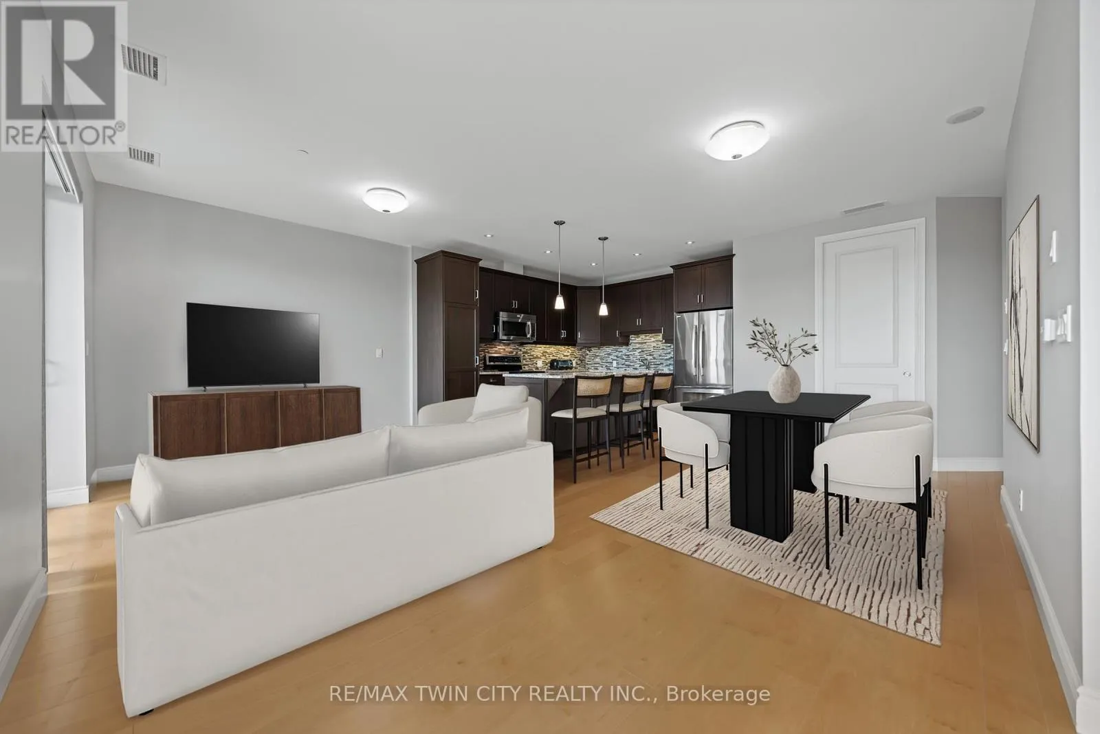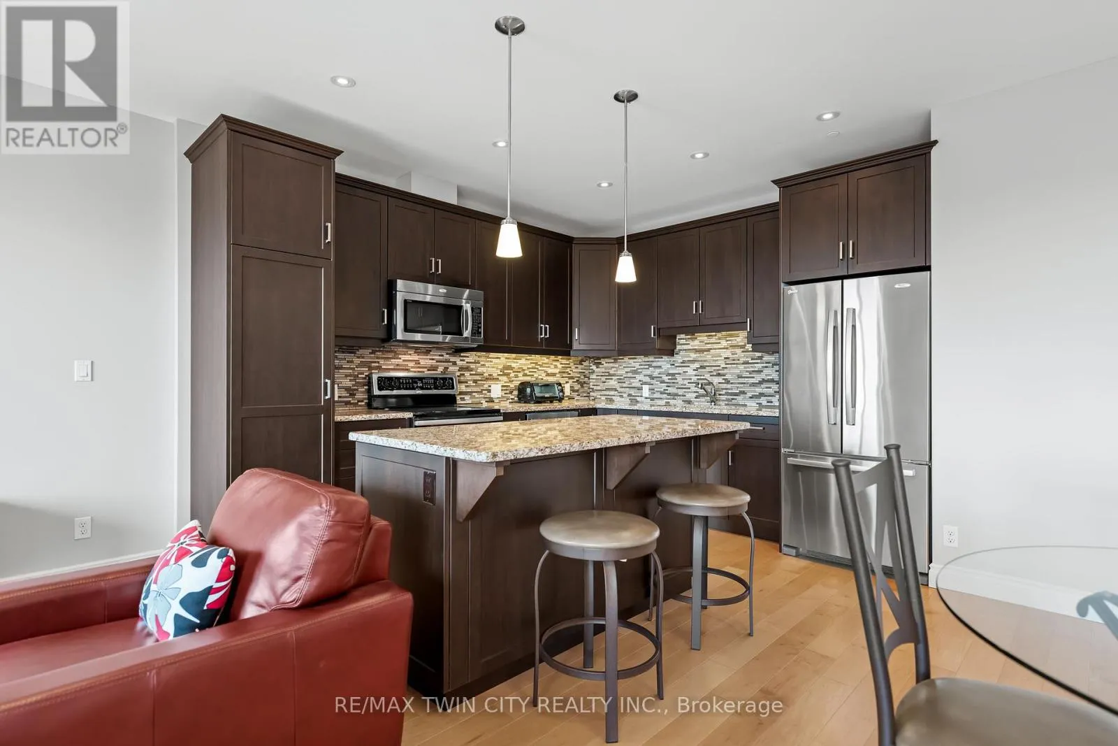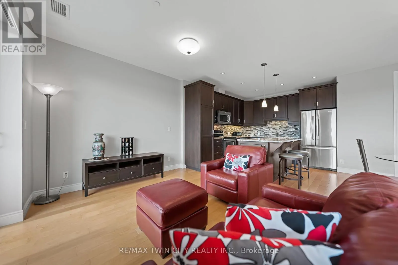 Cross Streets: WESTMOUNT ROAD S. ** Directions: WESTMOUNT ROAD S TO ERB STREET W. Experience upscale condo living at the Westmount Grand, one of Waterloo's most prestigious addresses! This impressive west-facing 1-bedroom + den, 2-bathroom suite combines luxury, comfort, and convenience in the heart of Uptown Waterloo. Inside, you'll find 9' ceilings, a spacious open-concept kitchen with island, granite counters, stainless steel appliances, under-cabinet lighting, and a stylish backsplash. The expansive living and dining areas are framed by large windows, filling the space with natural light and showcasing panoramic city views. A bonus flex space offers the perfect spot for a home office. Hardwood flooring flows seamlessly throughout the main living area, adding warmth and elegance. The oversized primary bedroom is a true retreat, featuring a large window, dual closets, and a 5-piece spa-inspired ensuite. Additional highlights include a second full bathroom, in-suite laundry, and a storage room. Step out to the spacious covered balcony to take in spectacular sunsets! This unit also includes one underground parking space and one locker. Residents of Westmount Grand enjoy an array of first-class amenities: a rooftop terrace, library, fitness centre, sauna, entertainment room, and secure underground parking. Perfectly located, you'll be steps from Uptown Waterloo's restaurants, shops, and parks, and just minutes from the University of Waterloo and Wilfrid Laurier University. Luxury, lifestyle, and location-this condo has it all! (id:27476)