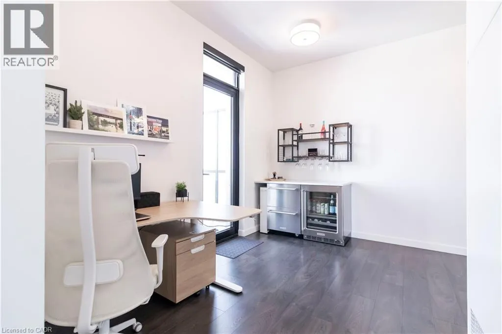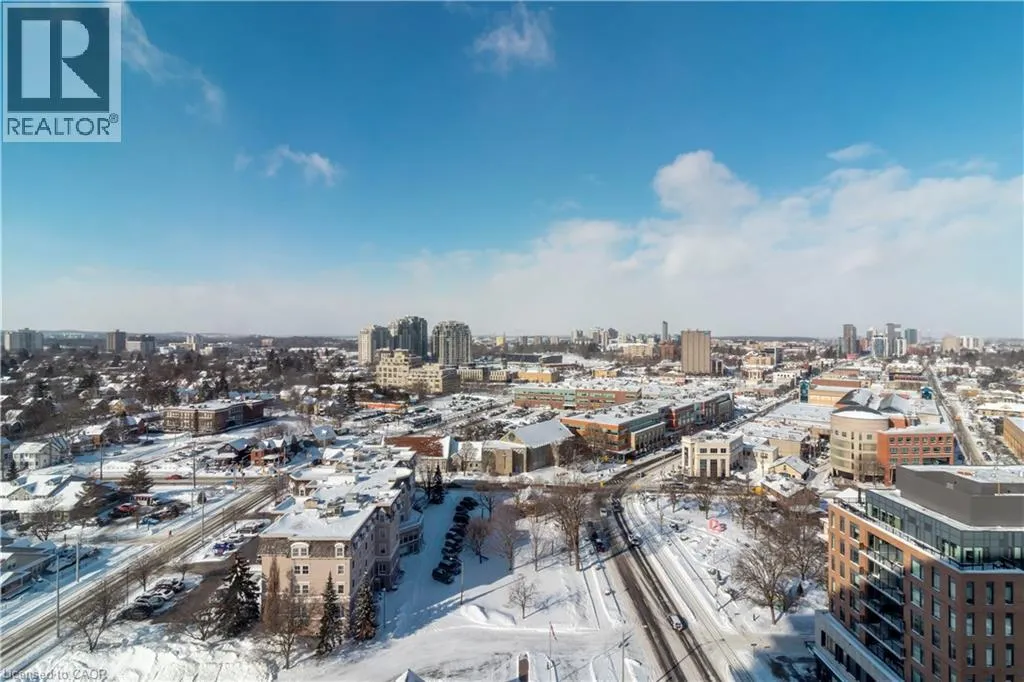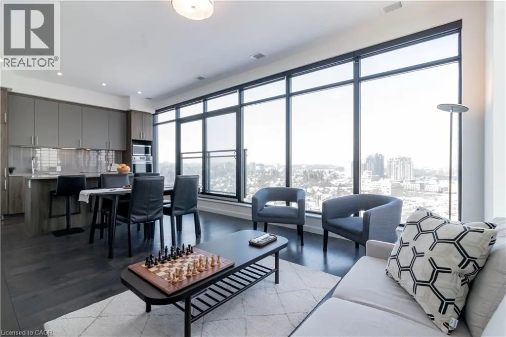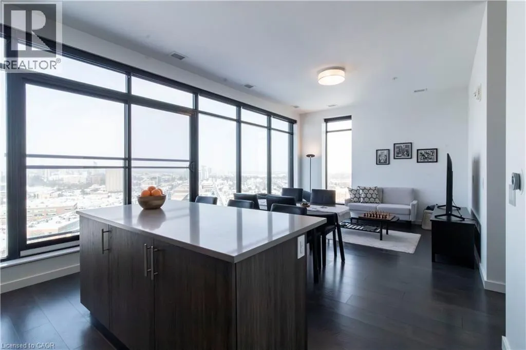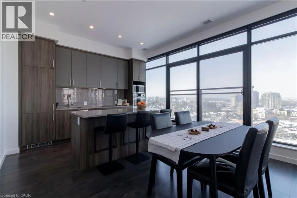 King Street S. between Allen Street W. and Caroline Street One of Uptown Waterloo's most prestigious condominium residences, Circa 1877 offers refined urban living at its best. A perfect blend of thoughtfully appointed luxurious interior living space with the convenience of 2 dedicated underground parking spaces, suite 1513 at 181 King St Waterloo checks all of the boxes. Immediately upon entry, the soaring 10 foot ceilings let you know this is not your typical 2 bedroom 2 bathroom condo. Offering 1250 square feet of interior living space, plus 2 private balconies, the north western panoramic views of the cityscape and nightly sunsets are impressive. Designed for both style and functionality, the expansive open-concept layout is filled with natural light and ideal for sophisticated entertaining. The chef-inspired kitchen features European built in appliances, quartz counters, and large kitchen island with ample seating. Flowing seamlessly into the living room and additional dining area, you are surrounded by floor to ceiling windows and premium carpet free flooring throughout the suite. Both bright and spacious bedrooms offer built-in wardrobes, commercial-grade automatic silver-screen roller sheers (throughout condo), offering additional blackout options in the bedrooms, and the primary bedroom features a 3 piece ensuite bath. Bonuses include a dedicated den space, bar area with KitchenAid beverage cooler/freezer plus wine fridge, WIFI thermostats and lighting controls for your convenience, insuite laundry, and private storage locker. Circa 1877 features unparalleled amenities including outdoor saltwater pool with cabanas and bbq, fitness centre, yoga space, co working space, and social lounge. You are able to enjoy one of Waterlooâs newest fine dining restaurants at your doorstep Lala Social House. Enjoy being steps from grocery stores including Vincenzoâs, upscale restaurants and bakeries, public transportation including the LRT, Waterloo Park, highway access, and Waterloo Town Square. (id:27476)
