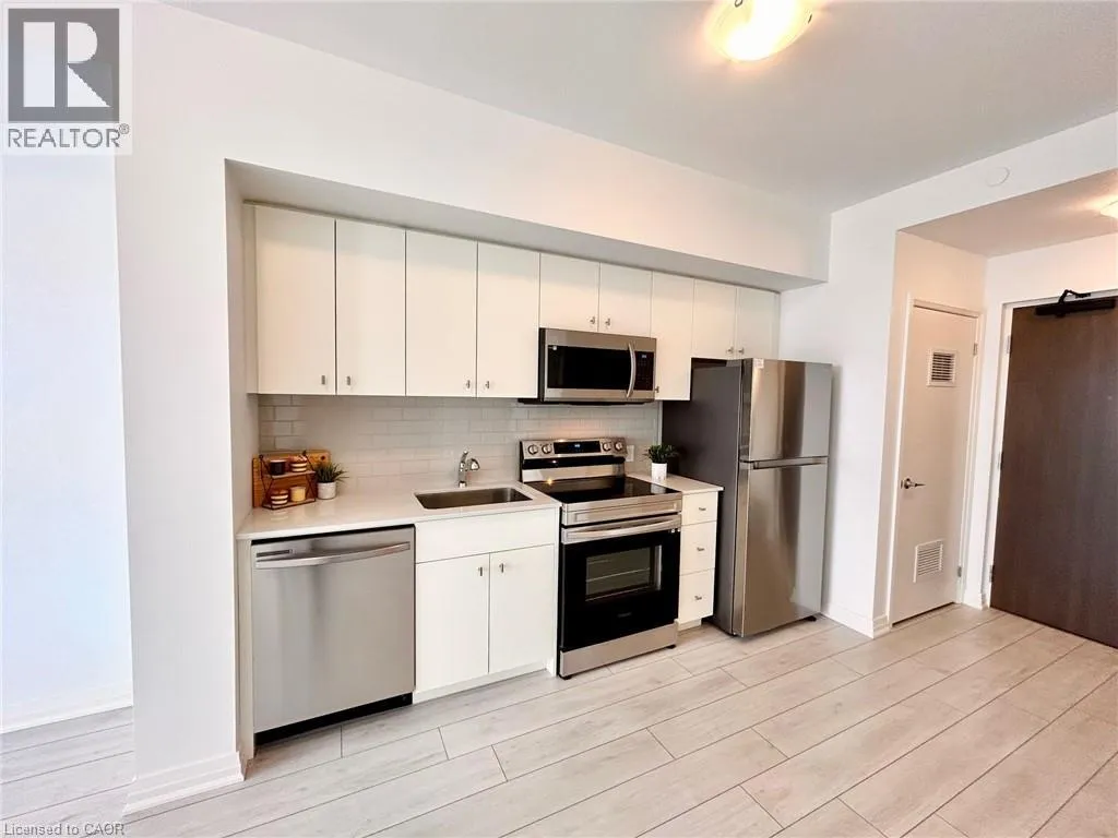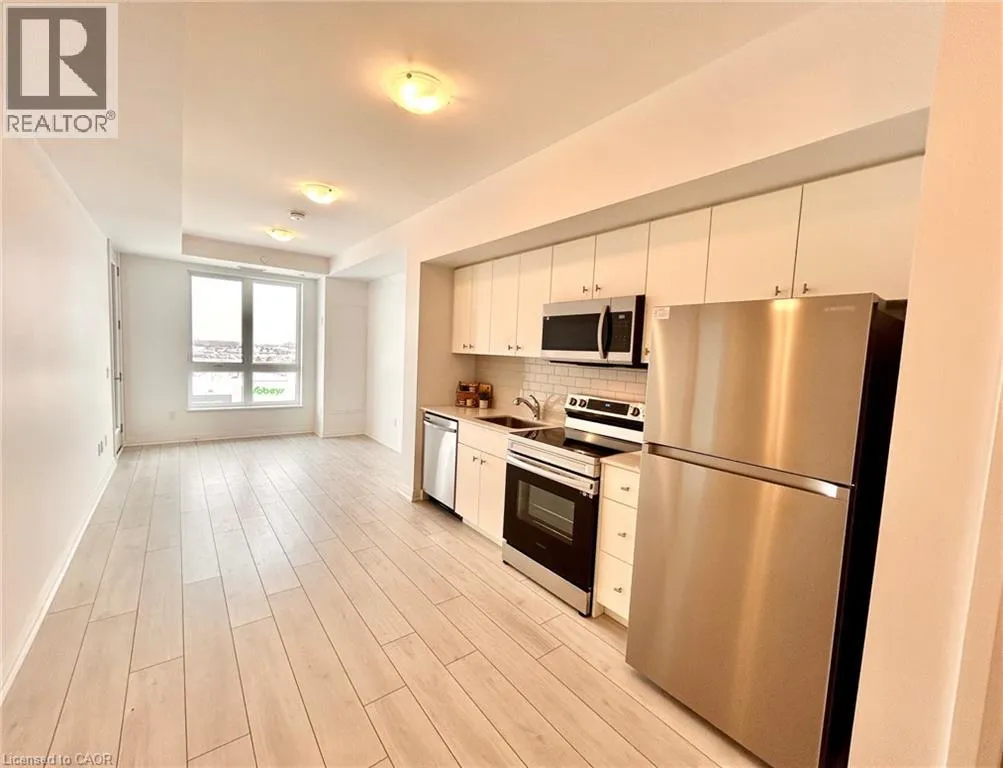 Northfield to Weber St N to Golden Eagle Road Welcome to THE JAKE! TOP FLOOR unit nestled above the city skyline. Eastern facing balcony overlooking Waterloo's Innovation corridor enjoys beautiful sunrises and all day light as it pours into this open concept modern living space. Neutral and contemporary finishes throughout. Flowing kitchen enjoys quartz counters, oversized stainless sink, over the range microwave, stainless stove and dishwasher. Layout offers great space for your kitchen table and cozy living room set up. Carpet free unit presents 1 bedroom and a full 4pc bathroom. One designated parking space located in the UNDERGROUND parking garage and is steps away from the elevator. Close to Nature and City this North Waterloo location offers many amenities for you to explore and is walking distance from your building. Great selection of dining experiences, regional mall, public transit, LRT, schools, shopping, Laurel Creek Conservation area offering camping, hiking, trails and picnic area. St Jacob's market is but a stone's throw away from the building! Technology at work here. No keys needed as this building is equip with wireless entry! Gym lovers, enjoy the exercise room offering the Peloton experience. Available April 1, 2026. (id:27476)