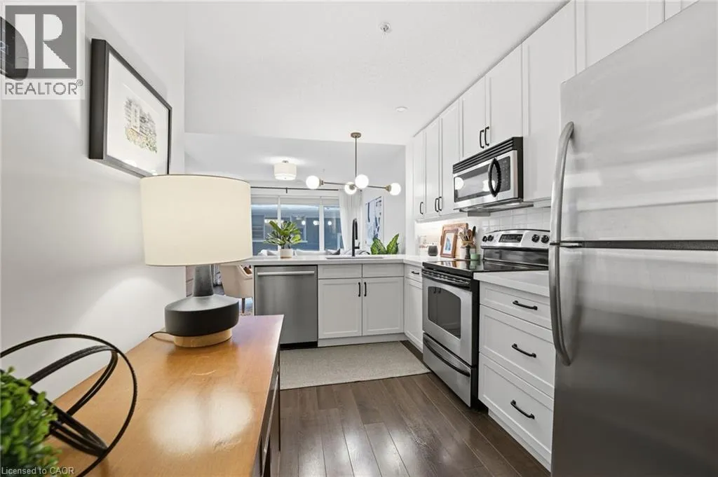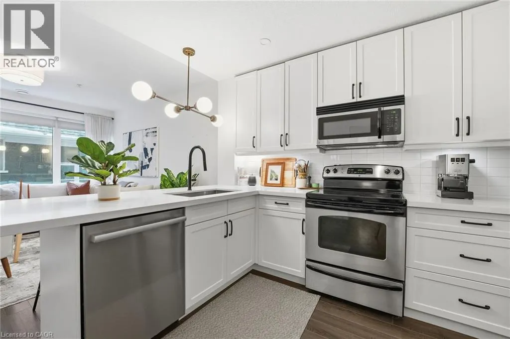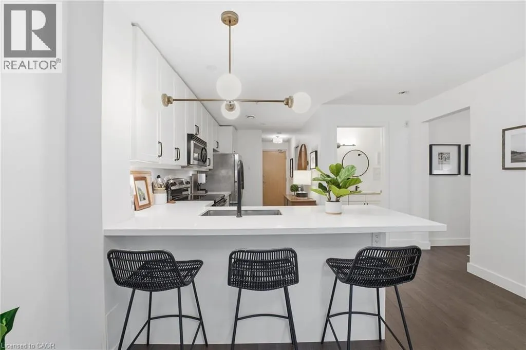 King to Allen. Street parking available on Allen just past the building. Discover the perfect blend of modern sophistication and boutique charm in this oversized 1-bed plus den suite at 188 King St. S. Situated in one of Uptown Waterlooâs most sought-after mid-rise buildings, Unit 210 offers a refreshing alternative to high-density living. This home is designed for those who value space and quiet, featuring a layout optimized for both daily comfort and effortless entertaining. The heart of the home is a stylish, updated kitchen boasting crisp white cabinetry, a functional breakfast bar, and stainless appliances. Natural light pours through the living area, highlighting the contemporary finishes. The primary bedroom is a true standout, offering more square footage than standard condo layouts and a walk-in closet. For those working from home or hosting guests, the versatile den features a pocket door, providing instant privacy without sacrificing floor space. The bathroom serves as a spa-like retreat with a double vanity and sleek fixtures. Life at The Red is defined by effortless access. This unit is uniquely positioned on the same floor as the buildingâs gym, amenity room, and your private storage locker, eliminating the need for elevators during your daily routine. Parking is equally convenient in the above-ground garage, featuring EV charging access. Step outside and immerse yourself in the vibrant energy of Uptown Waterloo. You are within a 5-minute walk of Vincenzoâs, Mary-Allen Park, and the shops and restaurants Uptown. Also with the LRT stop directly at your doorstep, the entire region is accessible in minutes. Enjoy the peace of a quiet, well-insulated building with the luxury of being steps away from dining, summer pop-up markets, local events, and boutique shopping. Experience the quiet community feel of a mid-rise building with all the perks of a luxury urban residence. Most furnishings can also be included, making this a great option for someone looking for a fresh start. Schedule your private viewing today. (id:27476)
