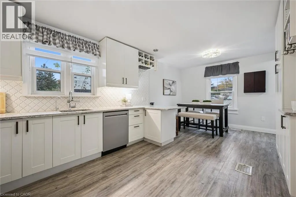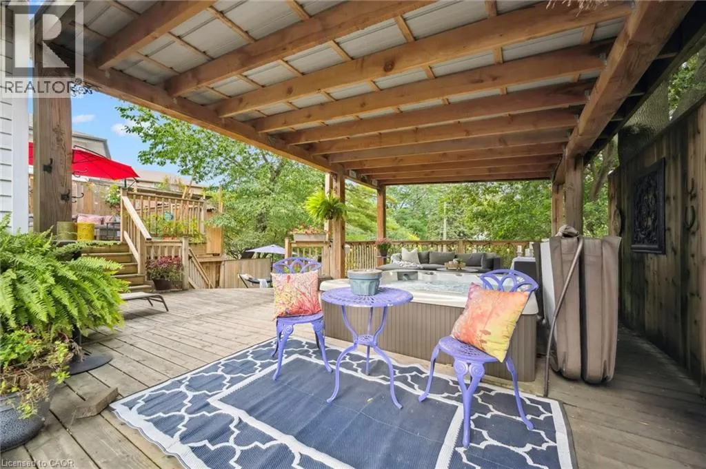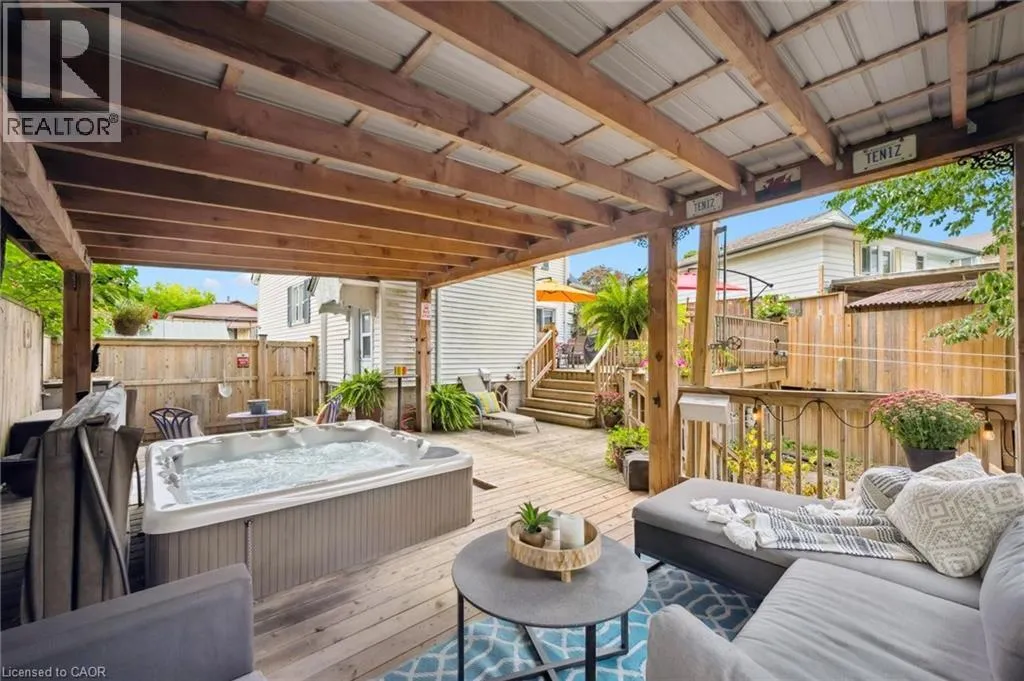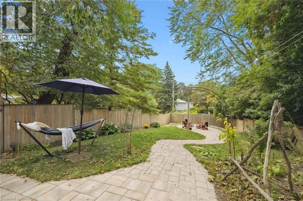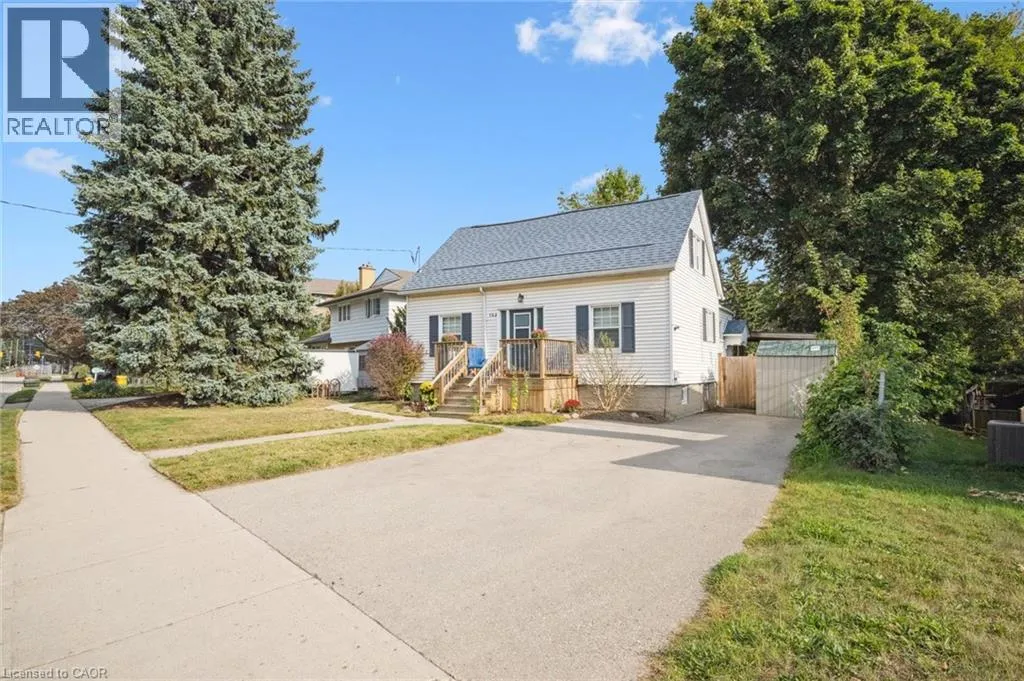 Bridgeport (one way), pass Ellis, on the left Welcome to 145 Bridgeport Rd E, where modern elegance meets investment potential! With a newly renovated bathroom and sleek lower level flooring, this charming one-and-a-half-story detached home is the ultimate opportunity for first-time homebuyers seeking a mortgage helper, families needing an in-law suite, or savvy investors eyeing a lucrative rental opportunity. A stunning large spruce tree in the front yard provides unique privacy while maintaining easy access to all the conveniences of Bridgeport Rd. The double-wide driveway accommodates five vehicles, ensuring ample space. Step into your fully fenced backyard, featuring an expansive 870 sq ft of deck space adorned with a 24ft custom gazebo and a luxurious eight-seat Beachcomber hot tub (2020) perfect for unwinding after a long day. An interlock stone path leads to a beautifully designed stone patio, complete with a retaining wall and efficient drainage. Enjoy lushly landscaped gardens, a built-in garden shed, and a two-level deck that offers a serene escape with stunning park-like views. As you step inside, enjoy an open floor plan filled with natural light and newly renovated living spaces. Patio doors seamlessly connect the indoor and outdoor living areas. All windows and doors were replaced in 2022, enhancing aesthetics and energy efficiency. The main floor kitchen (2022) shines with elegant quartz countertops, a breakfast bar, cozy coffee nook, a stylish tile backsplash, and abundant cupboard space. On the second level, youâll find two generously sized bedrooms with original cherry wood floorboards, fresh paint throughout, and extensive attic storage. The lower level features new flooring, a separate entrance, laundry, and a newly renovated three-piece bath (2023). This rare property is move-in ready and minutes from uptown Waterloo, restaurants, grocery stores, schools, and the LRT. (id:27476)