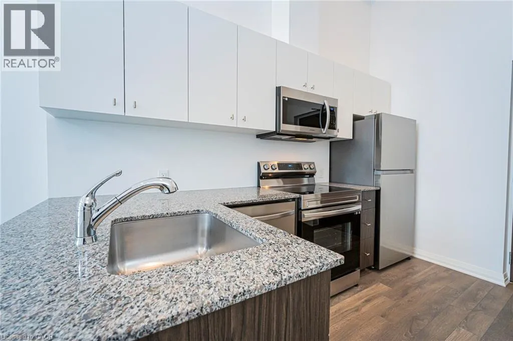 WEBER ST N AND GOLDEN EAGLE ROAD AVAILABLE IMMEDIATELY! SURFACE PARKING INCLUDED! Welcome to Urban Comfort at The Jake Condos in North Waterloo's Lakeshore Neighbourhood! Step into the extraordinary with this exceptional 1 Bedroom Ground-level condo, boasting a unique blend of style, convenience, and modern living. Situated in one of Waterloo's most coveted neighbourhoods, this residence offers an array of amenities within easy reach and features impressive 14-foot ceilings that create an atmosphere of spaciousness and grandeur. The thoughtfully designed floor plan maximizes efficiency and comfort, with natural light pouring into the open-concept living space, highlighting every detail. This immaculate unit's kitchen comes equipped with sleek cabinetry, stainless steel appliances, and an expansive countertopâperfect for meal preparation and entertaining. And when it comes to location, convenience is key. Imagine starting your day with a morning pick-me-up from Starbucks or Tim Hortons just steps away. Countless dining options await your exploration, and with easy access to transit, including the LRT and bus stops, navigating the city or commuting to work is effortless. Sobeys across the street caters to your grocery needs, while nearby amenities like banks and the vibrant St Jacobs Farmers Market add to the neighborhood's charm. With its unbeatable location, efficient design, and access to a world of amenities, The Jake Condos provides the perfect backdrop for everyday living. Don't miss the chance to make this urban rental oasis your own! (id:27476)