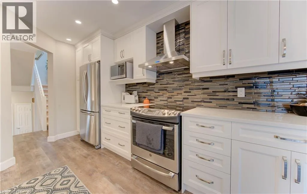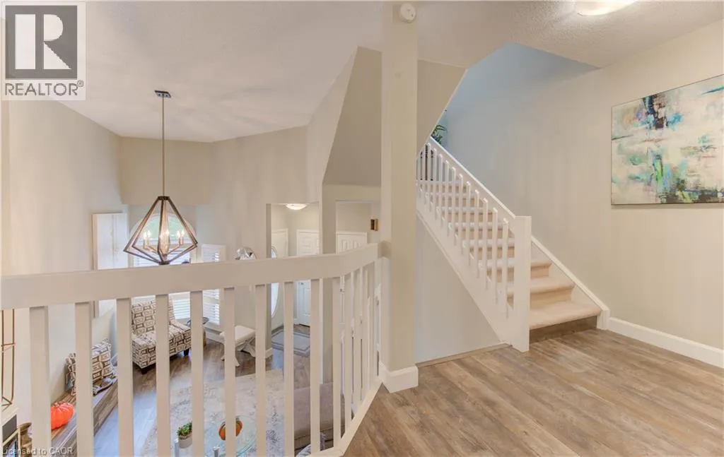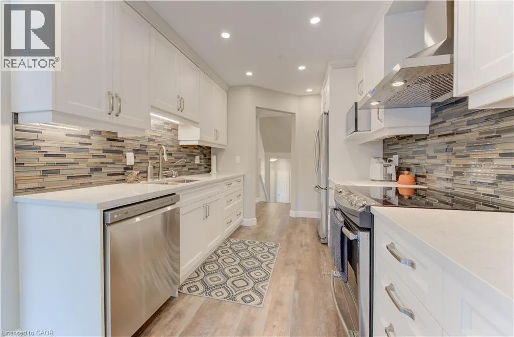 West off Weber St. onto Benjamin Rd., First entrance on south side. Welcome to Treetops, one of Waterlooâs most desirable condominium communitiesâan established enclave known for its mature trees, peaceful surroundings, and exceptional sense of community. Tucked just off Benjamin Road, this location offers the perfect balance of nature and convenience, with shopping, restaurants, St. Jacobs Farmersâ Market, and expressway access all just minutes away. Unit 61 offers a beautifully updated multilevel back-split that was completely renovated in 2018, blending timeless design with modern comfort. The bright and inviting living room features luxury vinyl plank flooring and cozy gas fireplace. Multiple skylights and big windows fill the home with natural light. The dining area is accented with elegant California shutters, while the eat-in kitchen showcases quartz countertops, classic white cabinetry, a stainless steel range hood, and a walkout to a generous private deckâideal for morning coffee, summer BBQs, or quiet evenings outdoors. Thoughtful features throughout the home include a water softener, central vacuum, reverse osmosis water system, mirrored closet doors, and a distinctive octagonal window that adds architectural character. The main level also offers a convenient two-piece powder room, while the finished lower level provides flexible living space perfect for a home office, media room, or guest bedroom. A single garage with additional driveway parking adds everyday convenience. Residents of Treetops enjoy a welcoming community atmosphere along with access to excellent amenities, including an outdoor heated pool, tennis and pickleball courts, a sauna, and a community centre for private gatherings. Outdoor enthusiasts will appreciate nearby walking and cycling trails, while the St. Jacobs Market, Conestoga Mall, and Uptown Waterlooâs vibrant dining and shopping scene are minutes away. At Treetops youâre not just buying a homeâyouâre embracing a lifestyle defined by comfort, community, and convenience. Book your showing today. (id:27476)