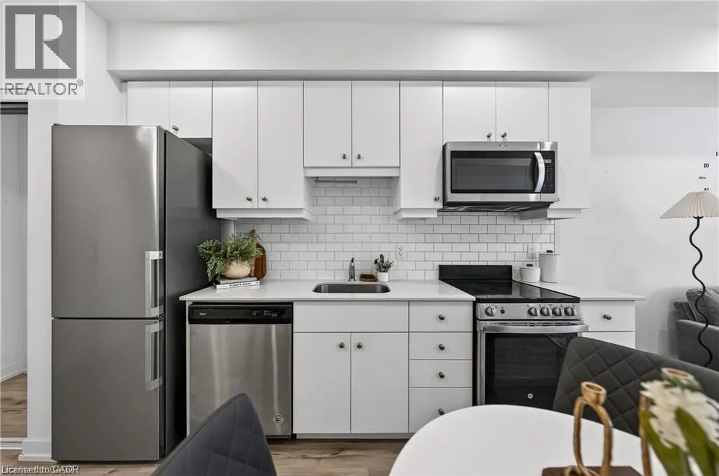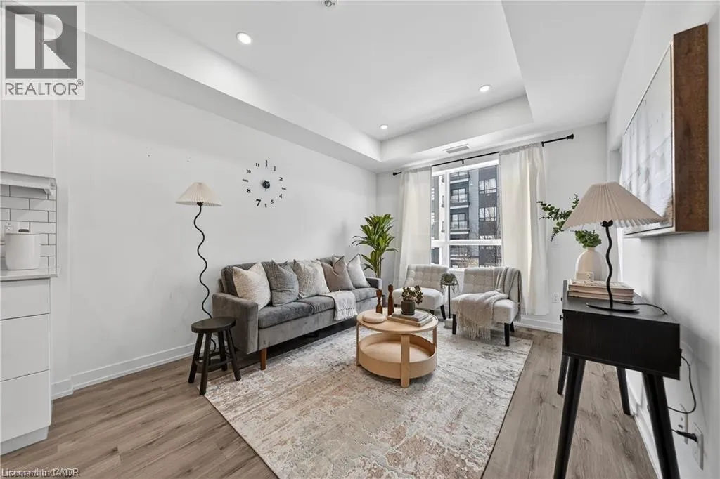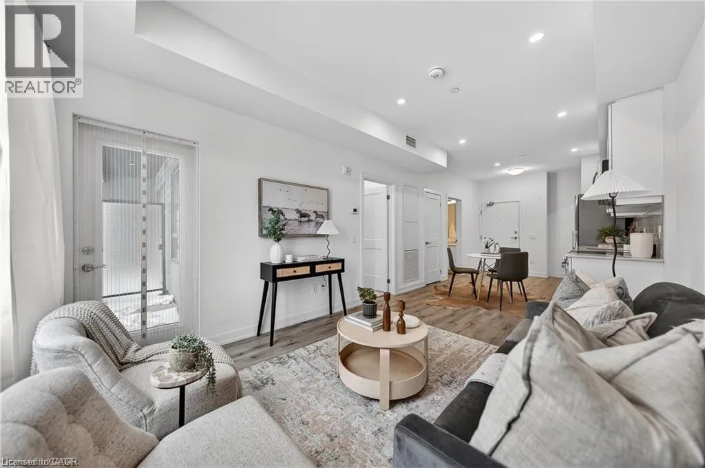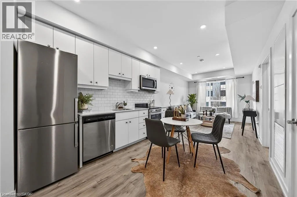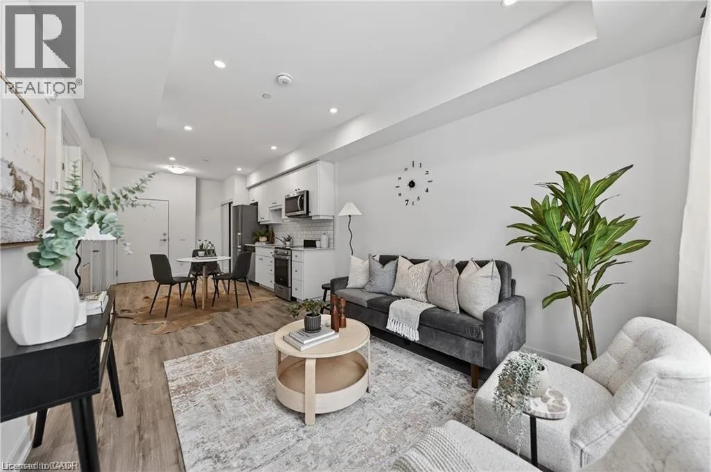 Northfield at Bridge Available MAY 1st! Discover low-maintenance, modern living in the heart of Waterloo. Unit 210 at the Blackstone is a bright, airy 1-bedroom, 1-bath condo offering 573 sq ft of comfortable space. Tall ceilings and built-in blinds enhance the open-concept layout. The kitchen is equipped with stainless steel appliances, durable stone countertops and a contemporary tile backsplash, flowing into the cozy living area with walkout to a private balcony - perfect for morning coffee or evening relaxation. The carpeted bedroom includes a roomy walk-in closet and the 4-piece bathroom is well-appointed. Practical conveniences include in-suite laundry, a storage locker and one underground parking space. The building elevates daily living with plentiful amenities: rooftop terrace with BBQs, exercise room, courtyard with BBQ and firepit, party/study room, bike room and visitor parking. Ideally situated close to Conestoga Mall, grocery stores, restaurants (including Browns Socialhouse), St. Jacobs Market, walking trails and public transit. Ideal for professionals or anyone seeking a well-located, amenity-rich rental in Waterloo. (id:27476)