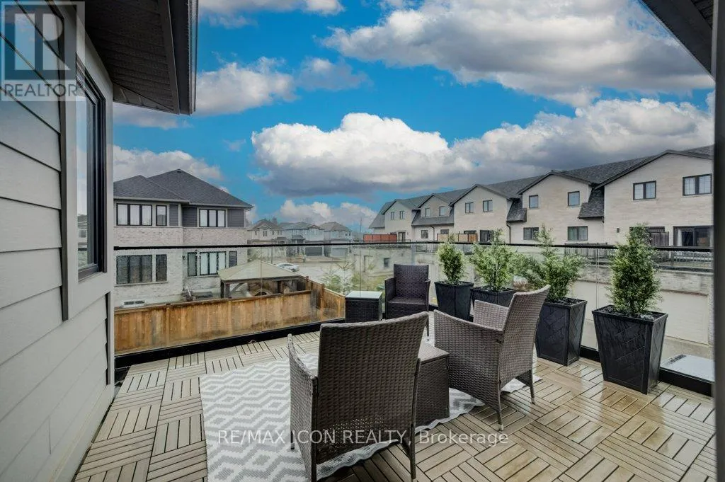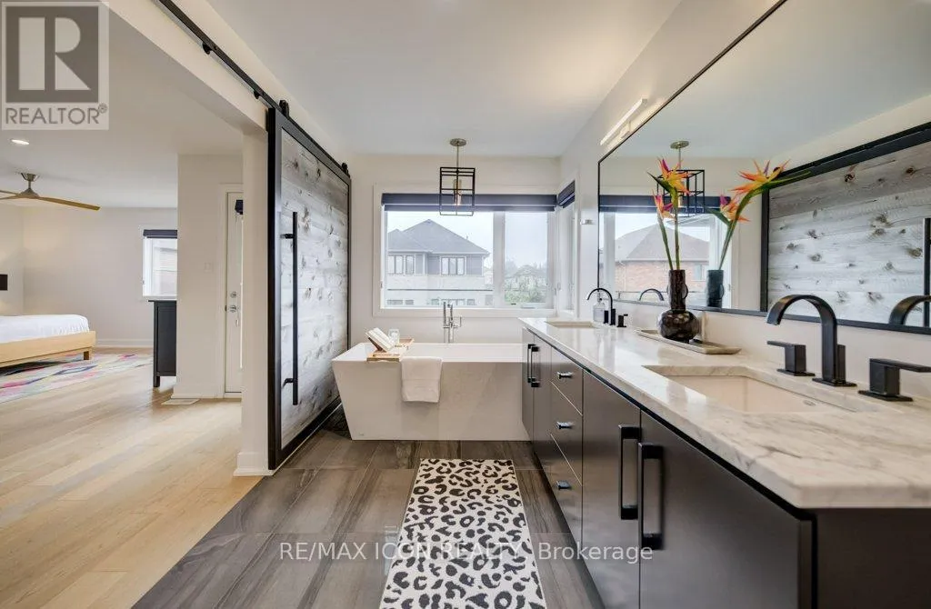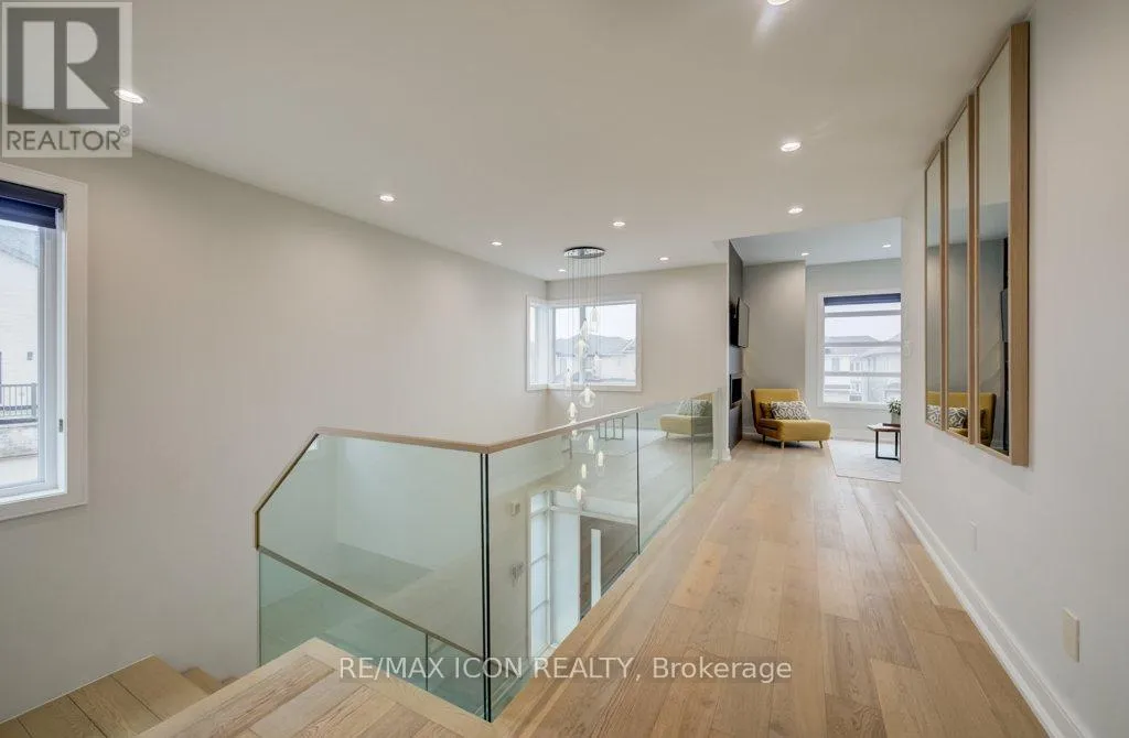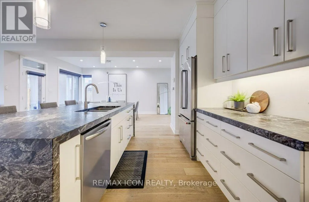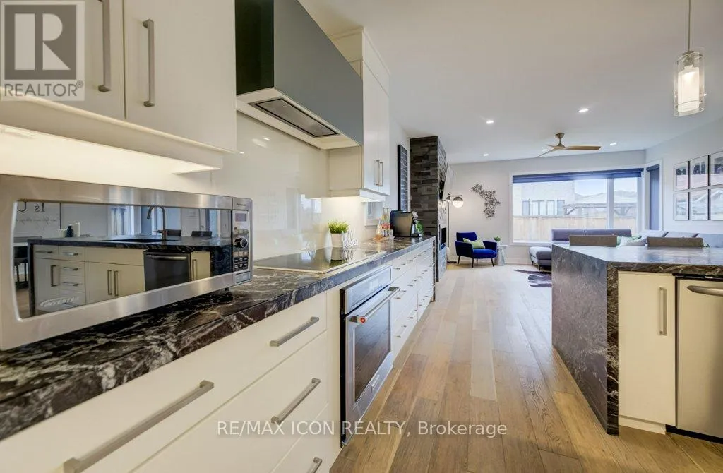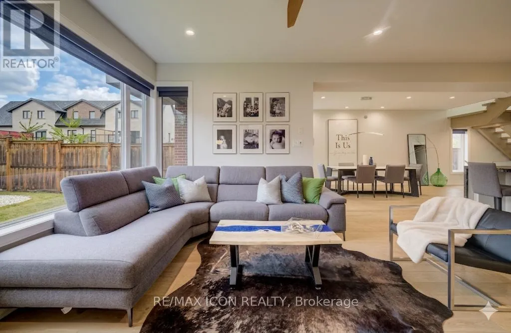 Cross Streets: Woolwich St. ** Directions: University Ave E to Woolwich St to Carriage Way. Custom-built by award winning custom home builder John Welton of Sunvale Homes this modern masterpiece in Waterloo's prestigious Kiwanis Park neighborhood offers a lifestyle defined by luxury and convenience. Located just minutes from Highway 85 and premium amenities, the home greets you with a sophisticated open-concept design with seamless flow. The breathtaking foyer features a soaring ceilings and a striking floating staircase with custom glass railings. The home's open-concept heart flows into a chef-inspired kitchen anchored by leathered granite waterfall countertops, a sensor-activated faucet, and stainless appliances. Adjacent, a sleek laundry suite with garage access is cleverly tucked behind a custom glass sliding door. The living room, anchored by a gas fireplace, serves as a gathering hub that transitions seamlessly to the dining room and covered outdoor porch with privacy screen. Enter the primary suite through a custom oversized wooden swing door to find a retreat featuring a private balcony, a sprawling walk-in closet, and a spa-inspired 5-piece ensuite boasting a massive three-shower-head walk-in shower, a deep soaker tub, and elegant marble finishes. A loft, complete with gas fireplace, custom built ins and tinted privacy-glass balcony, offers a secondary lounge or office/flex space while two additional plush bedrooms provide ample comfort for family or guests. The finished basement serves as the ultimate entertainment hub, complete with a projector and screen, a full bathroom, and a spacious fourth bedroom with walk in closet and custom storage. No detail was spared in the finished garage which functions as a showroom or gym with integrated heating, an EV charger, recessed pot lights, and rubber flooring. From the sleek architectural lines to the trails of the Grand River, Kiwanis park with outdoor pool, dog park and more just steps away, this 4 bed, 3.5 bath home represents a rare opportunity to own a work of art in a premier community. (id:27476)