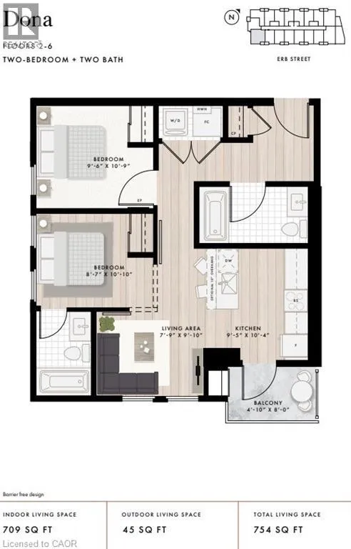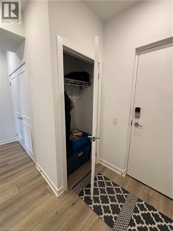 Welcome to your new home at Moda in Waterloo! This is a 2 year old boutique condo building offering contemporary living, just minutes to Uptown or UW/Laurier. This 5th floor corner 2 bedroom, 2 full bathroom suite features 709 sq. ft. of interior space and a 45 sq. ft. private balcony, creating a comfortable and stylish urban home. The open-concept kitchen and living area is bright and cozy. The modern kitchen features beautiful white quartz countertops, stainless steel appliances, white herringbone tiled backsplash, and dark cabinetry. The unit features a warm brown tone vinyl flooring, with a dark marble style tile flooring in the bathrooms. The primary bedroom is generously sized and the second bedroom works well for a variety of uses with an ensuite/second bathroom - either a home office, spare bedroom, child's bedroom or cozy retreat room. The in-suite laundry closet adds everyday convenience, along with use of a designated underground garage parking spot. Residents have access to the pet wash, bike repair set, co-working space, and party room. Ideally located near shopping, dining, transit, universities, and everyday amenities. Book today to see your new home in person! (id:27476)