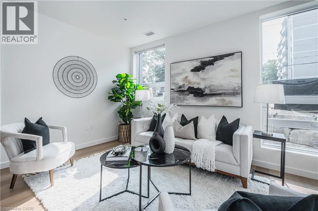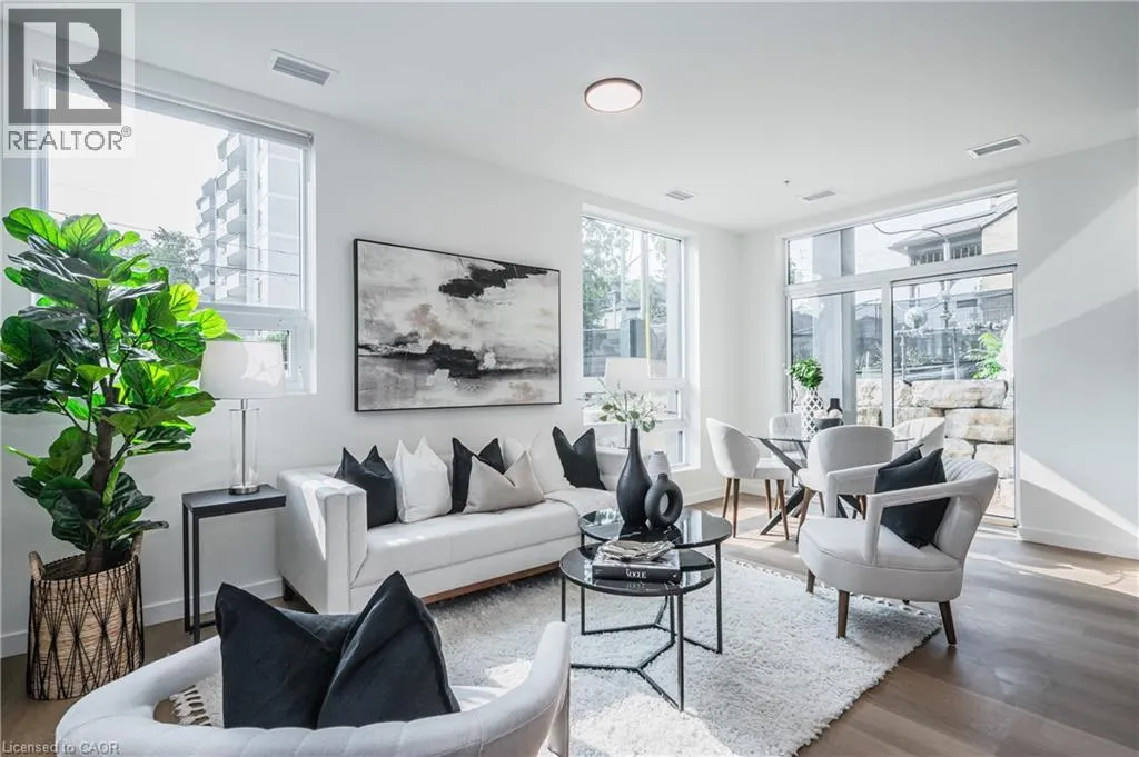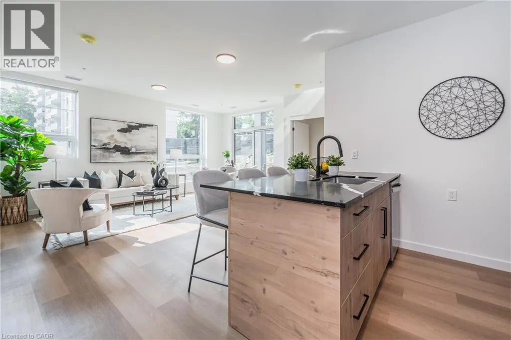 KING AND UNION STRIDE on Union! Welcome to elevated living in Mary Allen, walkable to Uptown Waterloo and Belmont Village. This upscale purpose-built rental building is finished to the highest quality. The 1 bed, 1 bath John floor plan is an executive corner unit featuring luxury finishes, 5-pc cheater ensuite, and walk-in closet. This suite is outfitted with luxury vinyl plank, splendid noir quartz countertops in the kitchen, along with black lower cabinetry and wooden style upper cabinetry, anatolia davenport ash tile in the bathrooms, white subway tile, and sleek black hardware throughout. Steps from Mary Allen Park, the Spur Line trail, Vincenzo's boutique grocer, the LRT, LCBO, Grand River Hospital, and all the amazing restaurants and retail you would come to expect: Arabella, Janet Lynn's Bistro, Casa Rugantino, Beertown, and so much more - an amazing opportunity for spacious living in an unbeatable location! Utilities are extra, high-speed Internet included. 1 year free storage!Get in touch for more information! Photos are of the model suite, showing similar finishes. (id:27476)