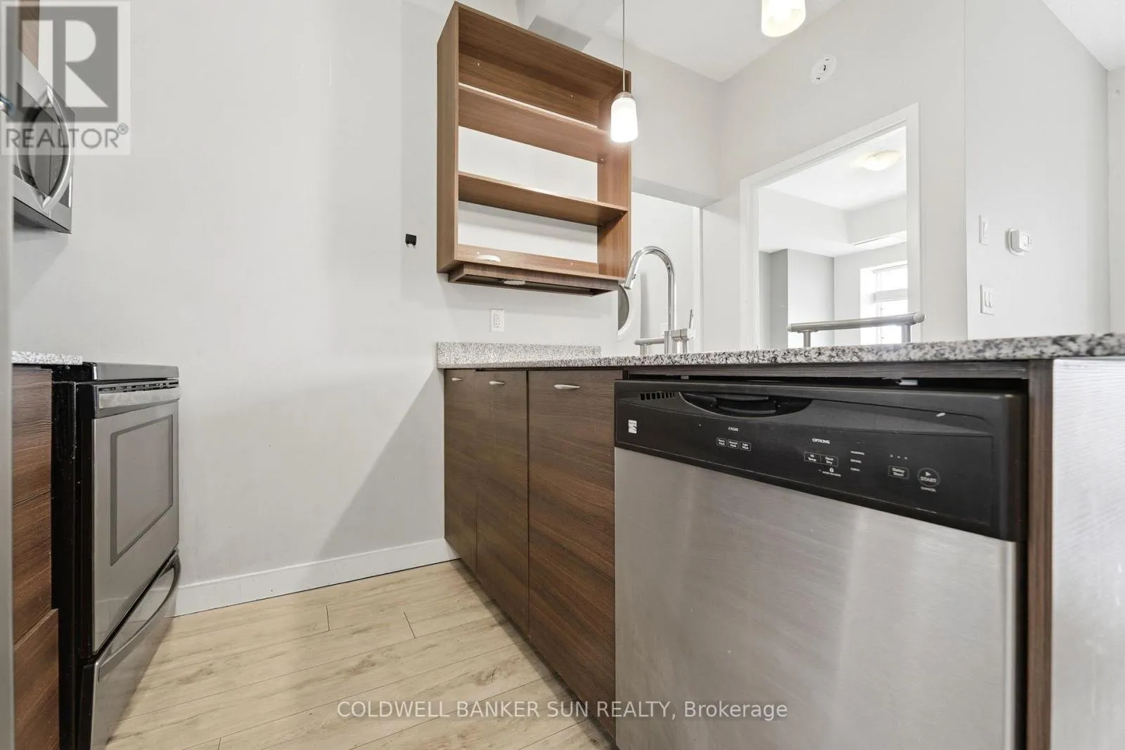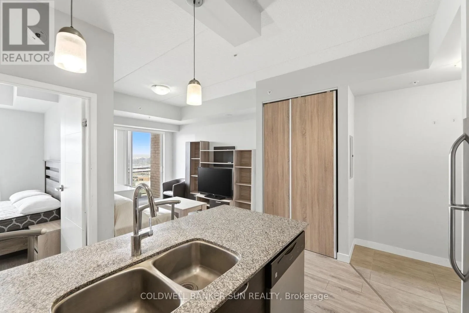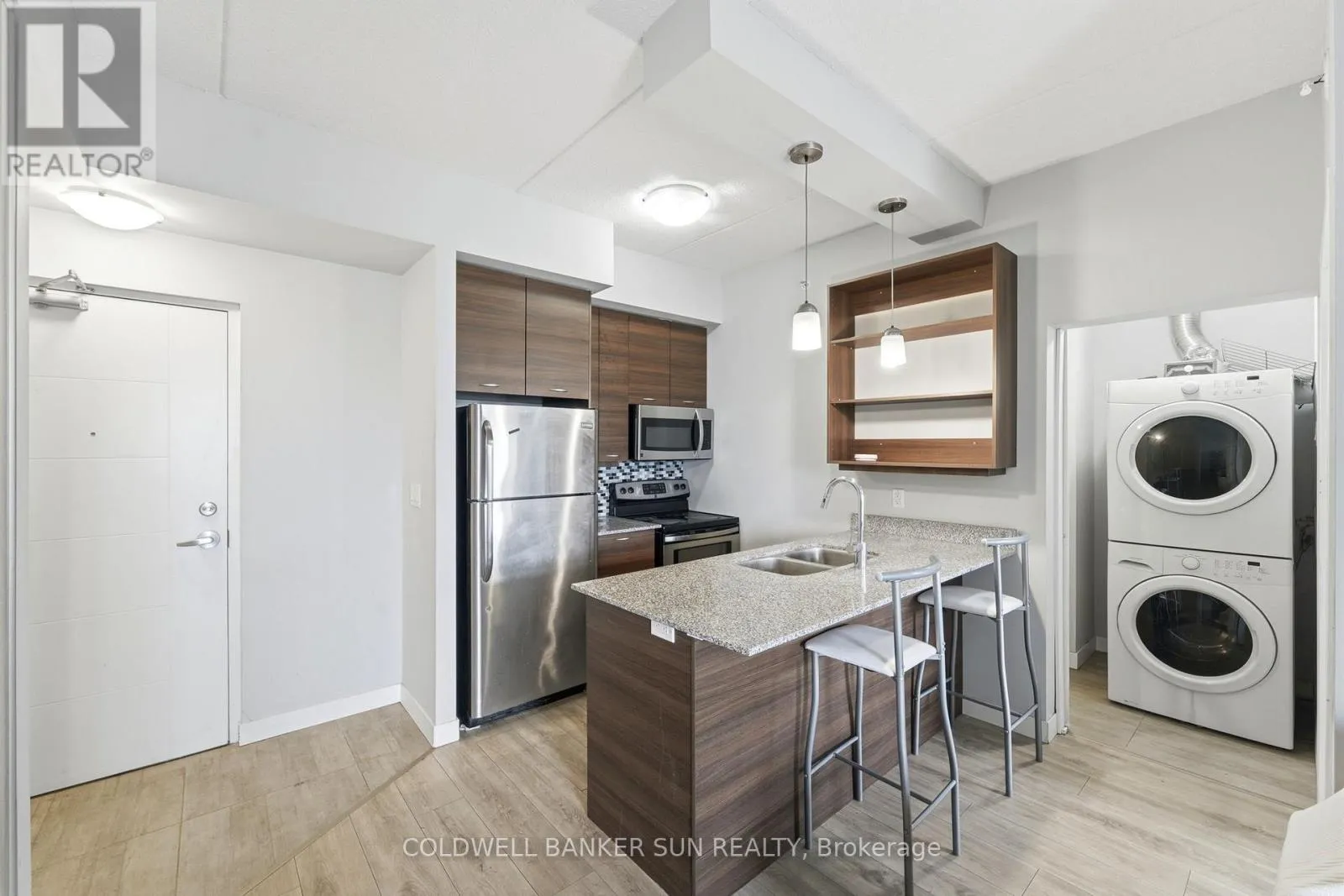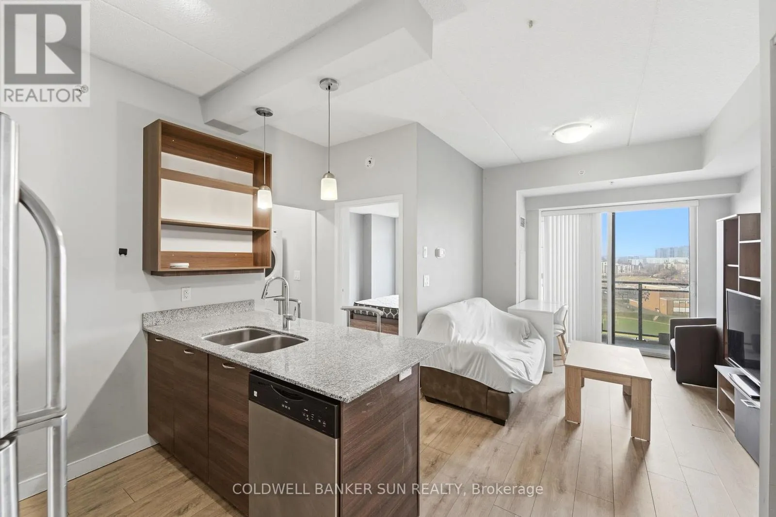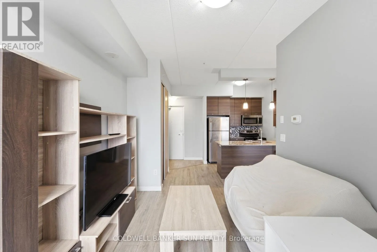 Cross Streets: University Ave And King St. N. ** Directions: Columbia St W to Spruce St. Calling all parents of university students, and young professionals! Welcome to Sage Condos in Waterloo's vibrant University Core. This spacious one-bedroom, one-bathroom suite offers just under 600 sq ft of thoughtfully designed living space. The open-concept layout features a modern kitchen complete with stainless steel appliances and ample cabinetry, seamlessly flowing into a bright and inviting living area. Large windows fill the space with natural light, while the private balcony showcases expansive city views. The bedroom is generously sized and offers comfortable, functional living. Additional highlights include in-suite laundry for added convenience .Ideally located just steps from the University of Waterloo and Wilfrid Laurier University, this is a prime opportunity in one of the city's most reliable rental markets. Enjoy walkable access to shops, restaurants, transit, including the LRT and GO Bus Station, and all essential amenities. Sage Condos offers desirable building amenities such as a rooftop terrace, fitness center, party room, and high-speed internet. (id:27476)