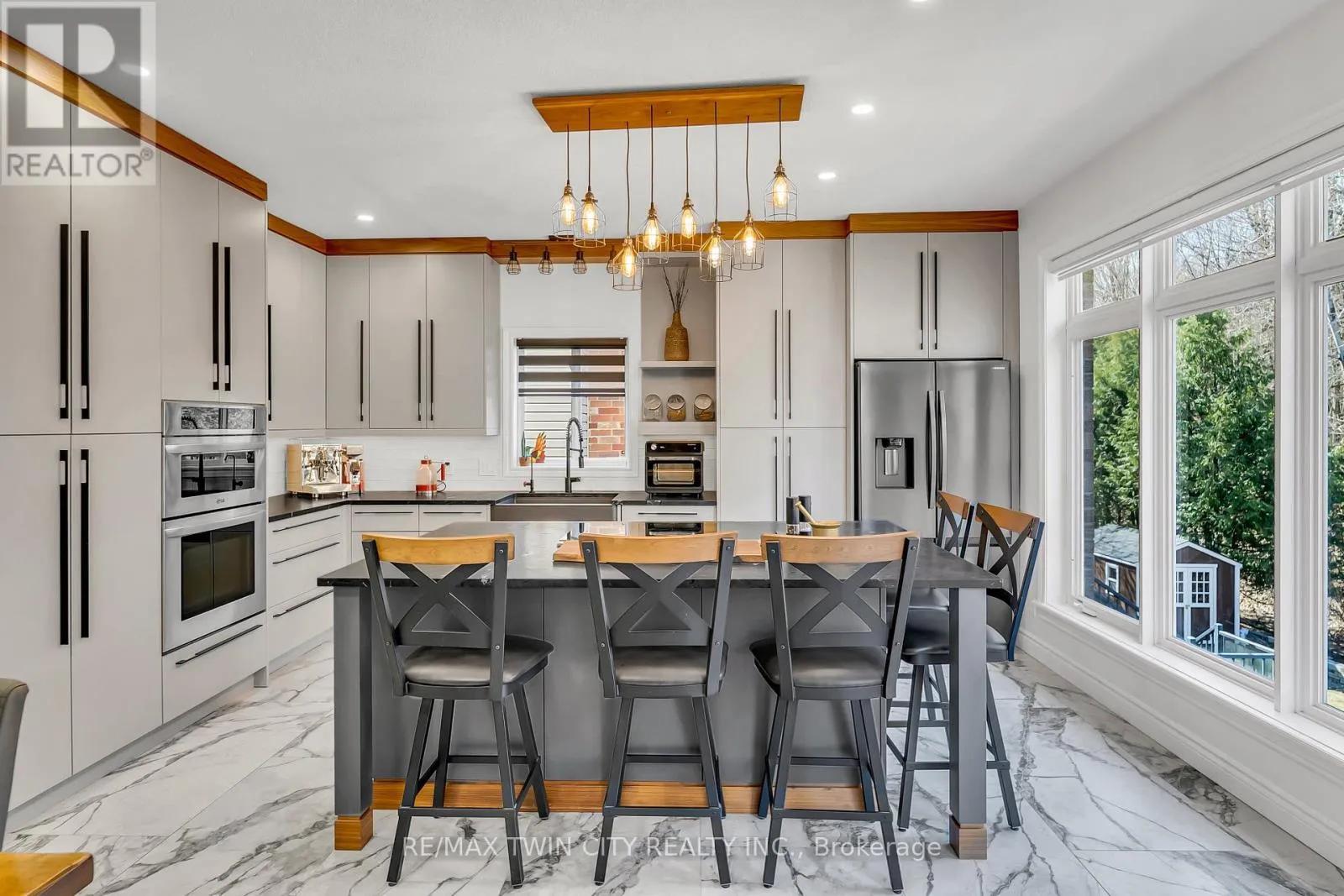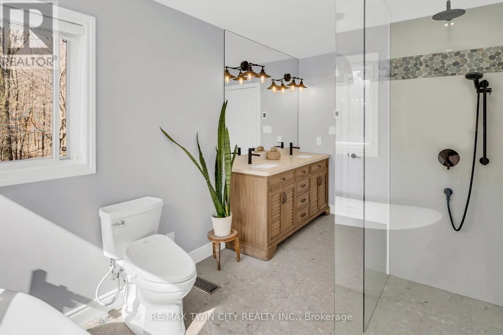 Cross Streets: Laurelwood. ** Directions: Laurelwood and White Cedar Ave. Welcome to 361 Red Osier Road, Waterloo, an exceptional luxury residence in the highly sought-after Community of Waterloo. Backing onto protected greenspace with a fully finished walkout basement, this stunning home set the tone for the elegance, from the moment you arrive. Step inside through The Brand-new Front door, the main level, reconstructed in 2021, features open-concept layout with 9ft ceilings, premium hardwood flooring, modern tiles, designer light fixtures, California ceilings, zebra blinds and beautifully updated finishes throughout. All windows at the front are triple pane (2024). The heart of the home is the custom chef's kitchen (2021), showcasing a leathered granite countertop, heated floors, Built-in stainless-steel appliances, Bosch induction stove, BEST downdraft range hood, custom dovetail cabinetry, pull-out shelves with an updated fridge in 2023. A separate formal dining room with elegant, coffered ceilings create the perfect setting for meals and family gatherings. The Family room offers rich hardwood floors and cozy gas fireplace. Stylish powder room and laundry room with ample storage completes the Main level. Upstairs, there are 3 generous bedrooms including a luxurious primary retreat with walk-in closet and spa-inspired 5pc ensuite with heated floors, along with an additional beautifully updated 5pc family bath. The fully finished walkout basement extends the living space beautifully with heated floors offering a large Rec room, games area, newly constructed Wood Burning Stove and 4th bedroom. Step outside to your private retreat featuring a renovated Deck with glass railings, 2 patios, winding staircase and a custom-built shed, all surrounded by trees and tranquil views. Extensively upgraded with newer furnace, heat pump, roof, updated electricals, this remarkable home is perfectly located near top-rated schools, parks, trails, universities and everyday amenities. It is a rare opportunity not to be missed. Book your showing today! (id:27476)