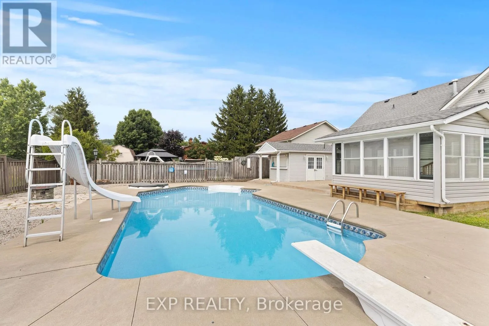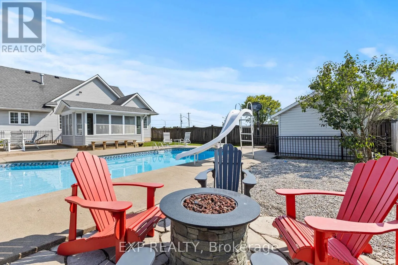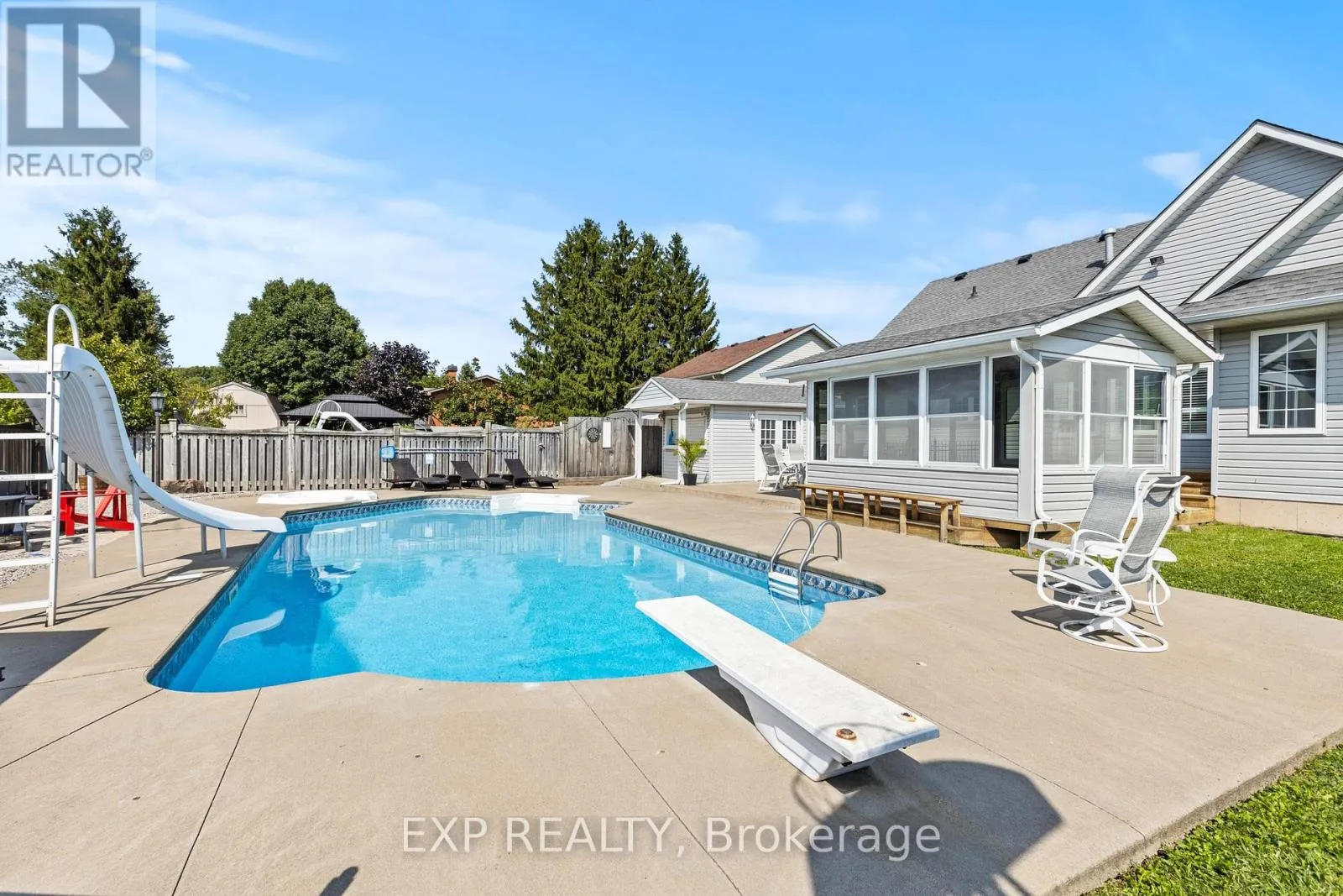 Cross Streets: WEBBER RD. ** Directions: On West side of South Pelham between Fitch & Webber. SPACIOUS BUNGALOW ON LARGE LANDSCAPED LOT WITH BACKYARD OASIS AND IN-LAW SUITE Situated on sought-after South Pelham Road, this beautifully maintained home offers over 2000 sq ft on the main floor plus a fully finished lower level, set on a wide 68 x 190 ft lot with mature landscaping, a double garage, and a long double driveway with parking for multiple vehicles. Inside, you're welcomed by bright, open spaces filled with natural light from oversized windows and a great room with a peaked ceiling, pot lights, custom built-in shelving, and a cozy fireplace, flowing seamlessly into the dining area and kitchen with abundant cabinetry and quality finishes. A versatile sunlit sitting room with walls of windows and patio doors provides the perfect spot to relax and leads directly to the backyard. The main floor also offers a convenient laundry room with extra storage, a large primary suite with walk-in closet and four-piece ensuite with soaker tub and glass shower, plus three additional bedrooms and another full bathroom. The lower level, ideal as an in-law suite, features its own kitchen, spacious rec room, built-in cabinetry and counters for an office or study area, two more bedrooms, a three-piece bath, and plenty of storage. Outside is a true entertainers paradise with an inground pool, concrete patio, deck off the kitchen, and three separate outbuildings including a screened pavilion perfect for bug-free summer dining, a freestanding bar and wet-bar space with bathroom for poolside entertaining, and an additional storage shed. A rare opportunity to enjoy a move-in ready bungalow that combines functional family living with an incredible resort-style backyard in a convenient location close to schools, parks, and every amenity. (id:27476)
