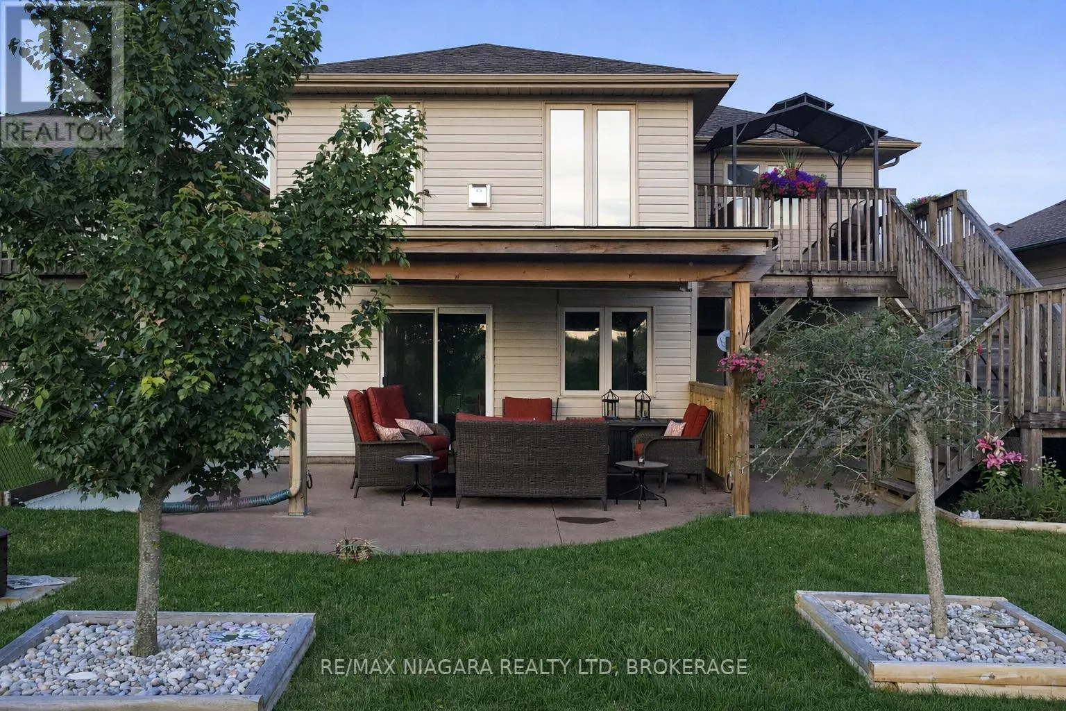 Cross Streets: Lynbrook & Wellbrook. ** Directions: Clare St, to Lynbrook Ln to Wellbrook Blvd. Oversized raised bungalow offering an exceptional layout and an abundance of sought-after features, designed for comfortable living and effortless entertaining. From the moment you arrive at 129 Wellbrook Blvd, the exposed aggregate concrete driveway and modern stucco façade create striking curb appeal. Inside, a versatile formal living or dining space highlighted by soaring cathedral ceilings and a large picture window that fills the home with natural light await. The bright, spacious kitchen features crisp white cabinetry, granite countertops, and a generous island, perfect for gatherings, overlooking both an additional dining area and a cozy family room with a gas fireplace. A walkout from this level leads to an upper deck with views of the beautifully landscaped backyard. The main floor is completed by a private primary retreat with a 3-piece ensuite and large walk-in closet, along with a second bedroom offering ensuite privileges to a 4-piece bath and its own walk-in closet. The lower level showcases why ravine lots with walkout basements are so highly sought after. This bright and inviting space offers oversized windows, a glass patio door leading to a covered concrete patio, and a family room that truly feels like an extension of the main floor. Three additional well-sized bedrooms, a 4-piece bathroom, and a generous utility/storage room provide ample space for growing families and seasonal storage. The backyard is a true highlight, featuring custom aggregate pathways, a two-tiered deck with multiple seating areas, and plenty of room to host family and friends while enjoying the outdoors. Additional features include an attached double-car garage, fresh landscaping, and a prime location close to schools, parks, golf courses, and some of Welland's most desirable neighbourhoods. A rare opportunity, come see it for yourself before it's sold. (id:27476)