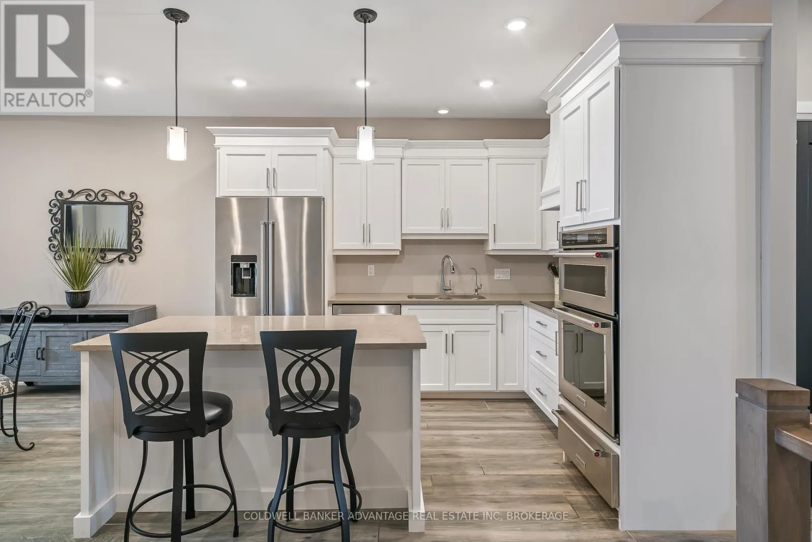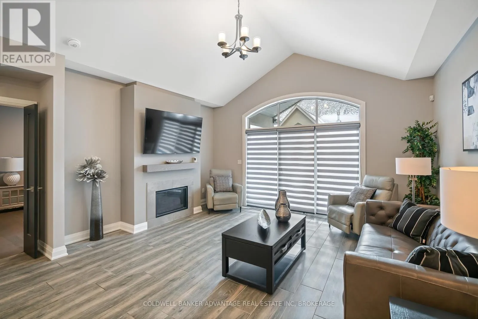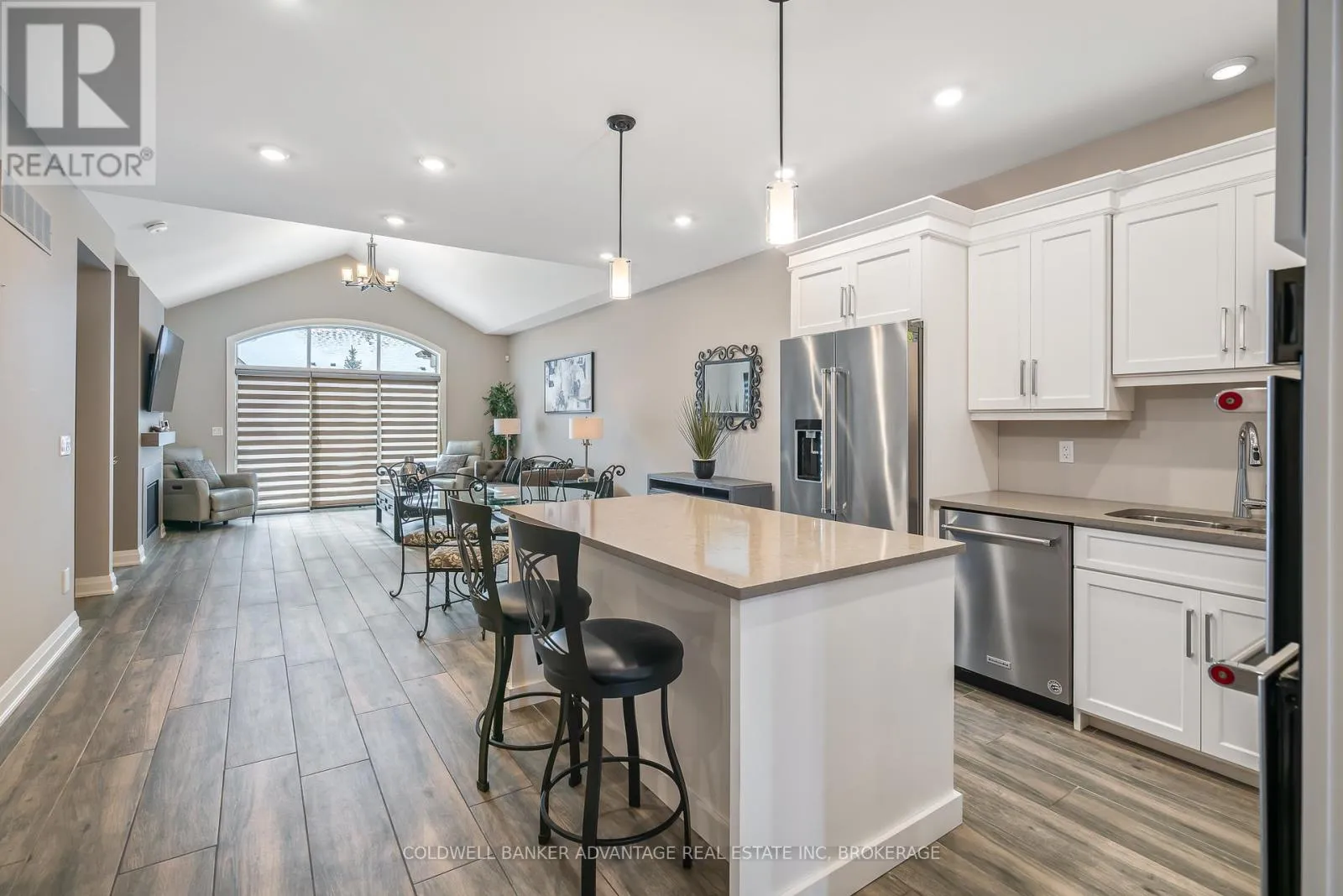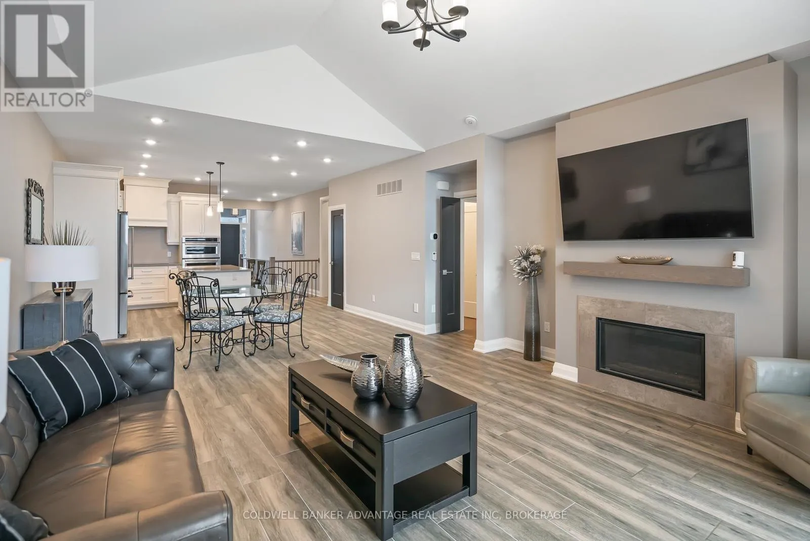 Cross Streets: Daimler Pkwy & Hwy 406. ** Directions: Daimler Pkwy , left on Old course Trail, Right on Carrick Trail. Luxurious Bungalow Townhouse offering approximately 1400 sq ft of refined main floor living & mostly finished Lower level. This elegantly appointed 2 bedroom design features 9' ceilings plus a dramatic vaulted ceiling in Great room highlighted by a stunning wall of windows overlooking the covered rear patio. The stylish kitchen is beautifully appointed w. custom cabinetry, large island, quartz countertops & SS KitchenAid appliances. The great room showcases cathedral ceilings, gas FP w/ beam mantle & triple patio doors that lead to the rear covered patio. The open concept layout seamlessly connects the kitchen, dining area & great room, creating an ideal space for both everyday living and entertaining. The primary suite offers a generous walk-in closet and an upscale 3pc ensuite w/ custom glass shower & double vanity w/ quartz countertop. Completing the main floor is a separate, self contained laundry room w/ custom cabinetry, 4pc 2nd bath and the second main floor bedroom conveniently located off the front foyer making it a fabulous potential office space. Premium finishes include custom window treatments, Engineered hardwood & ceramic floors, upgraded baseboard & trim & striking black interior doors. The mostly finished lower level expands the living space with a large Rec-room that features a large linear electric fireplace, a spacious 3rd bedroom, a 3pc bath w/ 5' acrylic shower and plenty of storage. A truly exceptional unit that offers luxury, comfort and thoughtful design throughout. Located in the Adult community known as "The Highlands", this Luchetta built home was completed in 2020. Residents enjoy access to the private clubhouse w/ indoor pool, hot tub, sauna & gym, along with the Tennis & Pickleball courts. The monthly fee of $300 also includes lawn cutting & snow removal, so just kick back & enjoy! (id:27476)