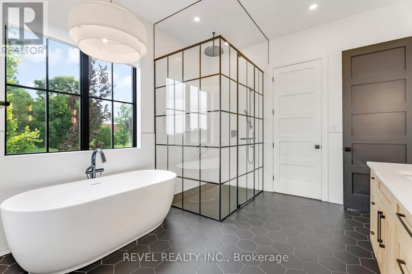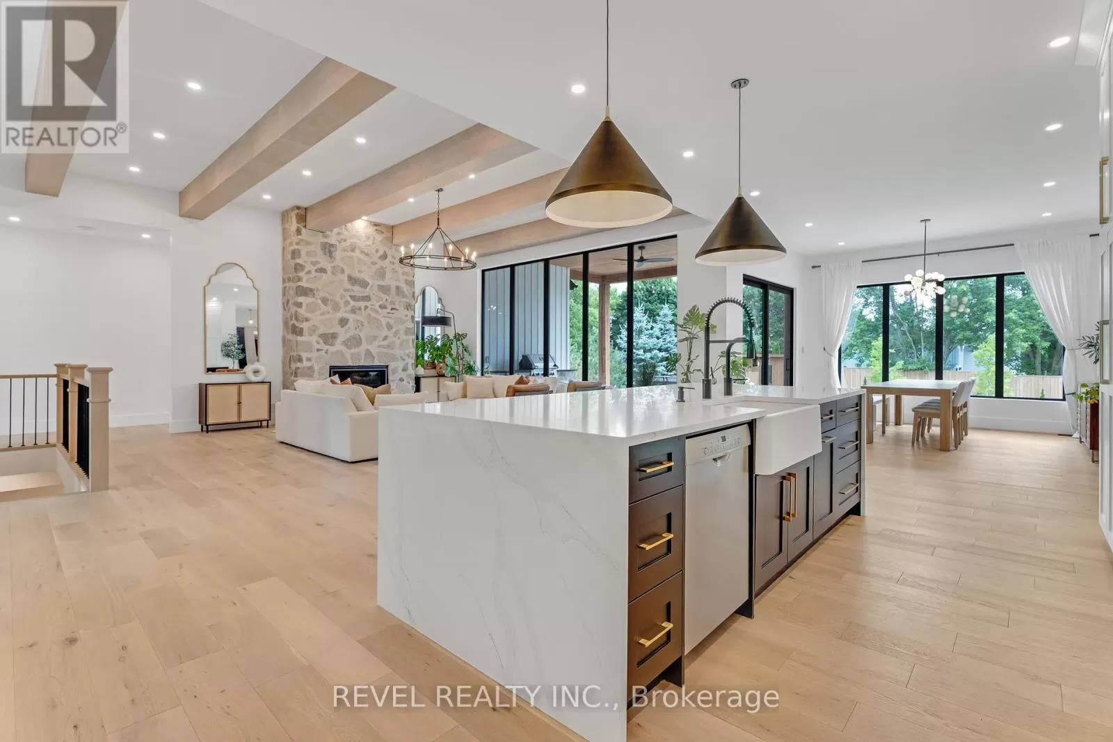 Cross Streets: Greenwood Hill. ** Directions: Lobsinger Line through St. Clements to Lobsinger and Greenwood Hill. Located on the left. This exceptional custom bungalow, offers nearly 6,000 sq ft of finished living space on a serene country lot under an acre. With 6 bedrooms, 4 bathrooms, and an oversized 3-car garage with parking for 6 more, this home is ideal for large or multigenerational families. Inside, 10' ceilings throughout the main floor and a vaulted 12' great room with a floor-to-ceiling natural stone fireplace create an open, airy feel. White oak engineered hardwood spans both levels, adding warmth and elegance. The chefs kitchen features a double waterfall island, top-of-the-line appliances, an oversized built-in fridge/freezer, and connects to a stunning walk-through pantry with second fridge, white oak counters, and custom cabinetry. The dining area leads to a covered concrete porch with built in natural stone outdoor BBQ, perfect for entertaining. The primary suite includes white oak beam accents, a gas fireplace, luxurious ensuite, custom walk-in closet, and direct access to the laundry room. A finished basement adds more bedrooms, bathrooms, and versatile space for guests, teens, or recreation. Large windows throughout flood the home with natural light. The backyard has plenty of room to add a pool. Located 12 Minutes to St,Jacobs, 13 Minutes to the Farmers Market, 14 Minutes to Waterloo and 22 Minutes to Kitchener. This is a rare opportunity to enjoy refined country living close to the city. (id:27476)