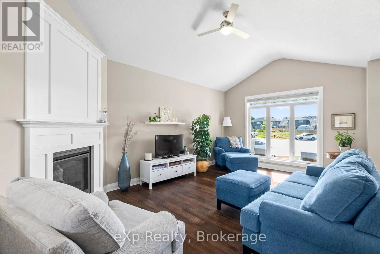 Cross Streets: Ronnie's Way. ** Directions: 127 Doug's Cres, Mount Forest. Tucked away in a quiet cul-de-sac just one block from local sports fields, a splash pad, park, and walking track, this 4-year-new bungalow blends modern comfort with small-town charm. Step inside to a bright, open-concept main floor where engineered hardwood flooring and a cozy gas fireplace create an inviting atmosphere. The kitchen is a standout feature, offering sleek granite countertops, a walk-in pantry, island with breakfast bar, and smudge-free appliances. Perfect for summer entertaining, the dining area opens directly onto a back deck ideal for barbecues and enjoying the peaceful outdoor setting. Everyday living is made easy with main floor laundry, complete with a utility sink for added convenience. Two spacious bedrooms on the main level are filled with natural light, including the primary suite, which boasts a 3-piece ensuite and dual wall-to-wall closets. The fully finished basement adds even more living space with in-floor heating, a large recreation room, third bedroom, and a 2-piece bath with rough-in for a future shower. Modern finishes, thoughtful design, and a family-friendly location make this home a true gem. Don't miss your chance to make it yours! (id:27476)