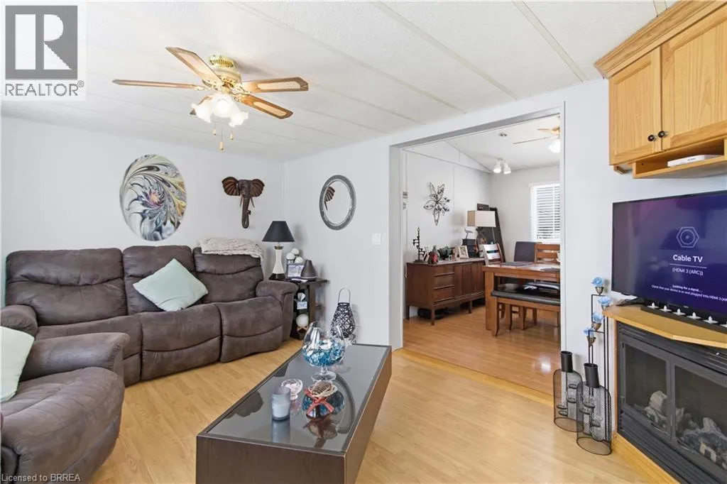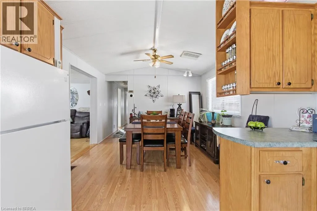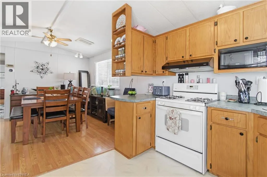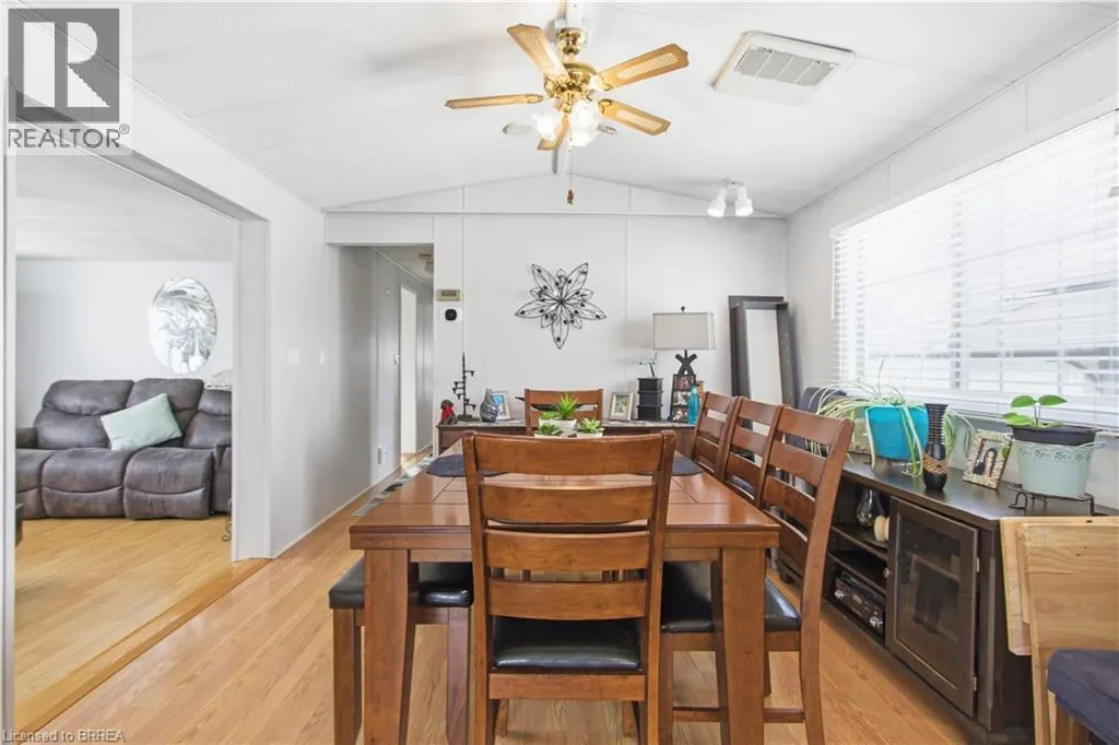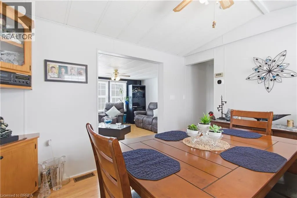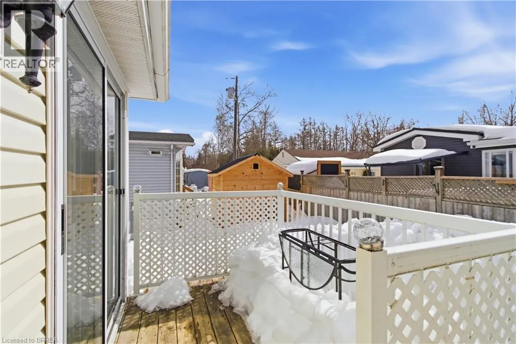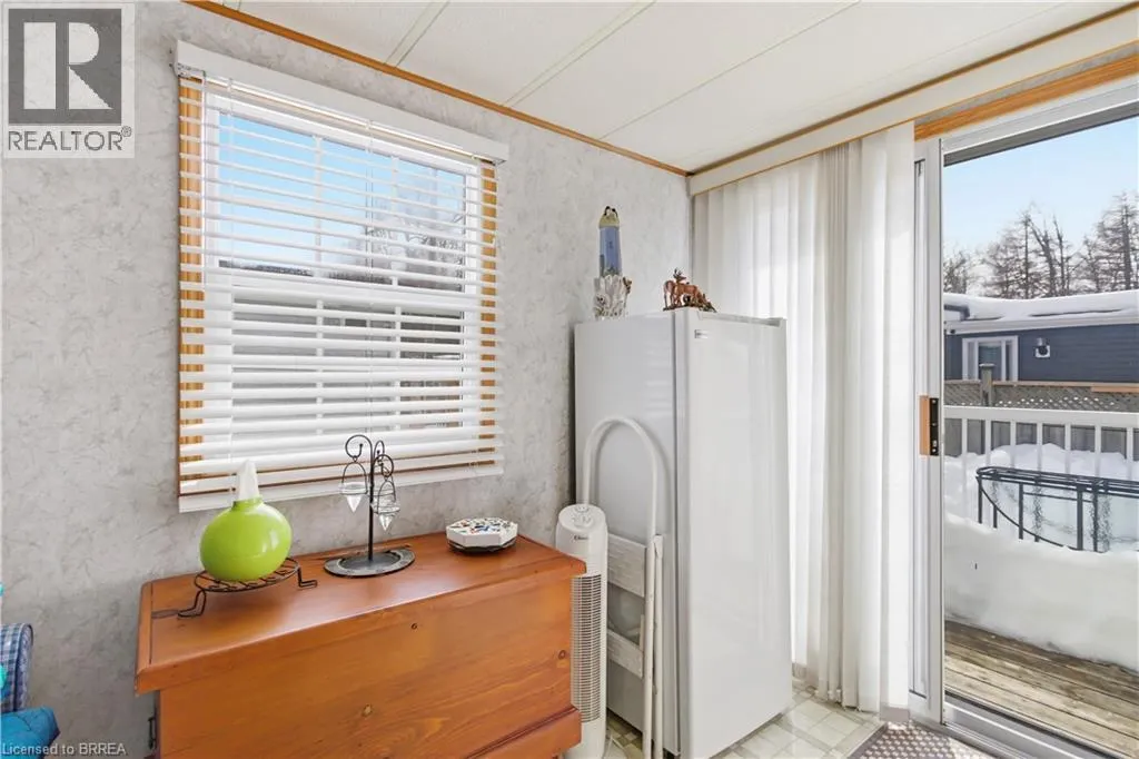 Turn left onto Havesumfun Road then turn right onto Pine Pass. Welcome to 428 Pine Pass, located in the desirable all-season section of Maple Leaf Acres, a vibrant land lease community just minutes from Belwood Lake. This spacious 2 bedroom + den/mudroom, 2 bathroom home offers plenty of room for comfortable everyday living and hosting family and friends. Step inside to a bright and inviting family room filled with natural light, creating a warm welcome as soon as you enter the home. The kitchen flows into a generous dining area, providing ample space for family meals and gatherings. The large primary bedroom features two windows that bring in plenty of sunshine along with excellent closet storage and is conveniently located just steps from a full 3-piece bathroom. The second bedroom offers flexibility for guests, a home office, or hobby space. The versatile mudroom/den includes a powder room, stacked laundry, and additional space that could accommodate a pull-out couch or seating area. A sliding door leads to a private backyard deck, perfect for relaxing outdoors. The yard features a lovely stone walkway and side garden ready to bloom this spring, along with a shed providing extra storage for gardening tools, a golf cart, or outdoor equipment. The home also features a paved driveway with parking for two vehicles. Recent updates include a steel roof (2021), new furnace (2025), and hot water heater (2025), offering peace of mind and making this a well-maintained home you can move into without worry. Enjoy everything Maple Leaf Acres has to offer, including multiple pools, recreational facilities, community events, and close proximity to the Belwood Lake boat launch and outdoor activities. A wonderful opportunity to enjoy relaxed, resort-style living in a welcoming community. (id:27476)