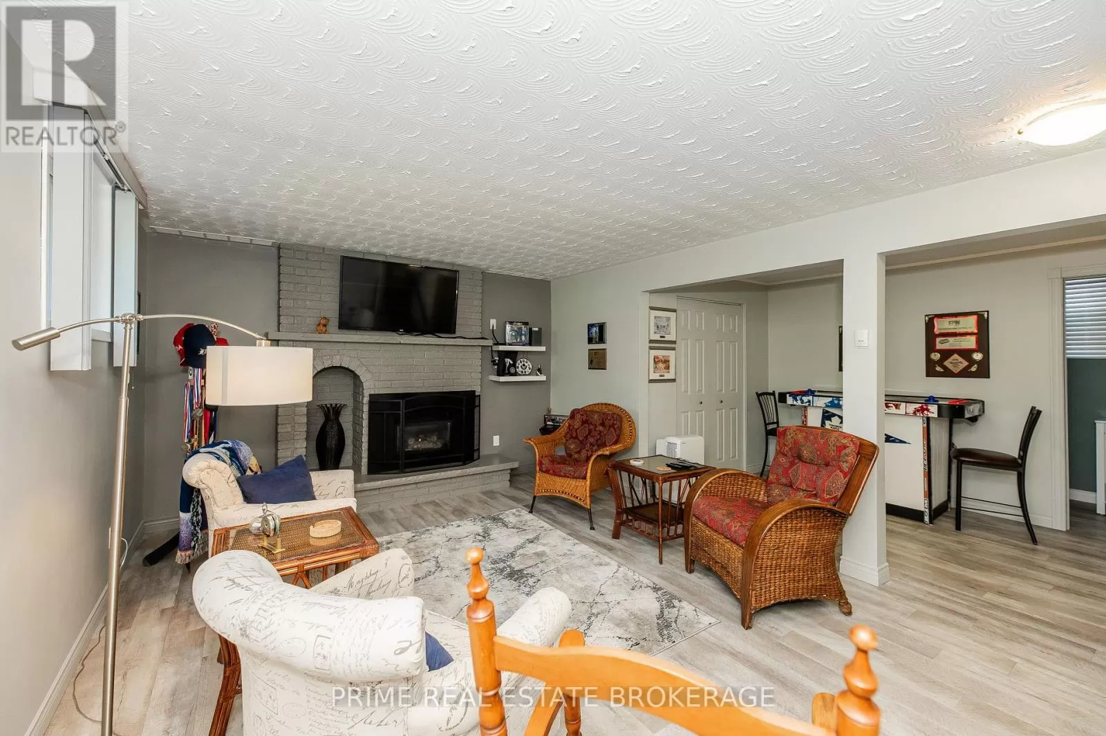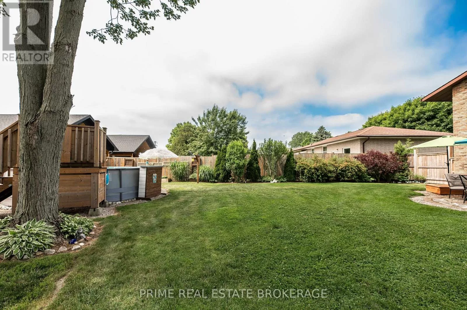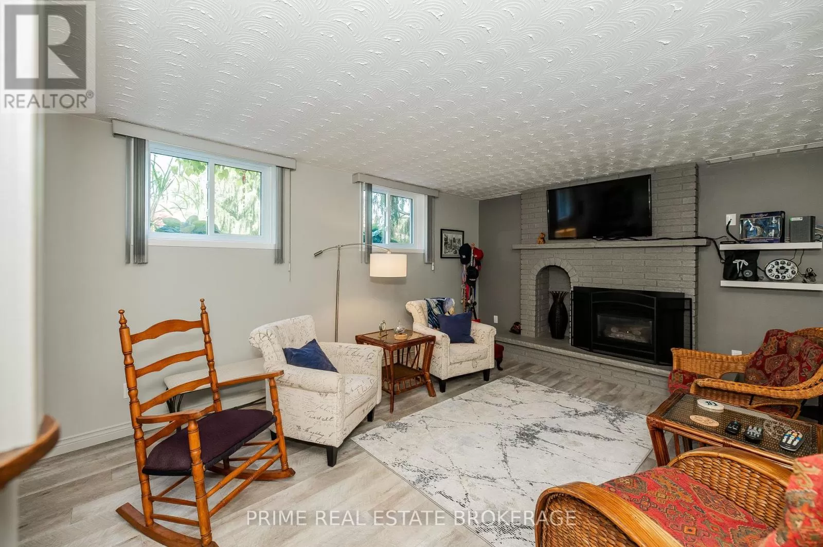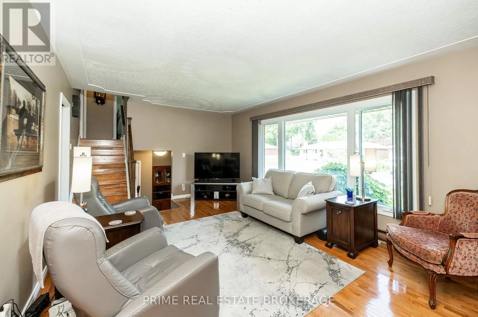 Ridge and Elm Street. Welcome to this meticulously cared-for side split, offering comfort, character, and convenience. Nestled on a beautifully landscaped lot, this 3-bedroom, 1.5-bathroom home features a private backyard oasis complete with a sparkling pool, a large deck for entertaining, and lush, well-maintained gardens. Step inside to an inviting entrance that leads to the main floor laundry and continues into a cozy and functional layout. The bright family room upstairs is the perfect place to unwind, complete with a warm gas fireplace. The quaint kitchen and dining area overlook the serene backyard, creating the perfect setting for everyday living and hosting.The lower level is fully finished, offering an additional rec room with another fireplace, a 2-piece bathroom, and plenty of storage space. Additional highlights include a single garage, ductless air conditioning for year-round comfort, and a true pride of ownership throughout. Ideally located close to schools, parks, grocery stores, and just minutes from Highway 401, this home is a fantastic choice for families, first-time buyers, or commuters alike. Don't miss your chance to own this lovely home in a great neighbourhood! (id:27476)