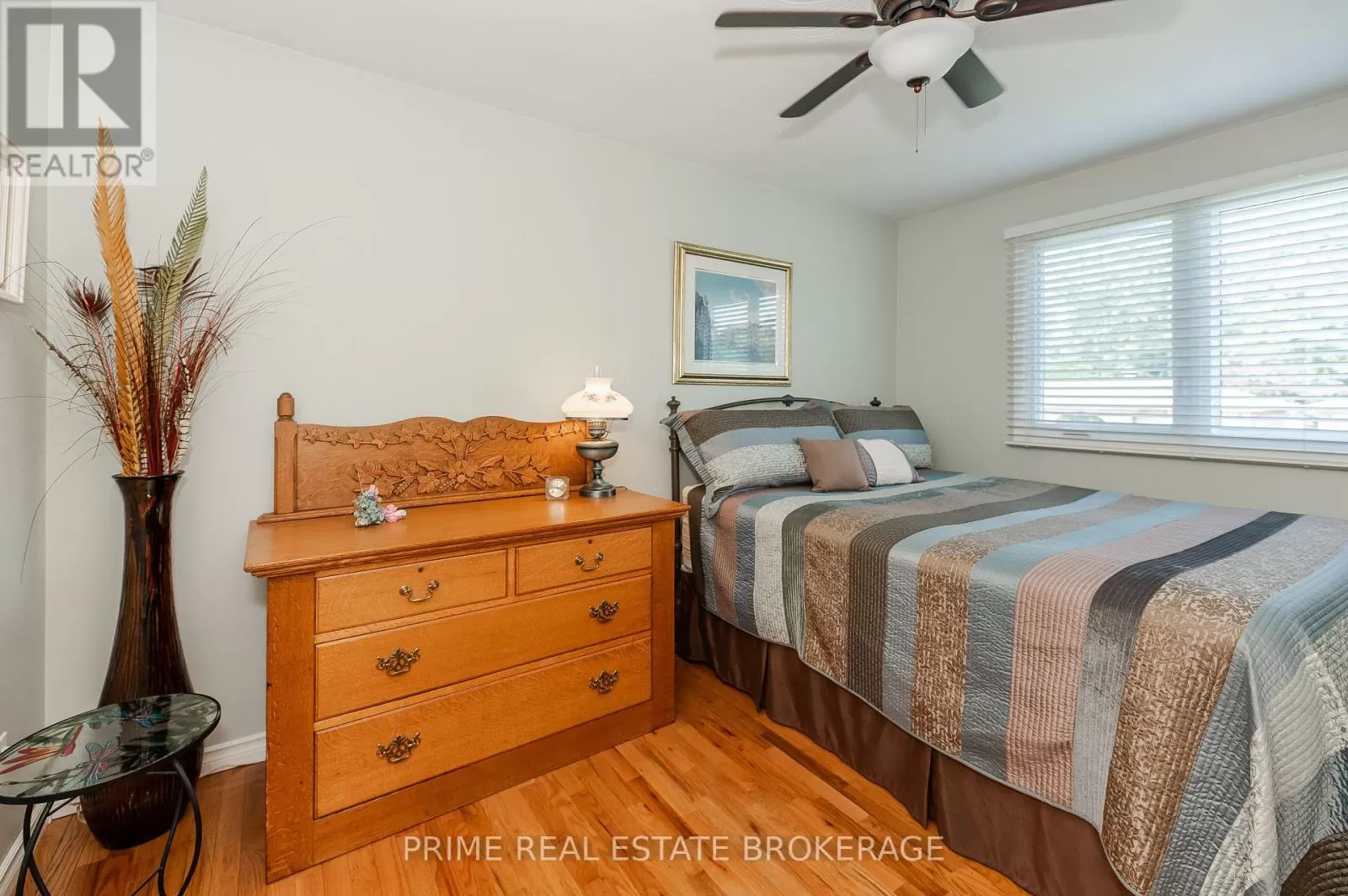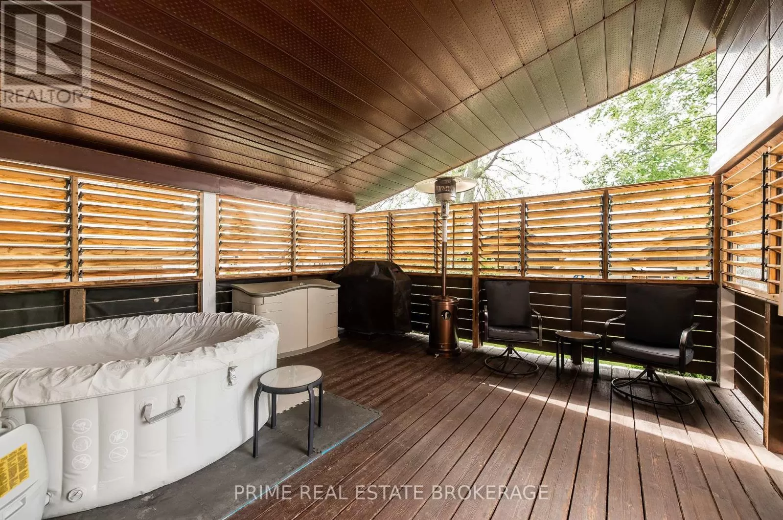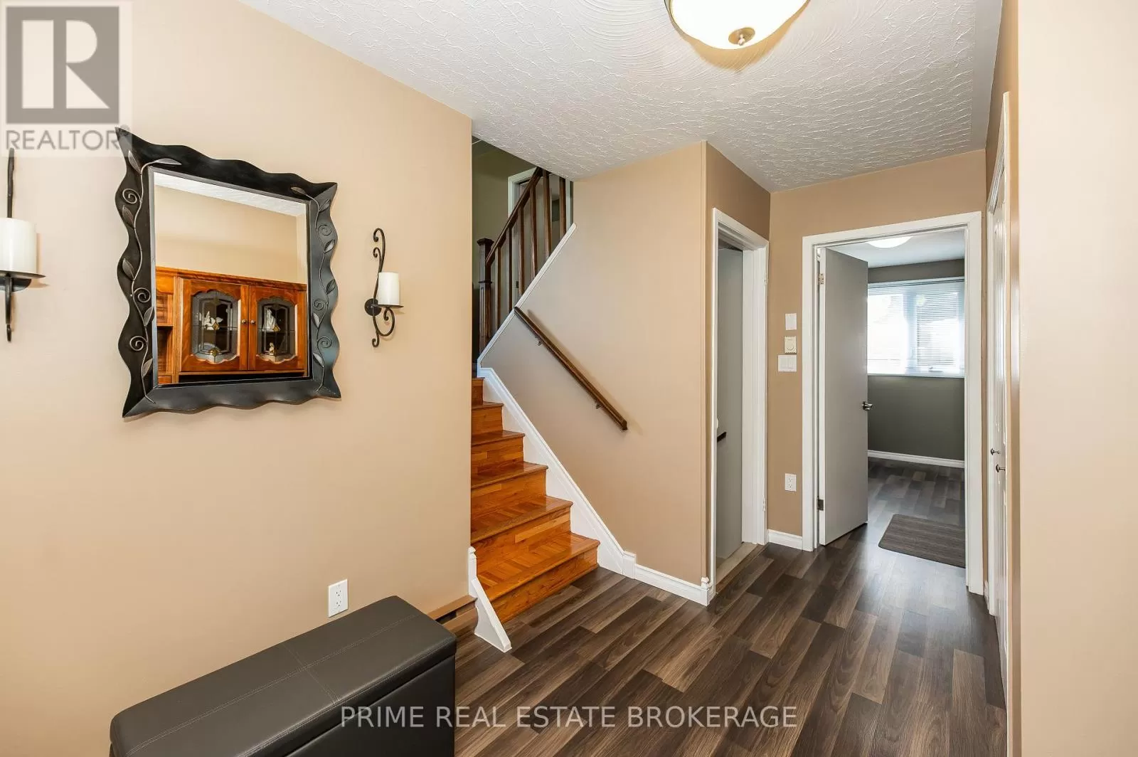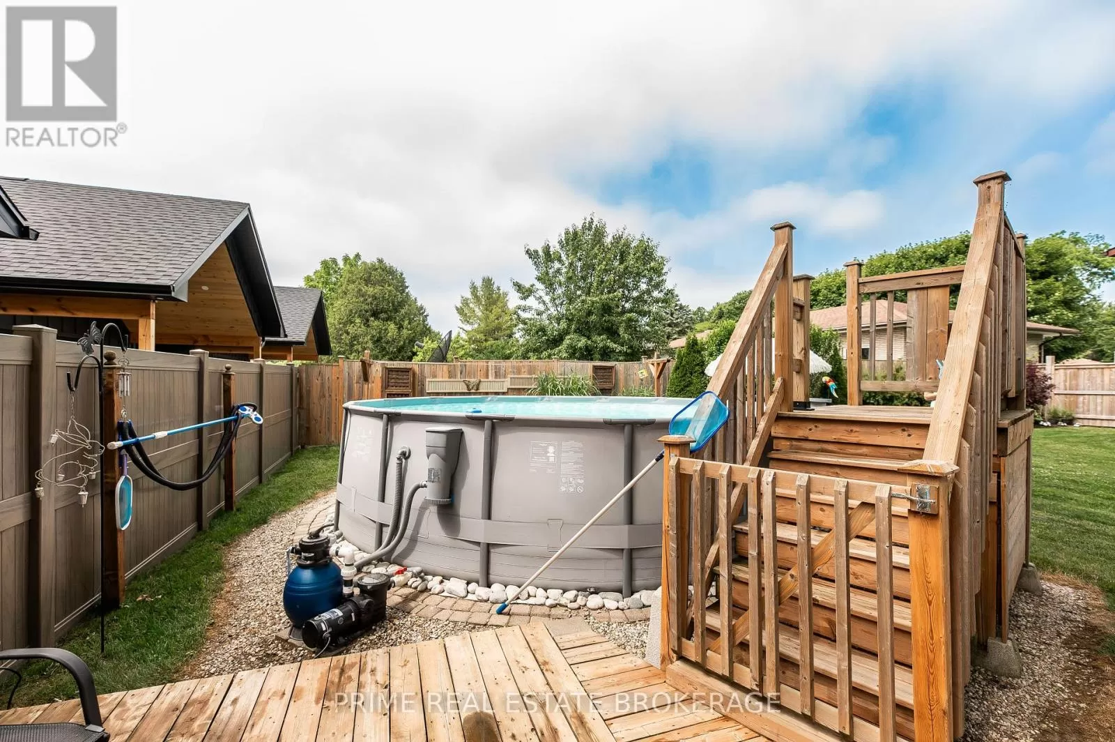 Ridge and Elm Street. Welcome to this meticulously cared-for side split, offering comfort, character, and convenience. Nestled on a beautifully landscaped lot, this 3-bedroom, 1.5-bathroom home features a private backyard oasis complete with a sparkling pool, a large deck for entertaining, and lush, well-maintained gardens. Step inside to an inviting entrance that leads to the main floor laundry and continues into a cozy and functional layout. The bright family room upstairs is the perfect place to unwind, complete with a warm gas fireplace. The quaint kitchen and dining area overlook the serene backyard, creating the perfect setting for everyday living and hosting.The lower level is fully finished, offering an additional rec room with another fireplace, a 2-piece bathroom, and plenty of storage space. Additional highlights include a single garage, ductless air conditioning for year-round comfort, and a true pride of ownership throughout. Ideally located close to schools, parks, grocery stores, and just minutes from Highway 401, this home is a fantastic choice for families, first-time buyers, or commuters alike. Don't miss your chance to own this lovely home in a great neighbourhood! (id:27476)