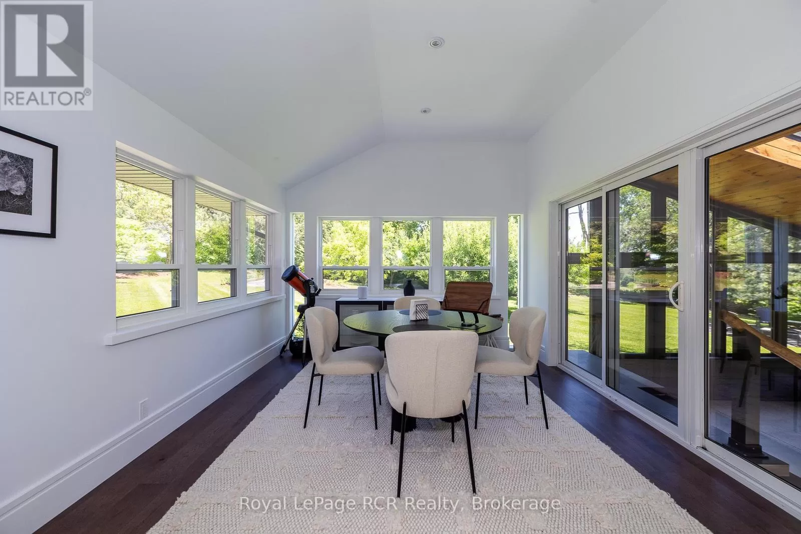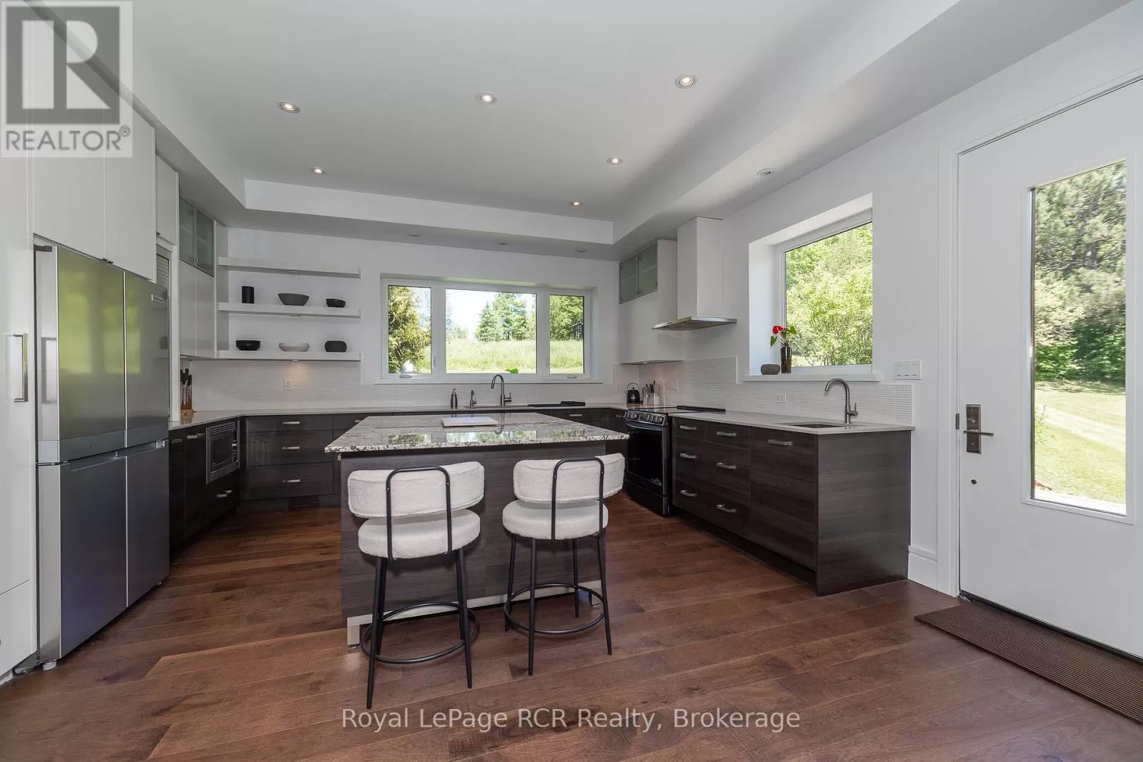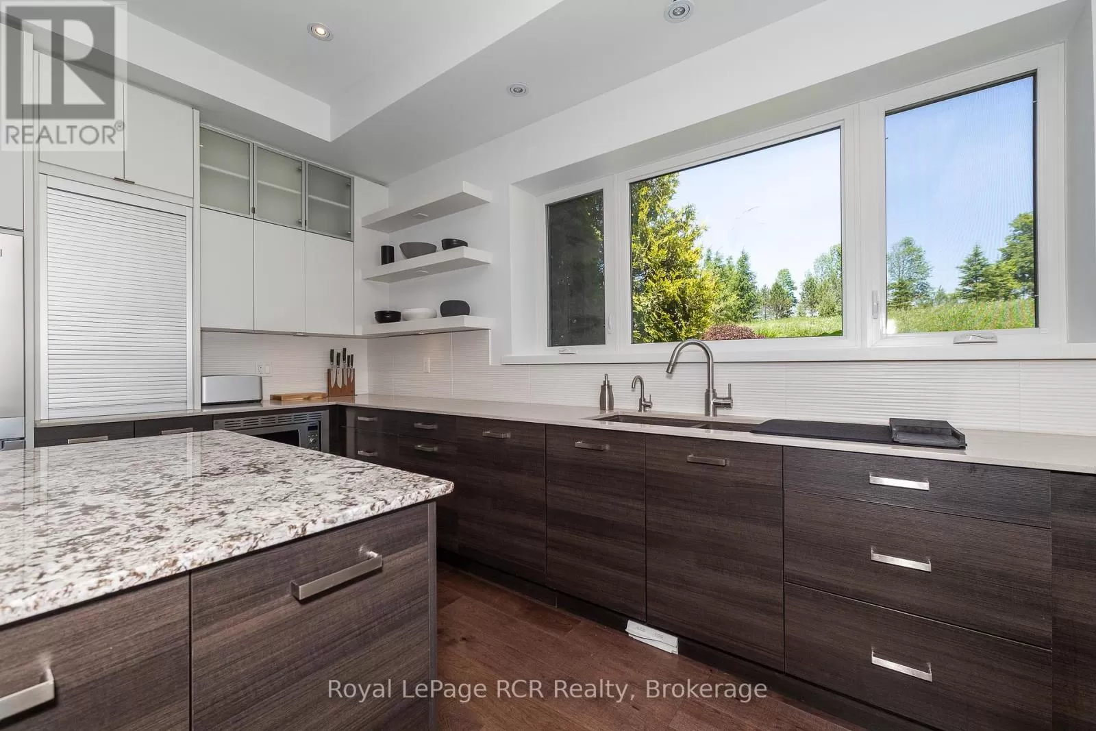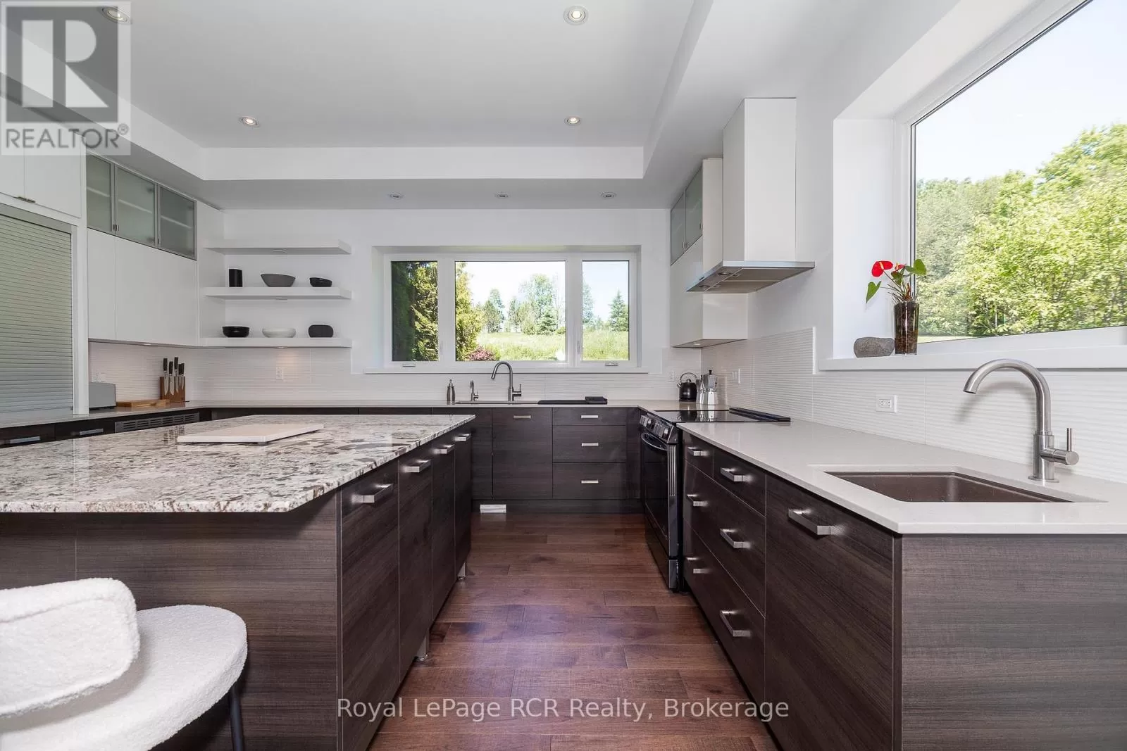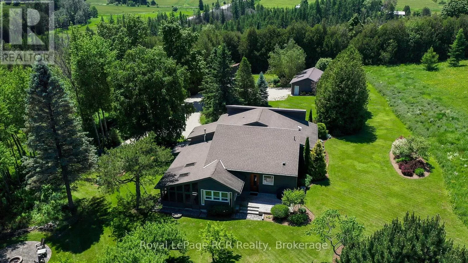 Grey Rd 12 between Traverston and Townsend Lake Rd Luxurious contemporary home set on 50 scenic acres of mixed forest, meadows, and manicured outdoor living spaces. The main level features a sunken living room with gas fireplace, open dining area, and a chef's kitchen with granite countertops, large island, abundant storage, and walk-out to a deck with natural gas BBQ. Adjacent are a bright dinette and screened porch for three-season outdoor dining and entertaining. The primary suite includes dual walk-through closets with built-in cabinetry and an ensuite bath with soaker tub, glass shower, and in-floor heating. Three additional bedrooms, including one with a sitting room and balcony, offer ample space for family and guests. The finished lower level provides a large family room, three-piece bath, laundry, storage rooms, and an attached garage with EV charging outlet and garden entrance to a two-bay drive shed. Modern features include ICF construction, air exchanger, UV water treatment, whole-home surge protection, motorized window shades, Starlink internet, and smart home systems. Enjoy over 4 km of private trails through hardwood forest, regenerating meadows, and orchard trees with sweeping countryside views. Conveniently located on a paved road with natural gas, minutes from Markdale shopping, dining, and hospital, and close to organic farms, the Bruce Trail, skiing, golf, conservation lands, and lakes, this is a four-season retreat in the heart of West Grey. (id:27476)