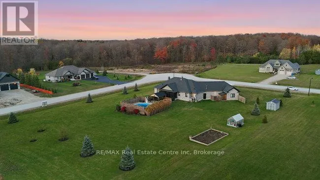 Cross Streets: Hwy 6/Southgate Glenig Townline. ** Directions: Marshall Heights Rd / Southgate Gleneig Townline. Welcome to this exceptional bungalow, perfectly situated on a spacious lot offering privacy, style, and room to entertain. The property features an impressive 4-car garage and a driveway that accommodates 12+ vehicles -perfect for gatherings or hobby enthusiasts. Step inside to an open-concept main floor filled with natural light and modern finishes. The bright, upgraded kitchen is a chef's dream, featuring a double-door pantry, Italian pot filler, and under-island garbage bins -beautifully blending function and design. The mudroom offers custom cabinetry and convenient direct garage access. The primary bedroom is a true retreat, showcasing a coffered ceiling, custom reading lights, and a luxurious 5-piece ensuite with a walk-in shower and free-standing tub. The second bedroom is currently used as a home office, offering flexibility for your lifestyle. A finished basement provides plenty of additional living space, including two additional spacious bedrooms, a home gym complete with sauna, and a 4-piece bathroom-ideal for guests or family. Step outside to your own private oasis: a covered lanai, on-ground pool, and hot tub create the perfect setting for relaxation and entertaining - all fenced and landscaped to provide the ultimate in privacy. This property truly offers the best of country living with refined style and comfort -an exceptional opportunity in beautiful West Grey. (id:27476)