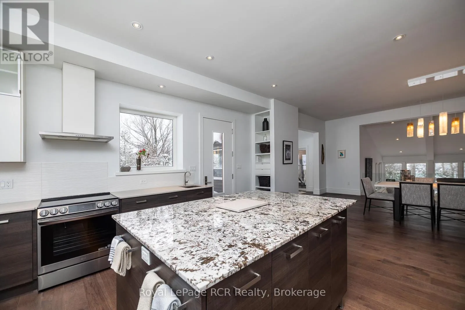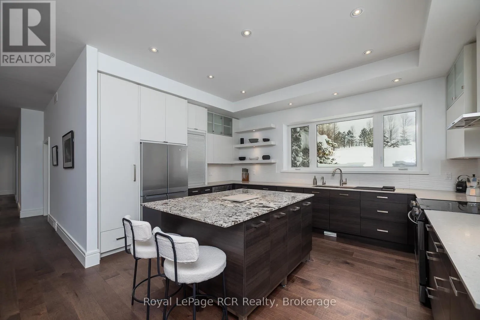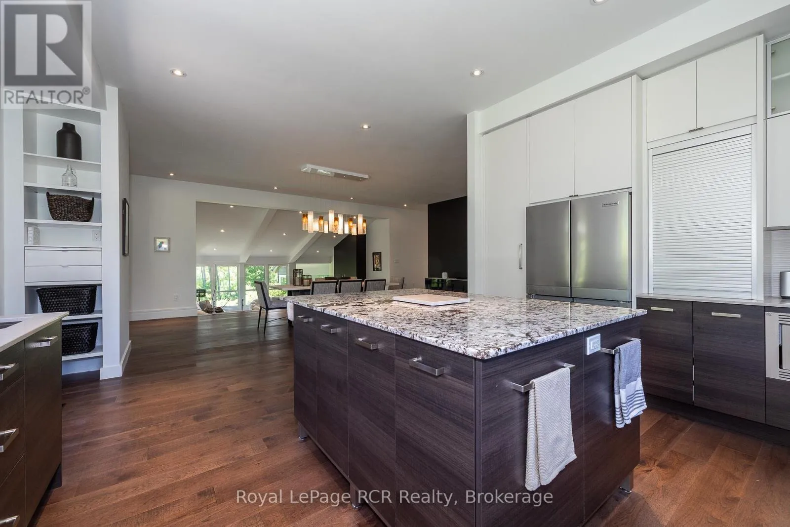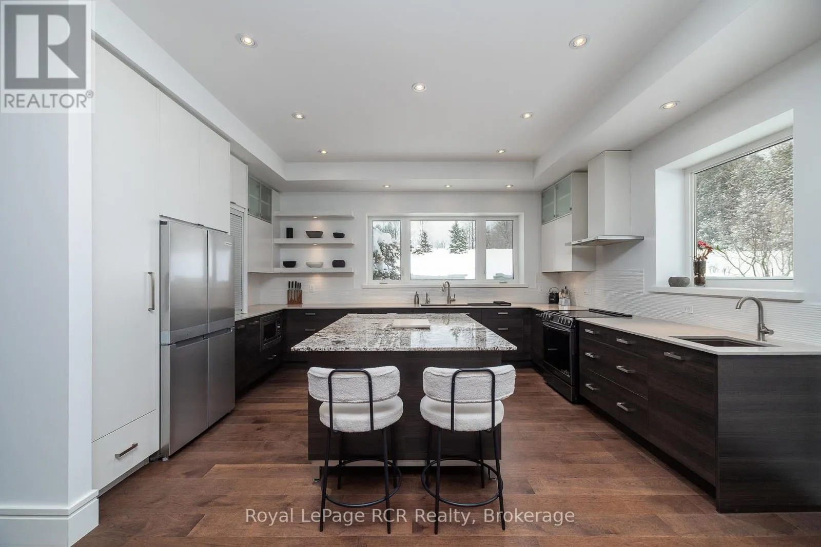 Grey Rd 12 between Traverston and Townsend Lake Rd Luxurious contemporary home set on 50 scenic acres of mixed forest, meadows, and manicured outdoor living spaces. The main level features a sunken living room with gas fireplace, open dining area, and a chef's kitchen with granite countertops, large island, abundant storage, and walk-out to a deck with natural gas BBQ. Adjacent are a bright dinette and screened porch for three-season outdoor dining and entertaining. The primary suite includes dual walk-through closets with built-in cabinetry and an ensuite bath with soaker tub, glass shower, and in-floor heating. Three additional bedrooms, including one with a sitting room and balcony, offer ample space for family and guests. The finished lower level provides a large family room, three-piece bath, laundry, storage rooms, and an attached garage with EV charging outlet and garden entrance to a two-bay drive shed. Modern features include ICF construction, air exchanger, UV water treatment, whole-home surge protection, motorized window shades, Starlink internet, and smart home systems. Enjoy over 4 km of private trails through hardwood forest, regenerating meadows, and orchard trees with sweeping countryside views. Conveniently located on a paved road with natural gas, minutes from Markdale shopping, dining, and hospital, and close to organic farms, the Bruce Trail, skiing, golf, conservation lands, and lakes, this is a four-season retreat in the heart of West Grey. (id:27476)
