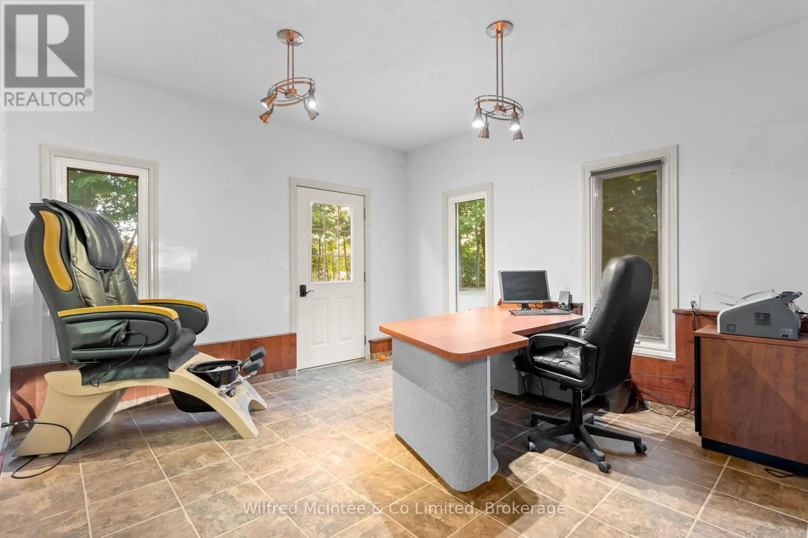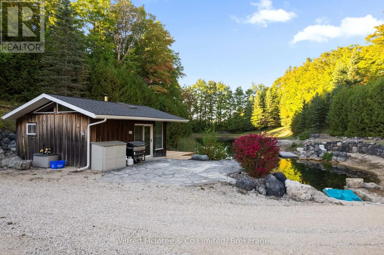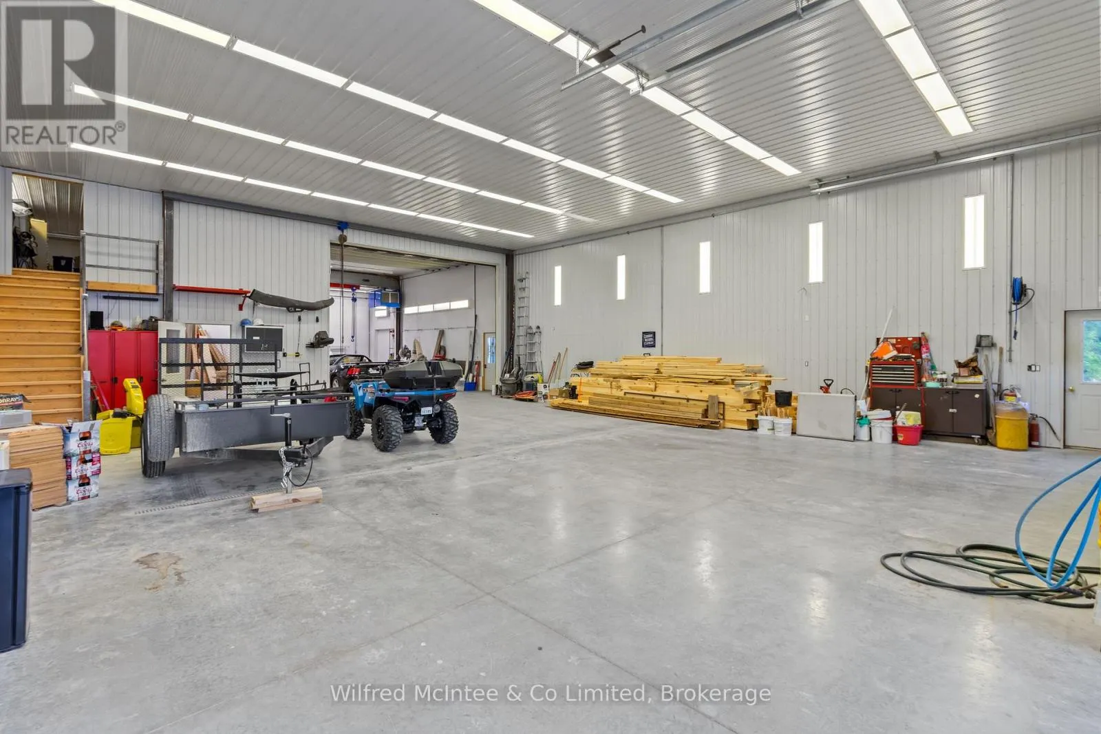 Cross Streets: Grey Rd 4. ** Directions: 193455 30TH SIDEROAD NDR, HANOVER ON, N4N 3B8; North off Grey Rd 4 between Hanover and Durham, Property on right hand side. Set on 8.9acres, this first time on market, one-of-a-kind property invites you to live, work, and play without compromise. Featuring a 4 bed, 2 bath 2800sqft home, 4784sqft commercial grade shop with offices, 850sqft outbuilding, & 320sqft cabin with bathroom overlooking the pond. With parking for over 20, this property is designed for convenience, gatherings, and the flexibility to expand your business. Step inside the imaculate mid century modern home and discover a space that balances warmth & function. Characterized by clean lines, open-concept layout, and a deep connection to nature through expansive windows and the integration of wood, stone, and brick accents. The foyer welcomes you, leading into a sun-filled, open-concept dining and kitchen area where custom cherry wood cabinetry, granite countertops, and built-in appliances combine elegance and practicality. Off the kitchen, a bright sunroom with heated floors and a wood stove frames stunning country views, the perfect spot for coffee at sunrise or a glass of wine at dusk. The living room, with its soaring 12ft ceilings and custom stone fireplace, leads to the primary suite, where 6 large windows overlook the landscaped yard. Upstairs, 3 bedrooms and a full bathroom with dual sinks offer plenty of space. The finished basement features a large rec room, custom cabinetry, laundry room, and a cold cellar. Just steps from the home is a 4,784sqft. heated shop; complete with in-floor heat, 3 overhead doors, 3 offices, parts room, 2pc bathroom, plus a 1 bed, 1 bath apartment. The property also includes a smaller heated outbuilding/garage, and beside the spring fed pond is a cabin. Surrounded by towering trees, and complete privacy, this is made for bonfires, paddle boating, and summer barbecues. At night, relax by the woodstove as you watch the glow of a private waterfall. This property isn't just a home, it's a lifestyle. A private country sanctuary where your business, family, and leisure can thrive together. (id:27476)