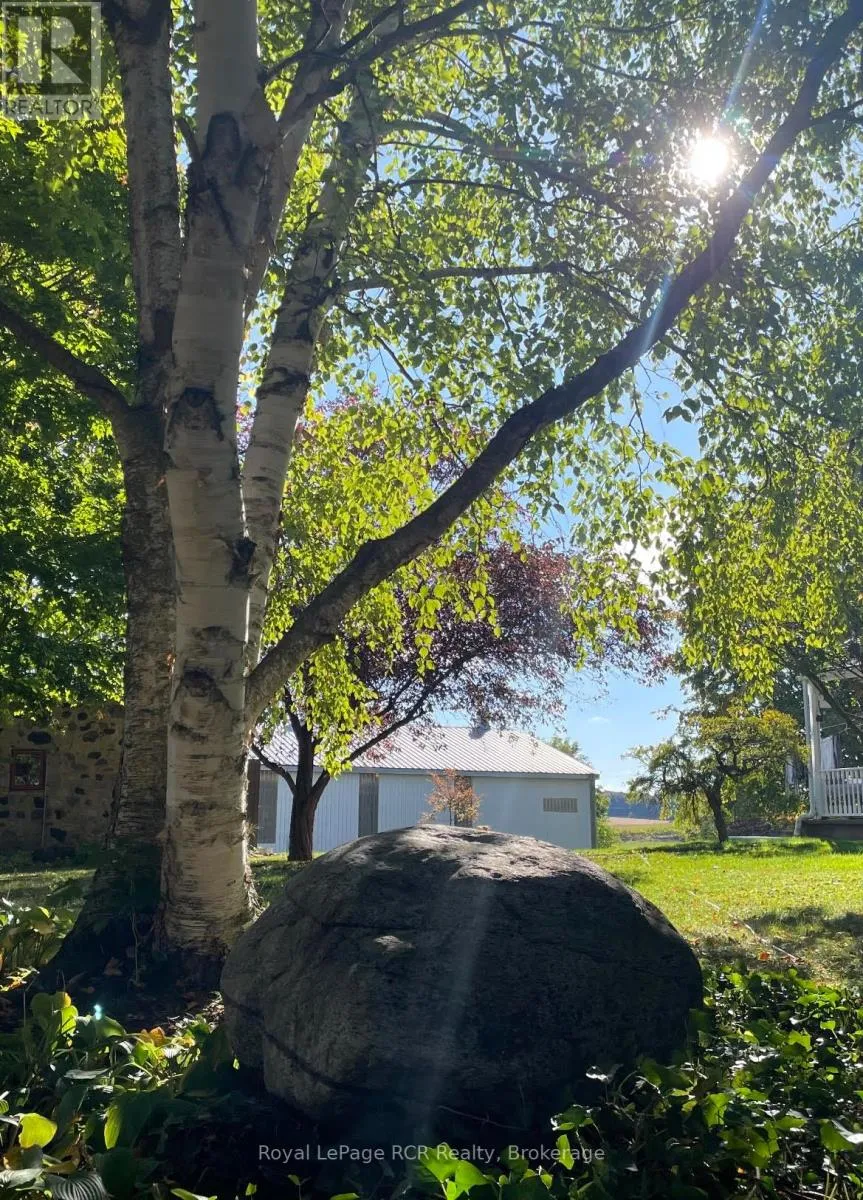 Cross Streets: Sideroad 10 and Normanby Road 9. ** Directions: Go west over the dam in Ayton for a mile + and turn left (south) on sideroad 10, first driveway on left. Rare opportunity to own a productive and picturesque farm in desirable Normanby Township. This 97-acre property offers approximately 73 workable acres, systematically tiled and perimeter fenced, 1872 stone house, bank barn (82' x 62' + 21' x 48'), 2 sheds(60' x 60' and 40' x 64' ), pig barn (36' x 80' ), 4 grain bins, original smaller stone house (21' x 39' ) used for storage, plus a childs playhouse. The land consists of Harriston Silt Loam Soil is currently seeded in pasture grasses and was grazed last year under organic management. A scenic creek winds through the property with a bridge for leisurely walks. Approximately 14 acres of forest with trails. Set on a park-like setting and surrounded by mature trees, the classic stone farmhouse blends historic charm with thoughtful upgrades. Offering 4-5 bedrooms and 2 bathrooms, the home showcases original trim, deep windowsills, a stunning hall window, and porches on several sides to take in the peaceful countryside views. The main floor has a welcoming country kitchen with a large island, spacious living room with propane fireplace, office or family room, 4 piece bathroom, laundry room, mud room and storage room. Upstairs has 4 bedrooms, 3 piece bathroom, large play room, storage room and second staircase. Updates include professionally pointed exterior stonework, geothermal heating and cooling with 2 zones, soffit and fascia, windows and doors. The yard is lovely with towering trees and sweeping views toward the forest. This is an exceptional opportunity to invest in quality farmland, a character home, and a truly scenic rural setting. Must be seen in the summer and fall to fully appreciate the beauty, see the summmer photos. An additional 119 acres are also available just two doors down, offering even greater potential for expansion (MLS X12797814). It is not often that two farms of this quality come on the market in Normanby Township. This farm was in the family for almost 24 years. (id:27476)