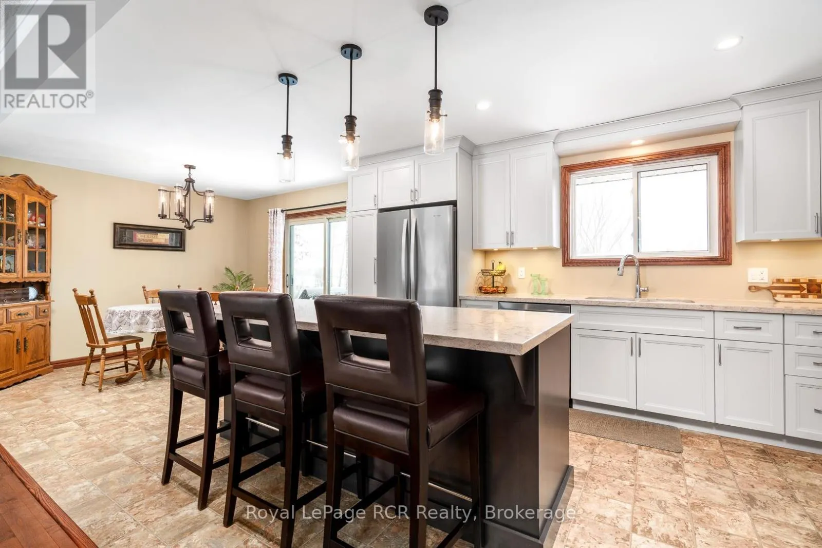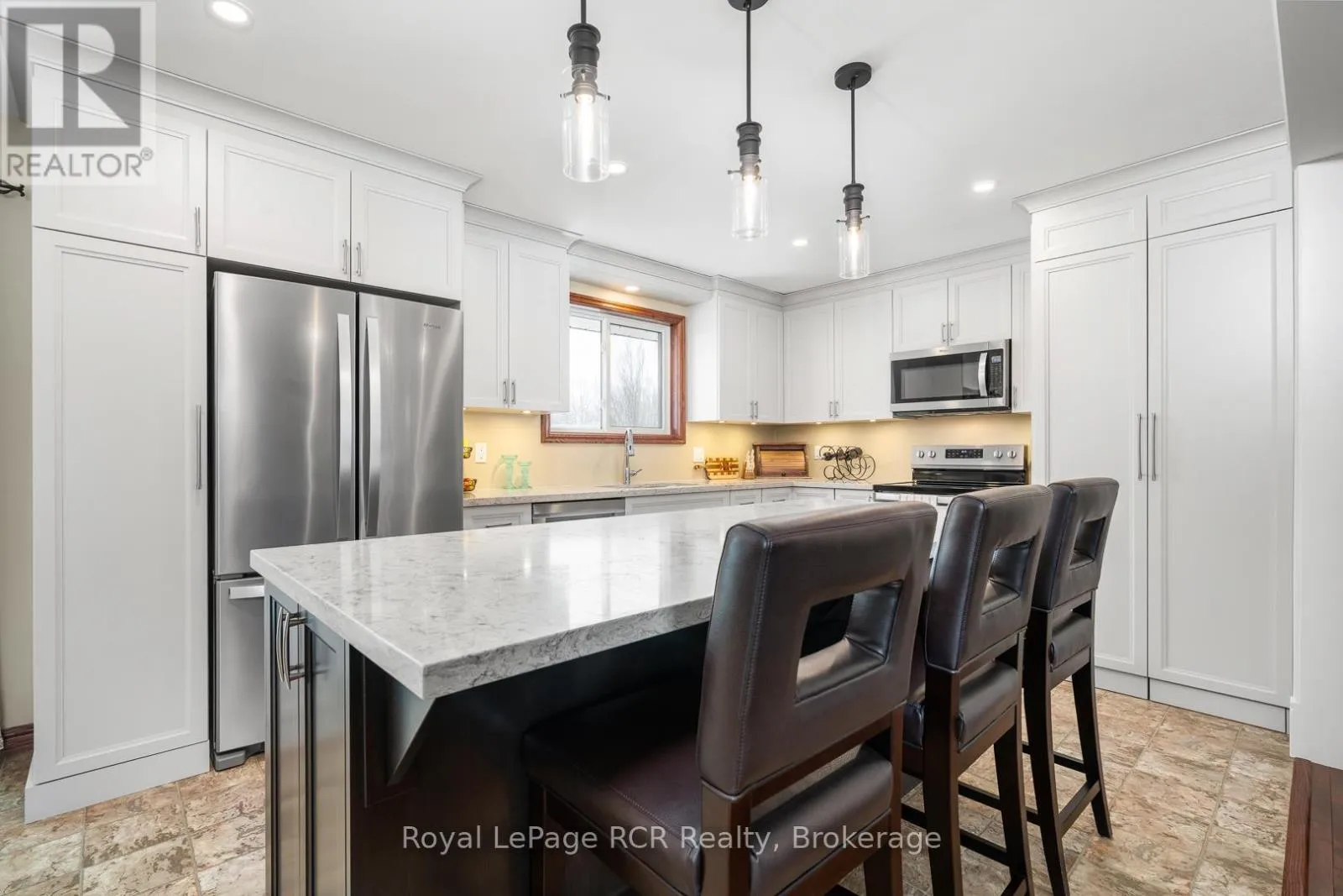 Cross Streets: Victoria St & Helena St. ** Directions: 1003 Victoria St., Ayton. Custom built by Domm Construction in 1987 and proudly maintained by the original owners, this beautifully cared-for brick bungalow sits on a large lot on a quiet street in the welcoming community of Ayton. Set on a gentle hill, the home captures lovely countryside views while being within walking distance to local amenities.The bright main floor begins with a welcoming front entry and closet and leads into a stunning custom Hanover kitchen built in 2019. Designed with both style and function in mind, the kitchen features quartz countertops, a large island, convenient stackable laundry, and a full appliance package. The dining area offers sliding doors to the back deck-perfect for enjoying the peaceful surroundings-while the living room features a large picture window that fills the space with natural light.Three comfortable bedrooms with closets, a 4-piece bathroom with a granite counter on a newer vanity, and a hallway linen closet complete the main level.The finished lower level provides excellent additional living space with a large family room featuring a custom brick propane fireplace and bar area-ideal for entertaining or relaxing. This level also includes a 2-piece bathroom, utility room, and direct access to the attached garage with newer garage door. Outside, the spacious lot has mature trees and includes a double-wide driveway and attached garage. Enjoy the benefits of private well and septic with no municipal water or sewer fees. Bonus features: 200 amp service, air exchanger, water softener & hot water tank owned, flexible closing, family room furniture included. Wightman fibre at road, and cable TV available. Located within walking distance to the amenities of Ayton such as Trixies saloon, Ayton Ayto, Canada Post, Ayton Food Mart, Mum's, Normanby Community School, and the scenic bridge overlooking the Ayton Mill Pond, this home offers the perfect blend of small-town living, space, and beautiful views. (id:27476)