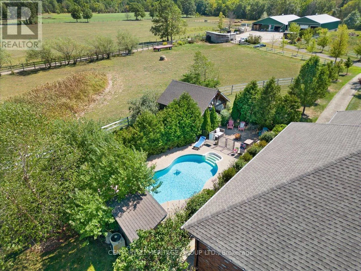 Cross Streets: Concession Road 5. ** Directions: Abingdon Rd. between Concession Road 5 and Bismark Rd. Welcome to a once-in-a-lifetime 40-acre ranch in beautiful West Lincoln, where craftsmanship, comfort, and countryside living come together in perfect harmony. Designed and built by the owner-builder, this sprawling custom bungalow offers the space, quality, and character youve been searching for. Step inside to a grand, open-concept main living area featuring a sun-filled great room with wood-beam ceilings, a natural wood fireplace, and seamless flow between the kitchen, dining, and family spaces, perfect for gathering and entertaining. The smart split-bedroom layout places the private primary retreat with ensuite bath and walk-in closet on one side of the home, while the remaining bedrooms rest on the opposite wing for quiet family comfort. The lower level is fully finished with a complete in-law suite and a separate entrance, ideal for multi-generational families or added income potential. Outside, enjoy a country lifestyle with two impressive barns/workshops, an in-ground pool with cabana, a double-car garage, and abundant open land ready for your business, hobby farm, or simply the joy of wide-open space. Featuring drilled wells, septic, cistern, and hardwood floors throughout, this property blends functionality and beauty at every turn. Only 2530 minutes from Hamilton, yet a world away from the city bustle. Seeing truly is believing, this remarkable ranch must be experienced in person to appreciate its scope, serenity, and possibilities. (id:27476)