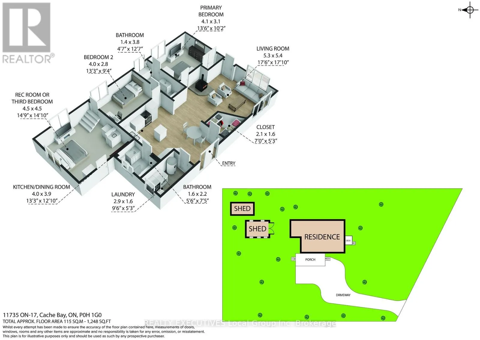 Cross Streets: Hwy 17. ** Directions: Take Hwy 17 W from North Bay approx 40 kms. See signage on property. Welcome to 11735 Highway 17, a cozy two-bedroom, two-bathroom bungalow in the friendly community of Cache Bay. This single-story home offers the perfect mix of comfort and laid-back country vibes. As you roll down the driveway, you'll notice the welcoming front door leading into a comfortable living room, plus a convenient side entrance off the deck that takes you right into the eat-in kitchen. There's ample storage with a large closet and a handy laundry room flanking the deck entrance. The home features two bedrooms sharing a bathroom, with an extra bathroom attached to the kitchen area. Need extra space? There's a flexible room that can serve as a rec room or a third bedroom, complete with its own entry to the backyard. Enjoy cozy evenings by the pellet stove in the living room, a perfect spot for relaxation. Outside, you'll find a spacious yard with practical storage sheds, perfect for all your outdoor gear or gardening tools. Cache Bay is a welcoming community offering natural beauty and a peaceful lifestyle. Whether you're looking for a starter home, downsizing, or seeking a retreat, this charming bungalow could be just what you need. (id:27476)