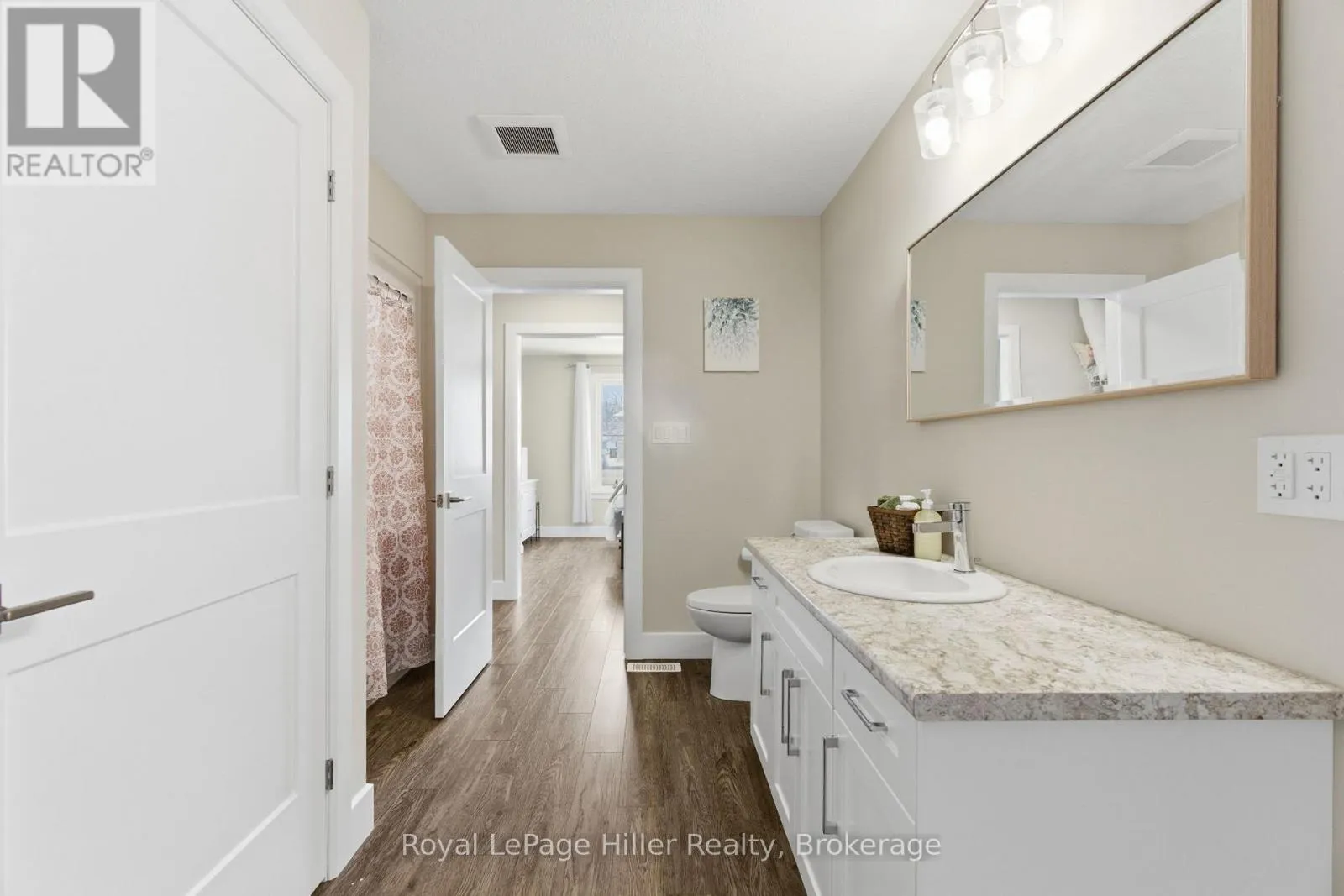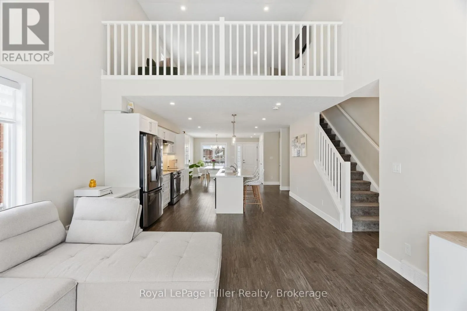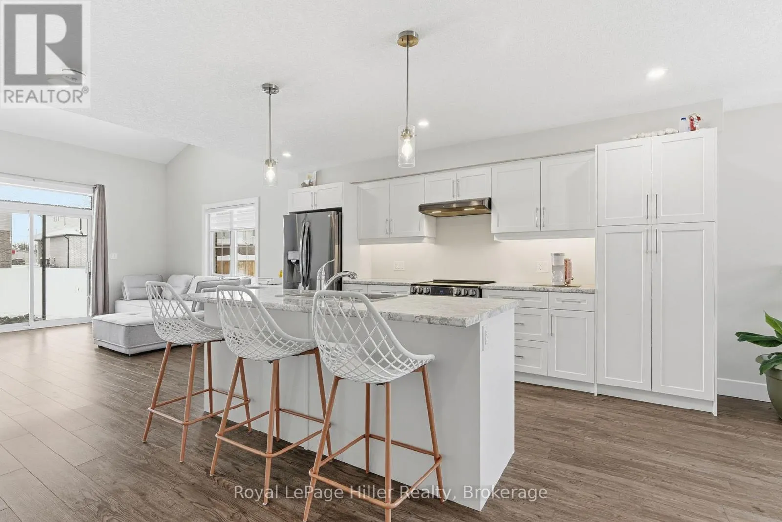 Cross Streets: Henry & St. George. ** Directions: From Highway 8, turn north onto St. George Street. Continue to Henry Street and turn west. Turn north onto Thames Avenue. The subject property is located on the east side. End-unit BUNGALOFT townhome offering an exceptional combination of natural light, thoughtful design, and modern finishes. Positioned as an end unit with desirable southern exposure, this home benefits from additional side windows that flood the interior with sunlight throughout the day. The main floor features a bright, open-concept layout with a spacious living area highlighted by an open-to-above ceiling, creating an airy and inviting atmosphere. The kitchen is designed for both function and entertaining, complete with a central island and bar seating, flowing seamlessly into the dining and living spaces. A generous front entry includes a large closet for everyday convenience. The primary bedroom is located on the main floor and offers a comfortable retreat, complete with a walk-through closet leading to the main-floor bathroom and conveniently located laundry. The loft level above overlooks the living area below and provides a flexible open space filled with natural light, along with a large second bedroom featuring a walk-in closet, a full four-piece bathroom, and additional linen storage. The fully finished basement significantly expands the living space, offering a large recreation room with excellent versatility, a third bedroom with egress window and closet, and an additional four-piece bathroom-ideal for guests, extended family, or a home office setup. Built in 2023, the home remains in like-new condition, with modern mechanicals, electrical, plumbing, and appliances throughout. An attached one-car garage is complemented by two additional outdoor parking spaces on the concrete driveway. Ideally situated close to medical clinics, pharmacy, dental offices, schools, and convenient shopping and banking, this property presents a fantastic opportunity for downsizers, professionals, or families seeking main-floor living with space to grow, all in a low-maintenance townhome (freehold) setting. (id:27476)