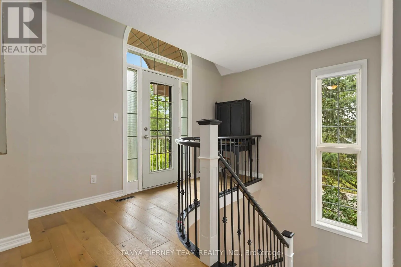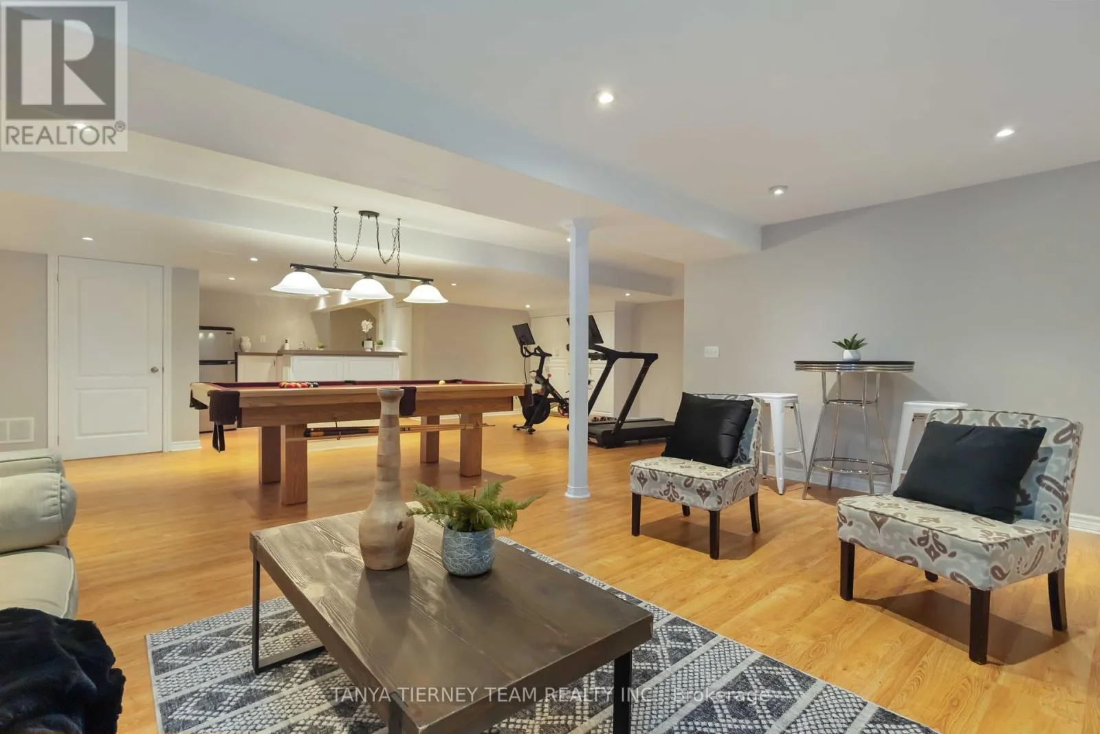 Winchester & Ashburn Rd 4 bedroom Melody built family home nestled on a mature corner lot with double detached garage & private backyard oasis with 2 custom patios! Inviting front porch leads you through to the open concept main floor plan with gorgeous hardwood floors throughout both levels, pot lighting, california shutters & elegant living/dining room ready for entertaining! Stunning kitchen boasting quartz counters & backsplash, breakfast bar, pantry & stainless steel appliances. The breakfast area offers wainscotting & garden door entry to the backyard space. Family room with cozy gas fireplace & built-in shelves. Convenient main floor laundry with separate side door, ceramic floors & Electrolux washer & dryer. Upstairs offers a den area with walk-out to a private balcony overlooking the front gardens. Primary retreat with barn door entry to the walk-in closet with organizers & 4pc ensuite featuring a relaxing soaker tub. Room to grow in the fully finished basement complete with large rec room, awesome wet bar, pool table in the games area & ample storage space! Situated in a demand Brooklin community, steps to schools, parks, rec centre, new Longo's plaza, transits & easy 407/412 access for commuters! (id:27476)