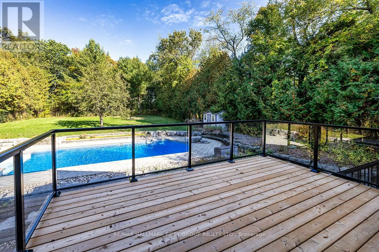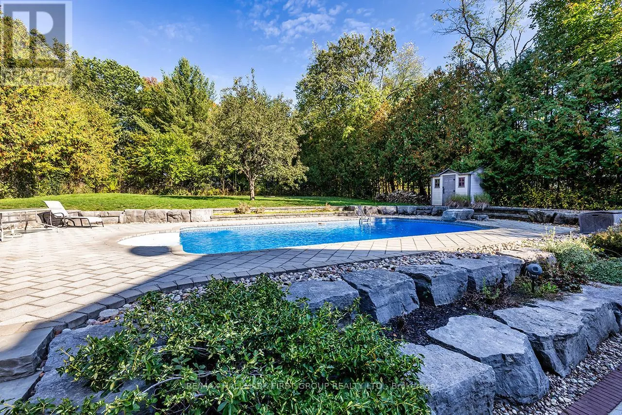 Coronation and Highway 7 Welcome to 15 Shepherd Road, Whitby Macedonian Village. This stunning custom-built bungalow is situated on a premium lot measuring 102.48 ft x 352.51 ft, backing onto the tranquil Heber Down Conservation Area, with exceptional craftsmanship and modern comfort. This luxury bungalow home features four spacious bedrooms on the main floor, each with an en-suite bathroom and a walk-in closet. The house also boasts 10-foot ceilings, a waffle ceiling in the kitchen and dining area, California shutters, and an elegant great room with a soaring 16-foot cathedral ceiling and a gas fireplace. New engineered hardwood flooring throughout the main floor, freshly painted throughout (2025), a brand-new kitchen with stainless steel appliances, a new water softener, an iron remover and crown moulding with large baseboards. It also features a main office, laundry room, central vacuum system, and garage with an attached workshop, offering versatile possibilities ideal for a golf simulator, movie room, or creative studio space. and 60 Amp electrical service. The primary bedroom features a custom ceiling adorned with pot lights, a spacious walk-in dressing room, a luxurious 5-piece en-suite, and breathtaking views of the in-ground pool and conservation area. The finished walk-out basement, complete with an additional three bedrooms, a gym, two large recreation rooms, a rough-in kitchen, a gas fireplace, and potlights, makes it ideal for multi-generational living or entertaining. The primary suite serves as a true retreat, offering flexibility for extended family or rental potential. Outdoors, the inground pool, complete with a new liner, heater, and UV ray system (Aug 2025), interlocking landing, and stairs, creates a backyard oasis. With its brick, stone, and stucco exterior, the home exudes timeless curb appeal. No rental items. This rare gem in Macedonian Village provides unmatched luxury, functionality, and lifestyle. (id:27476)